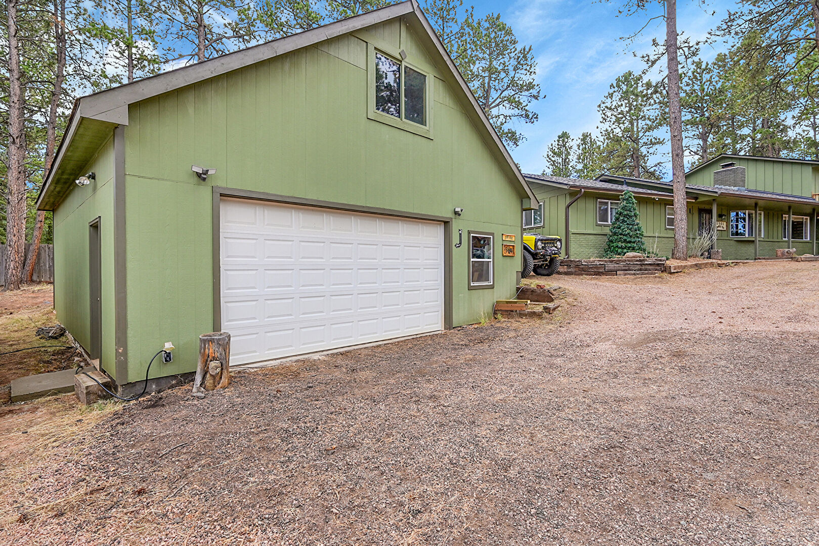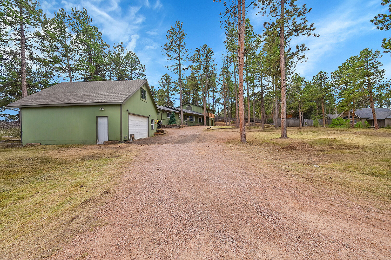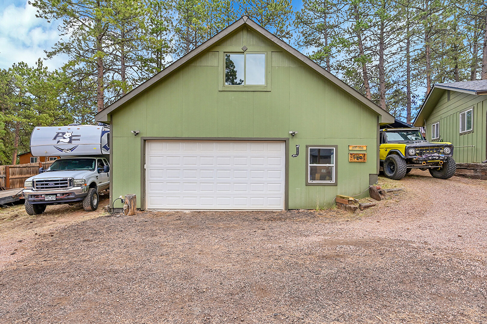 Concrete Foundation, Detached Garage, Downspout, Driveway, Garage, Vertical Siding, Fence, Gutters
