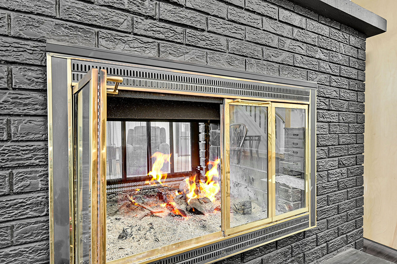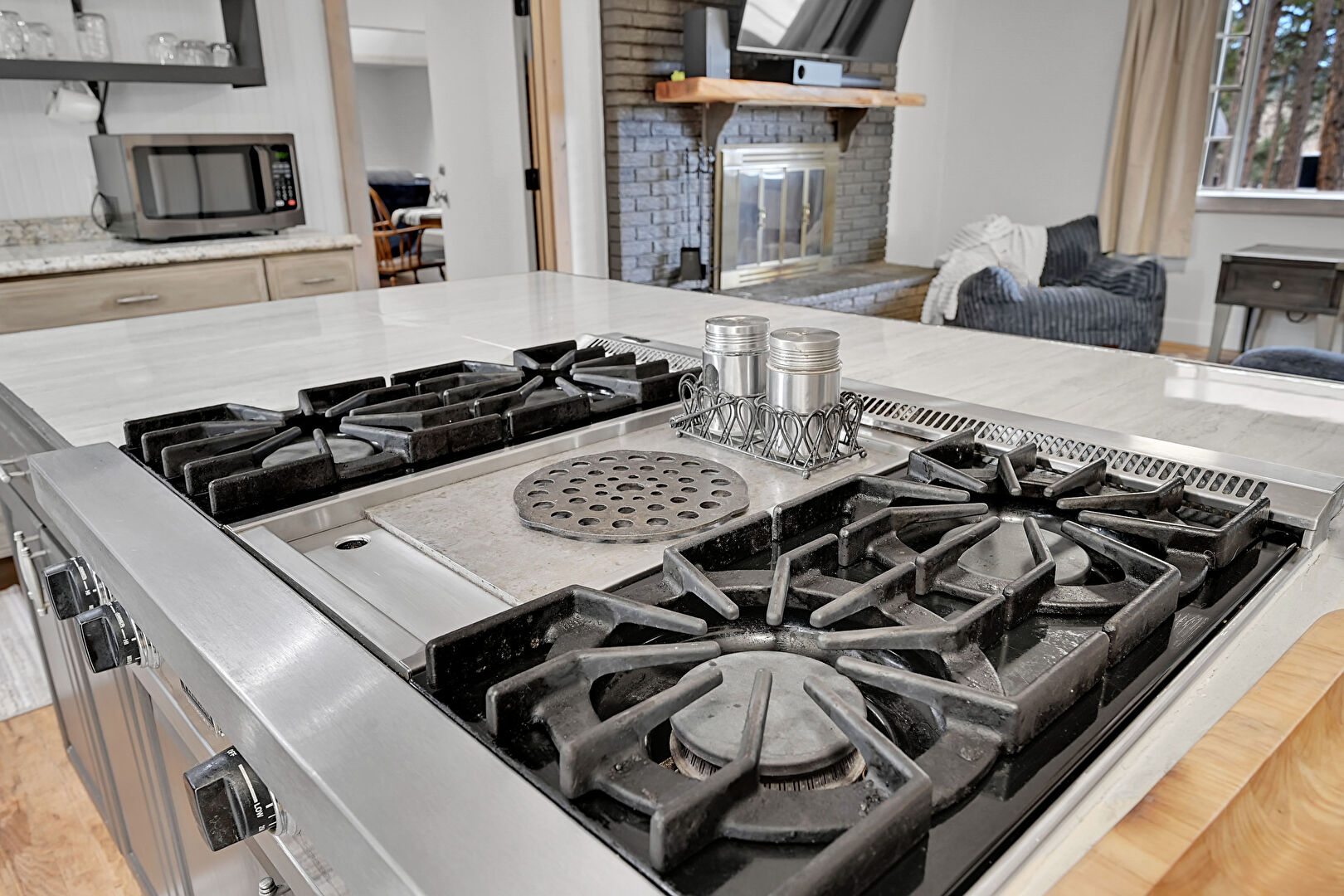 Arched Cabinets, Drywall, Fire Pit, Fireplace, Gray Cabinets, Raised Cabinets, Shaker Cabinets, Stone Countertops, Wood Finish Floor, Open Shelves, Stone Countertops, Stone Siding
