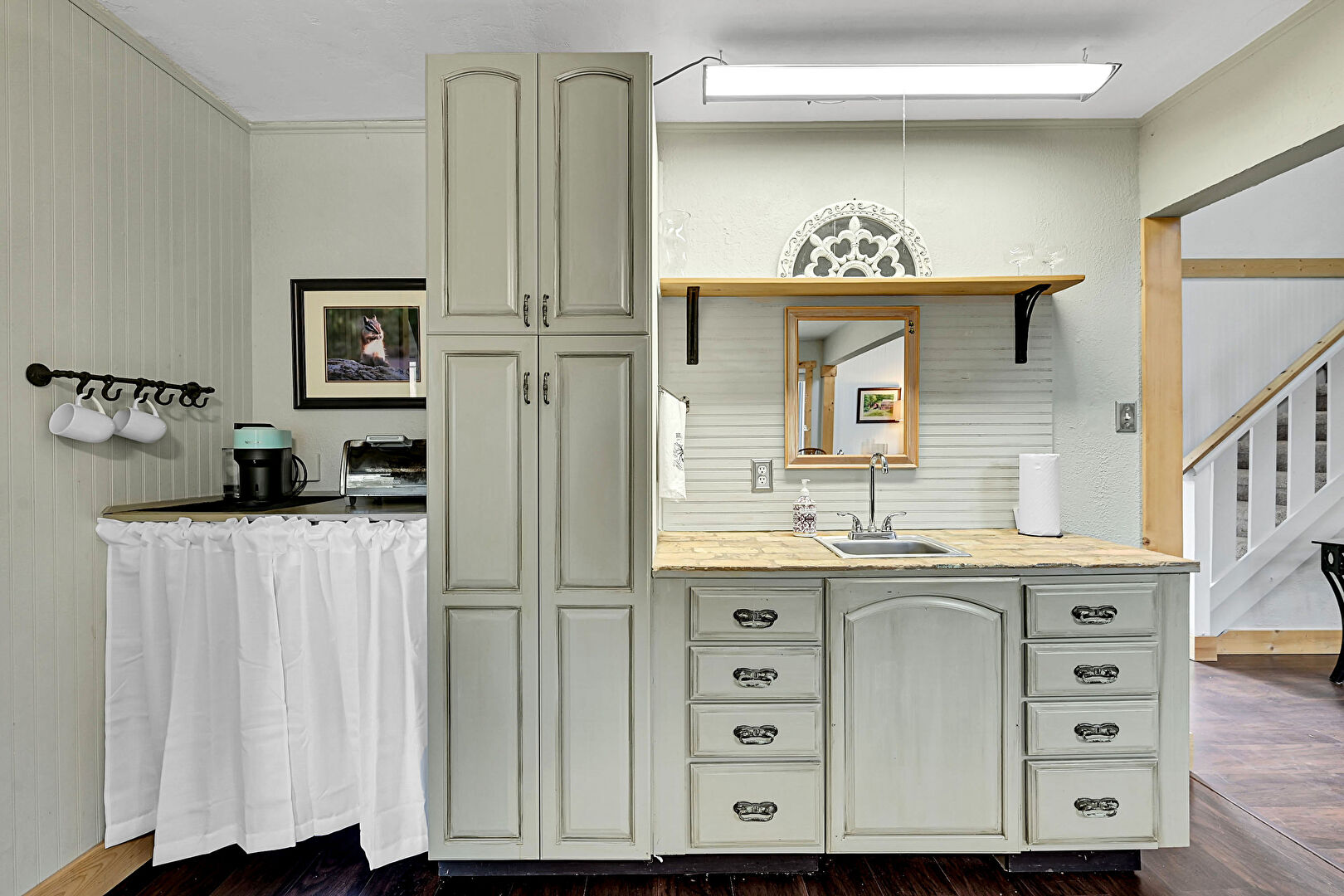 Baseboards Wall, Open Shelves, Raised Cabinets, Stairs, Wood Finish Floor, Wood Wall