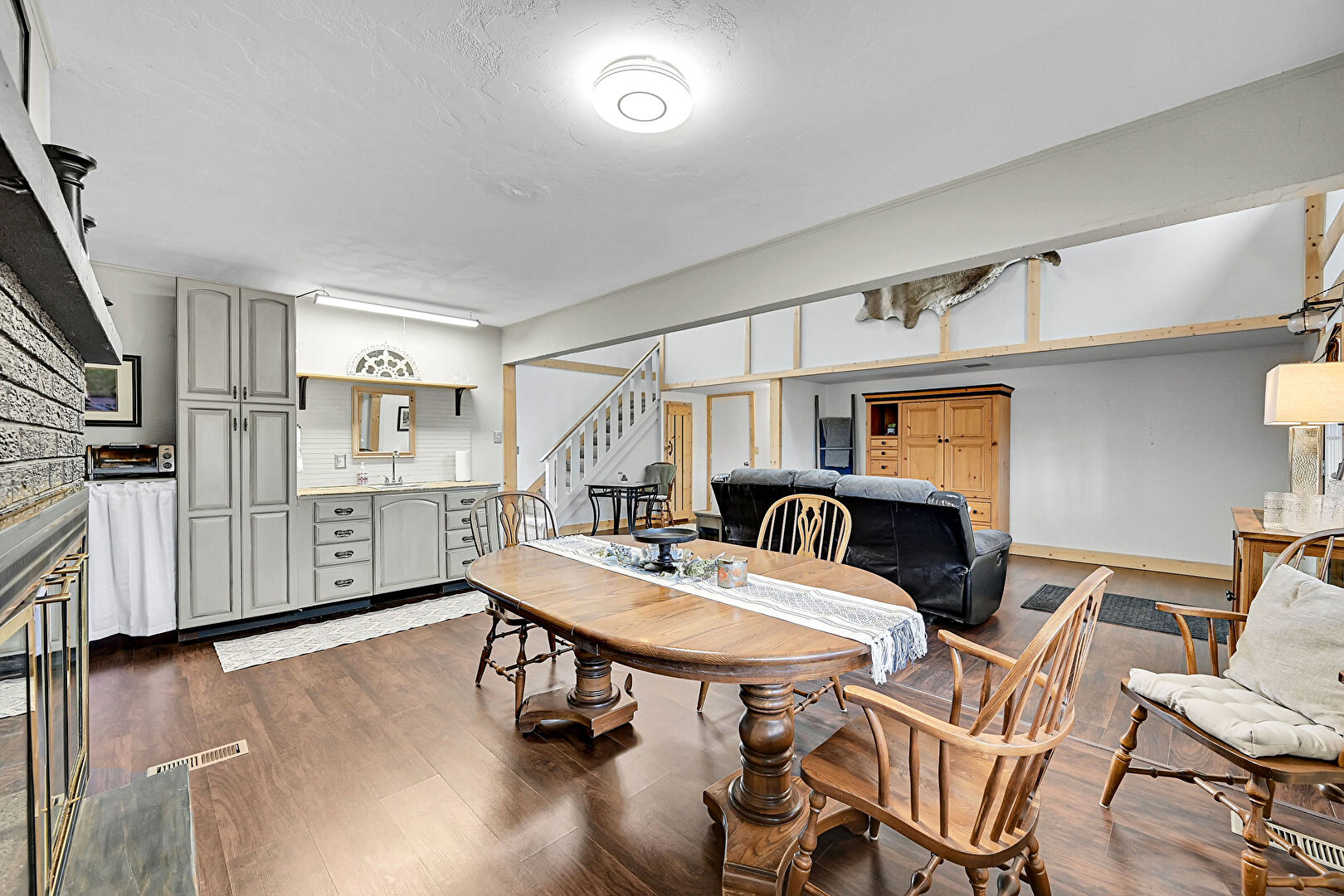 Baseboards Wall, Drywall, Fireplace, Natural Light, Textured Ceiling, Toaster, Vent, Wood Finish Floor, Stairs, Wood Finish Floor