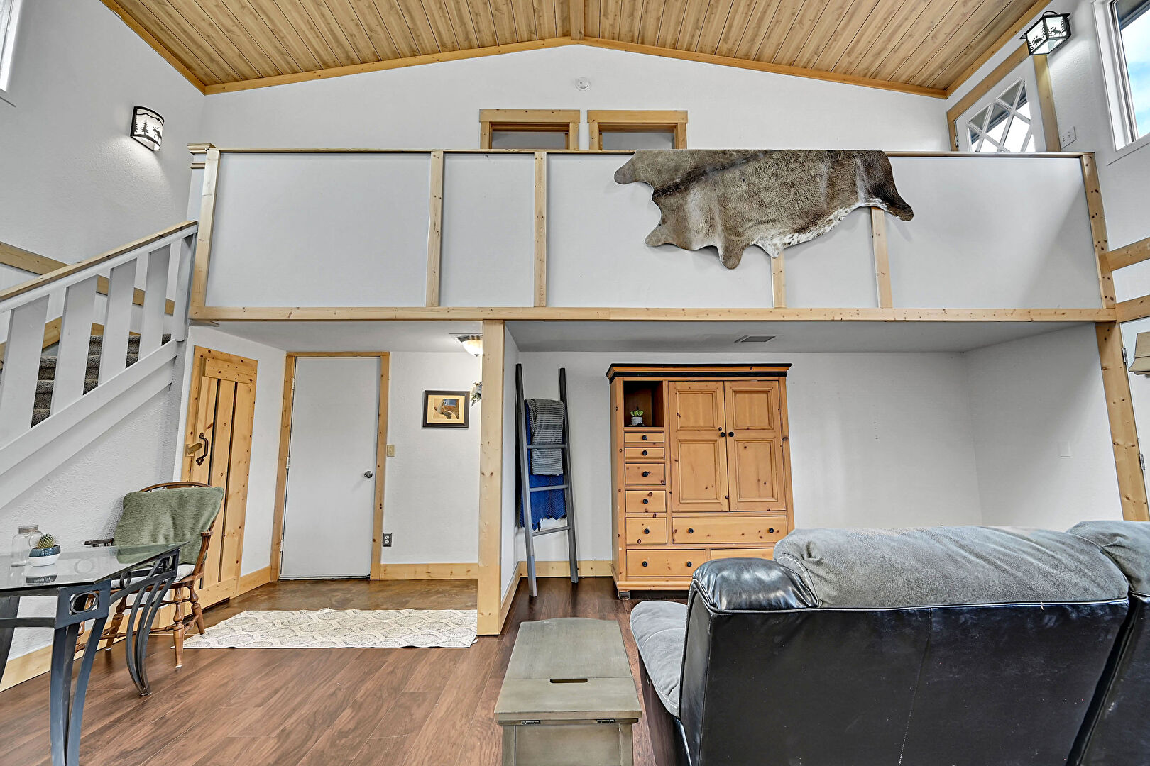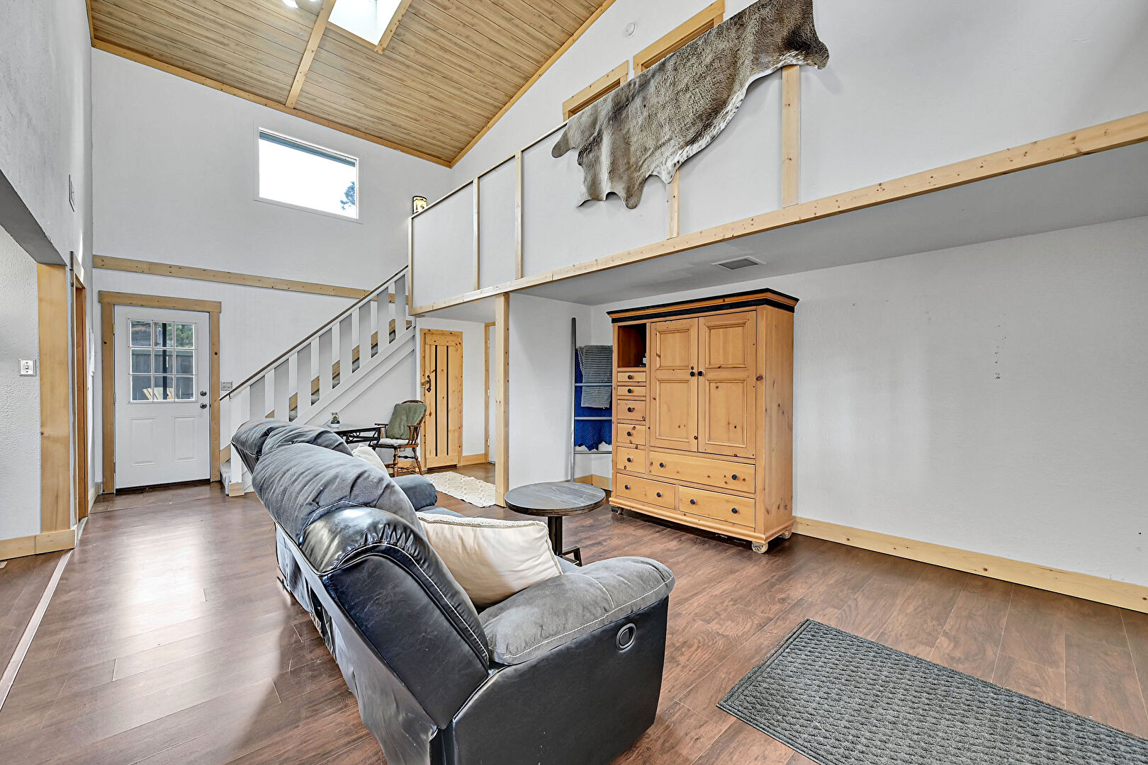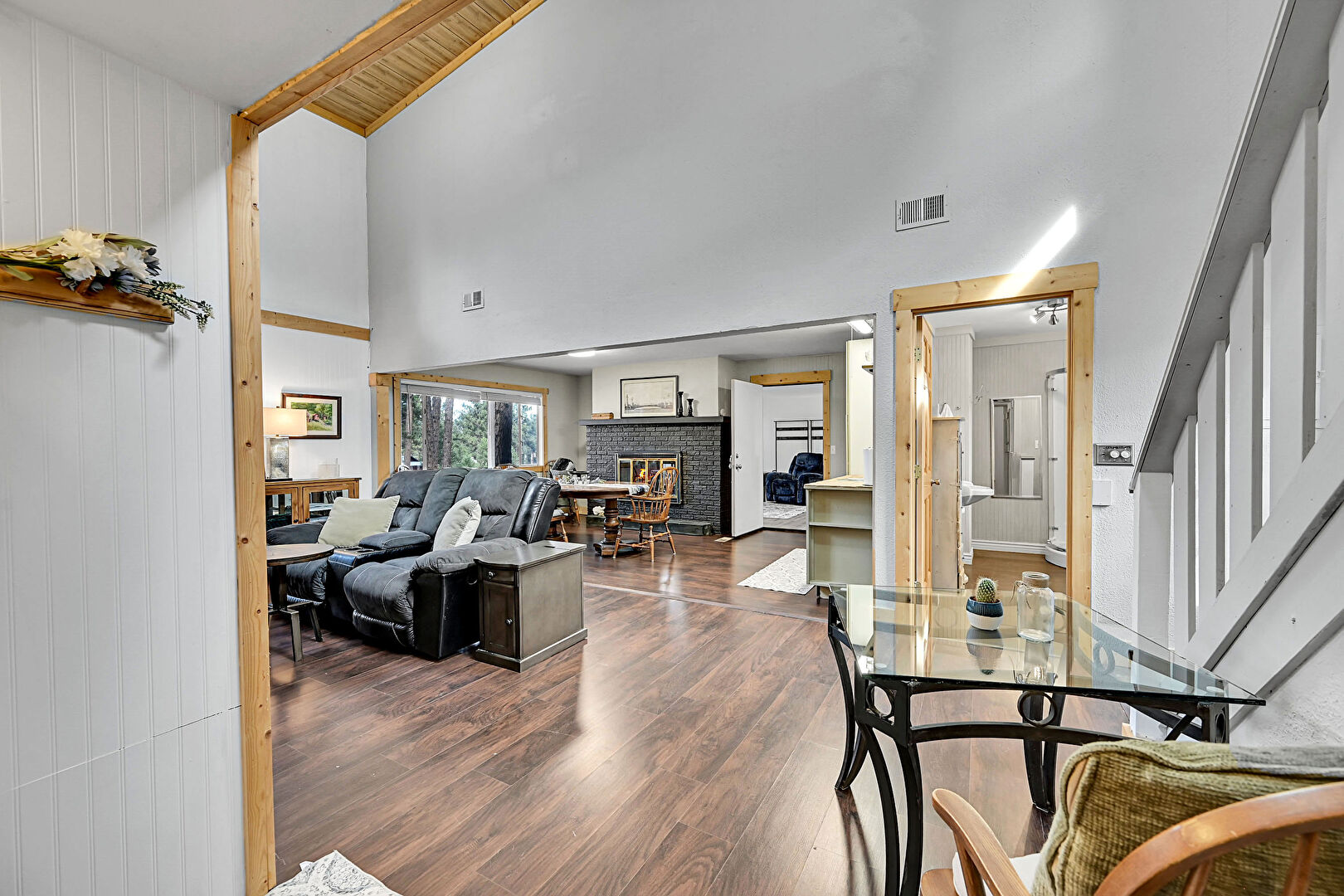 Baseboard Radiator, Baseboards Wall, Cathedral Ceiling, Crown Molding, Drywall, Fireplace, High Ceiling, L Shaped Kitchen, Natural Light, Recessed Lighting, Skylight, Stairs, Vaulted Ceiling, Vent, Wood Ceiling, Wood Finish Floor, Natural Light, Vaulted Ceiling, Wood Ceiling, Wood Finish Floor, Wood Wall