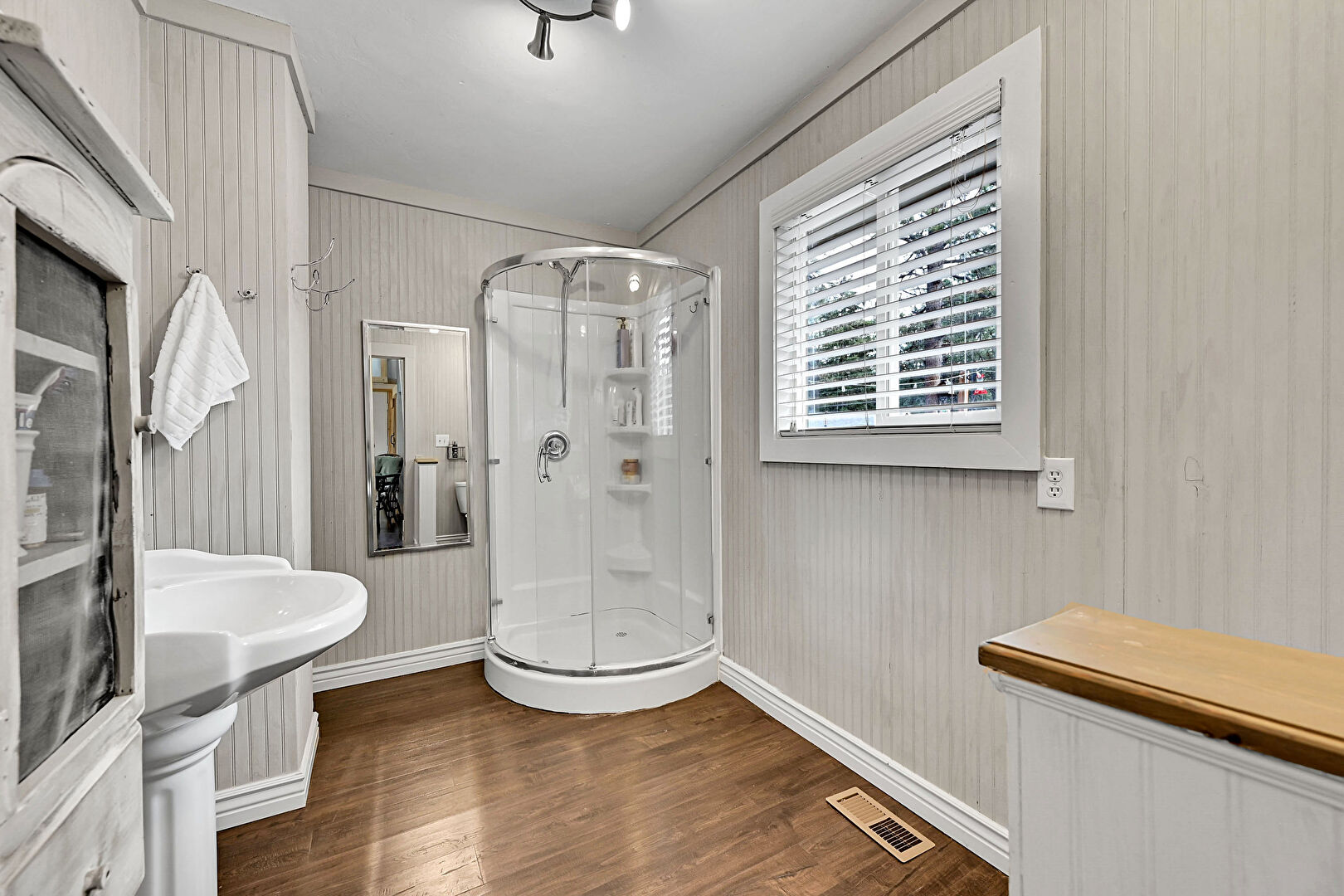 Baseboards Wall, Full Bathroom, Natural Light, Textured Wall, Vent, Wood Finish Floor, Vanity, Wood Wall