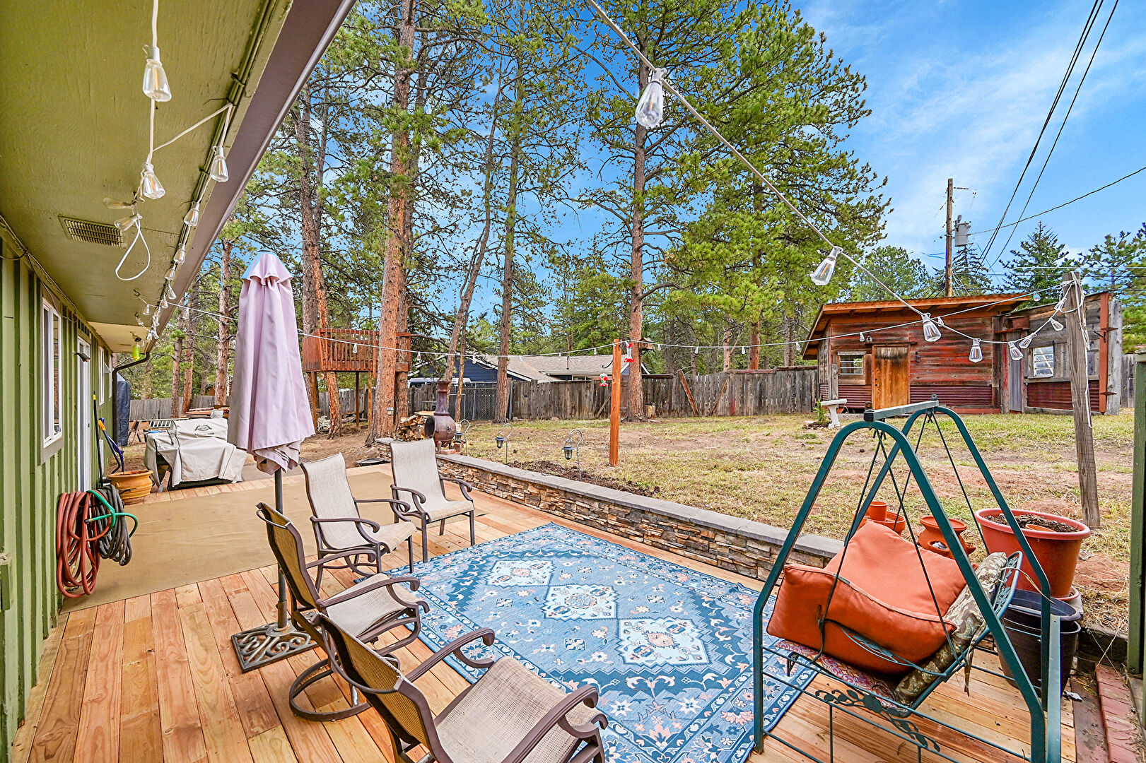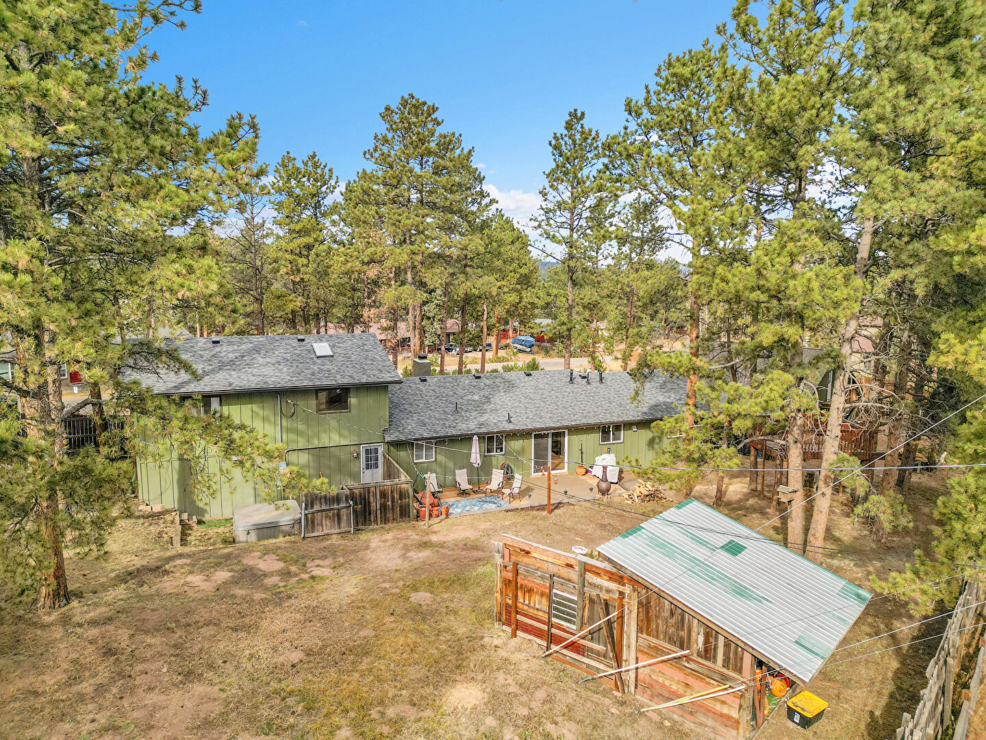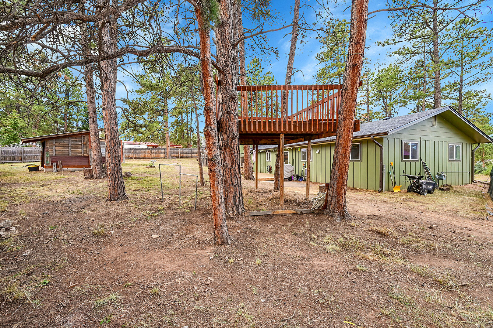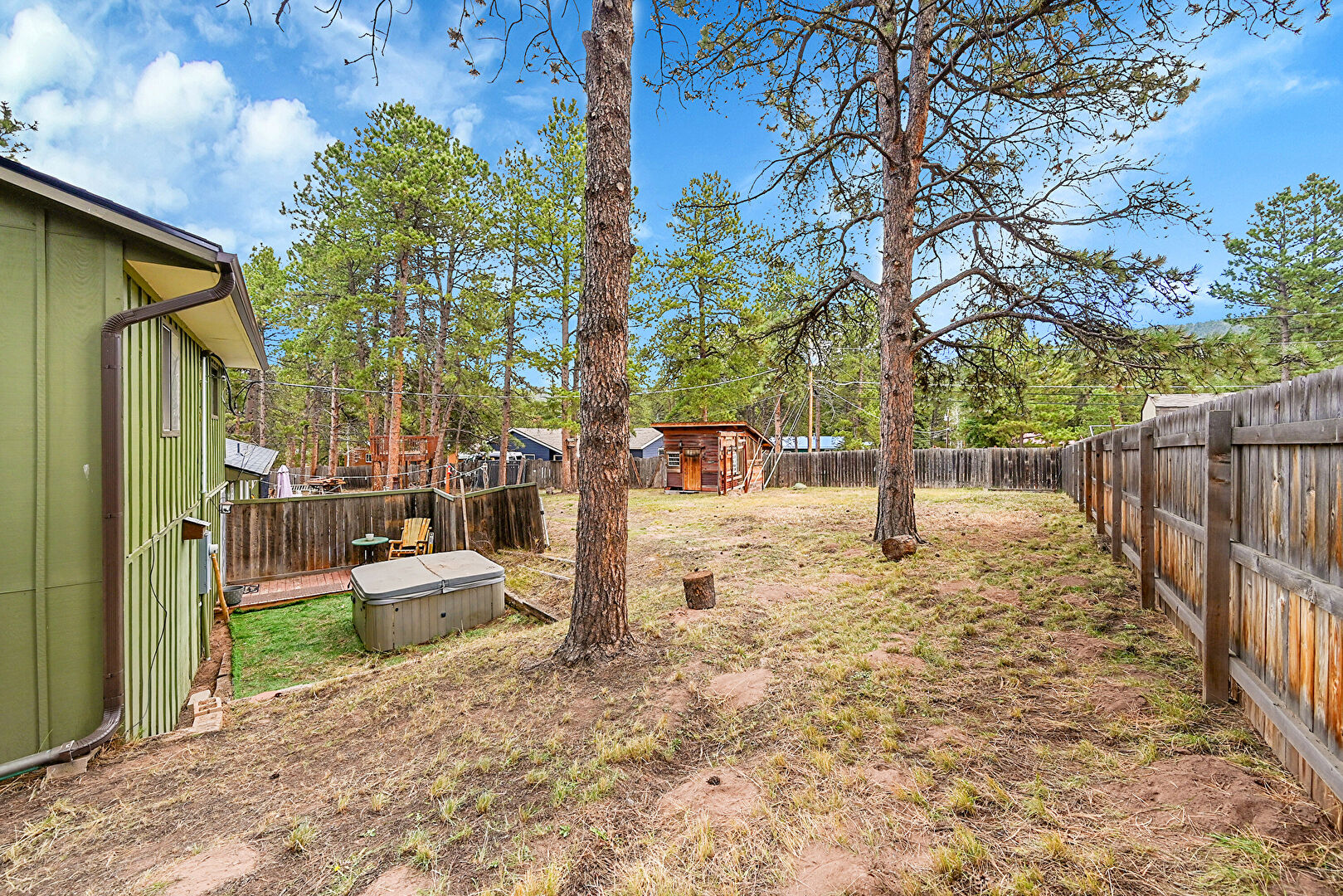 Deck, Downspout, Fence, Hot Tub, Lawn, Outdoor Structure, Patio, Shingle Roof, Vertical Siding, Fence, Lawn, Outdoor Structure, Shed, Stairs