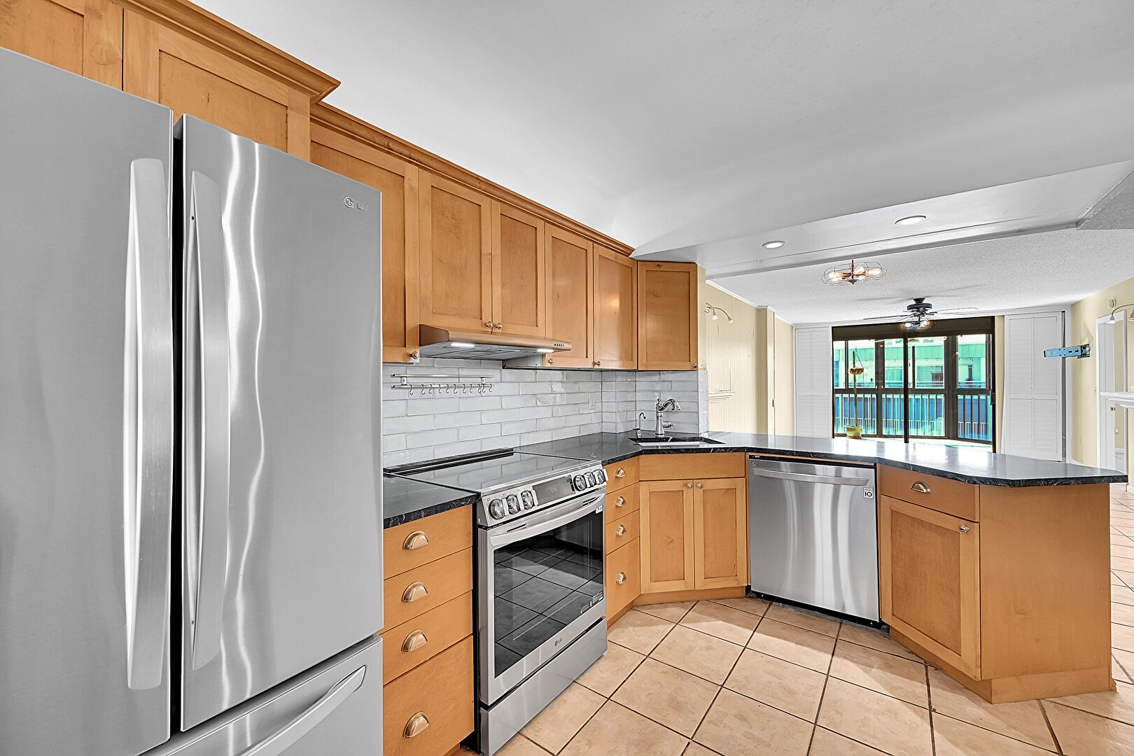 Baseboards Wall,  Ceiling Fan,  Crown Molding Cabinets,  Drywall,  Floor Ceiling Windows,  Kitchen Peninsula,  Medium Brown Cabinets,  Natural Light,  Opens To Living Area,  Pendent Fire Sprinkler,  Pot Filler,  Recessed Lighting,  Shaker Cabinets,  Stone Countertops,  Textured Ceiling,  Tile Floor,  U Shaped Kitchen,  Vent, Ceiling Fan, Kitchen Peninsula, Natural Light, Recessed Lighting, Tile Floor