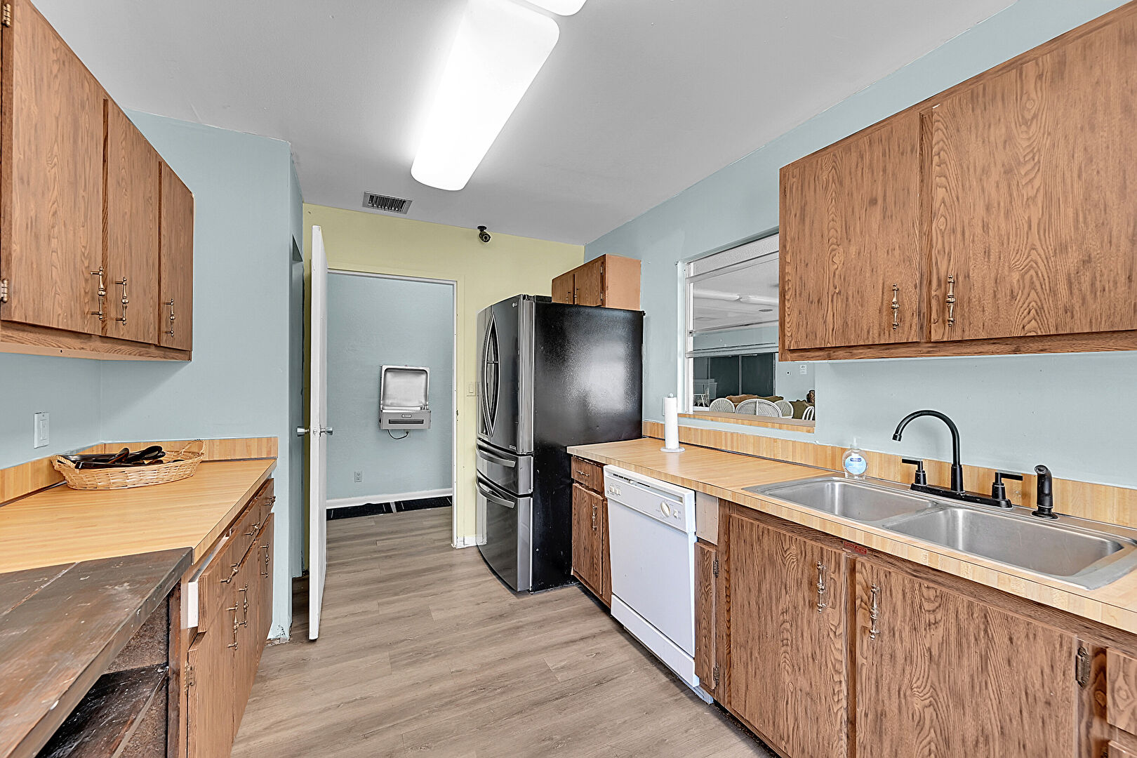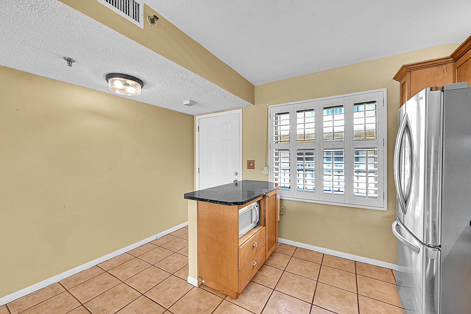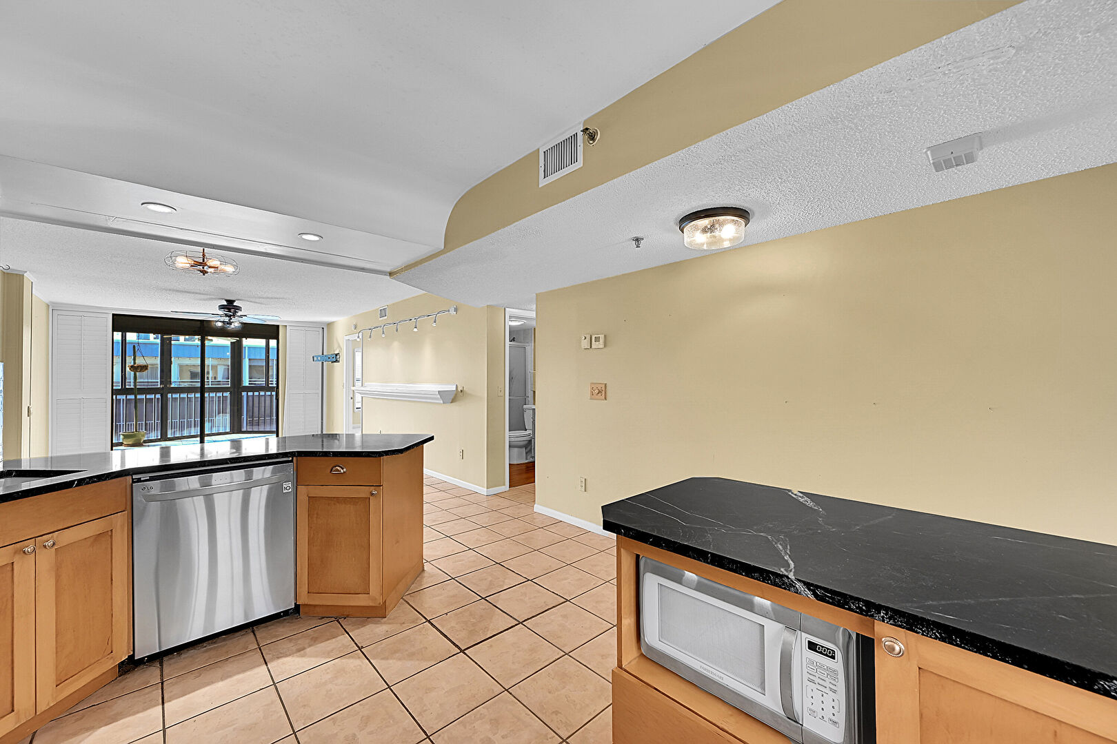 Apartment Complex View,  Baseboards Wall,  Carpet,  Drywall,  Natural Light,  Patio,  Vent,  Water View,  Wood Finish Floor, Fence, Fountain, Medium Brown Cabinets, Textured Ceiling, Vent, Wood Finish Floor