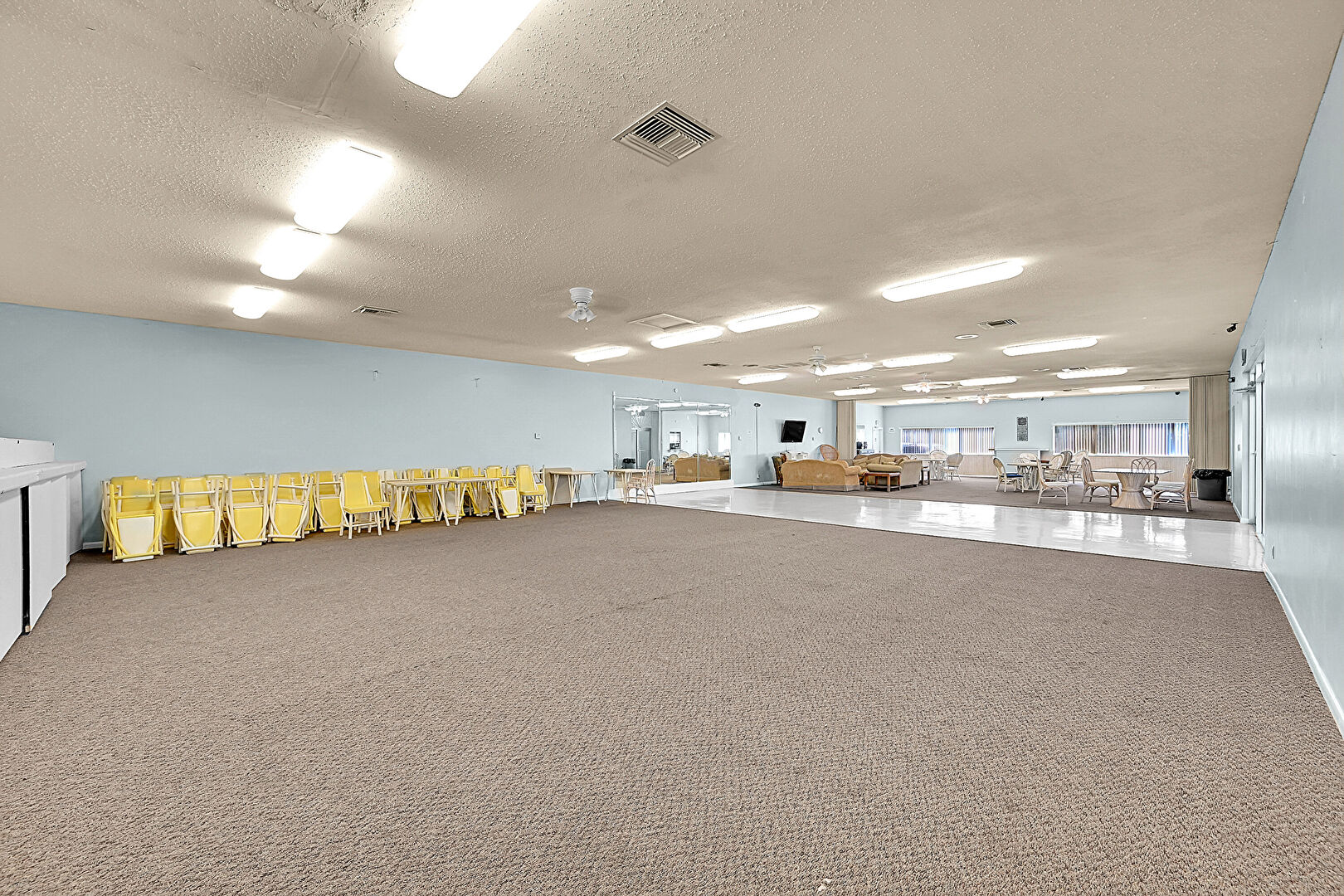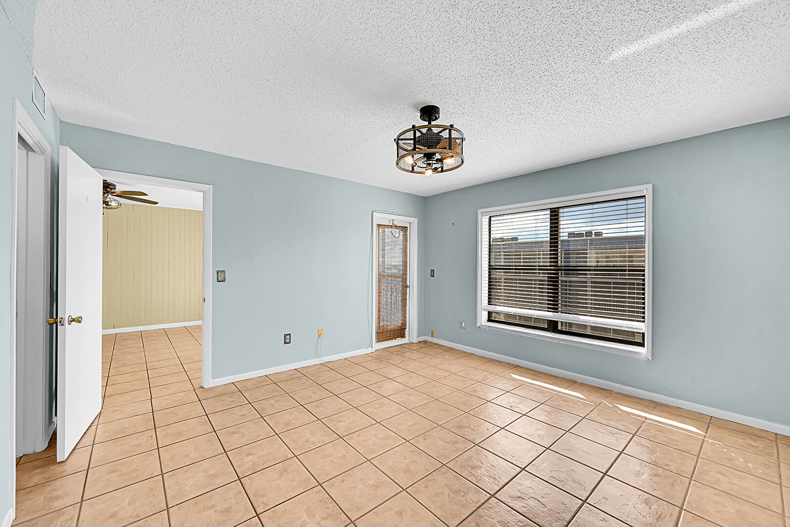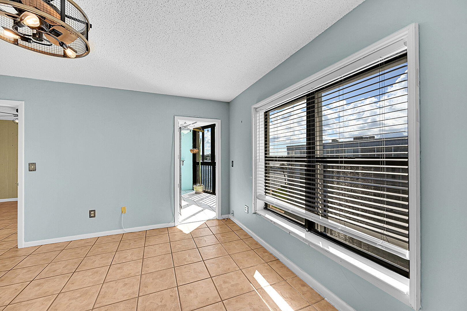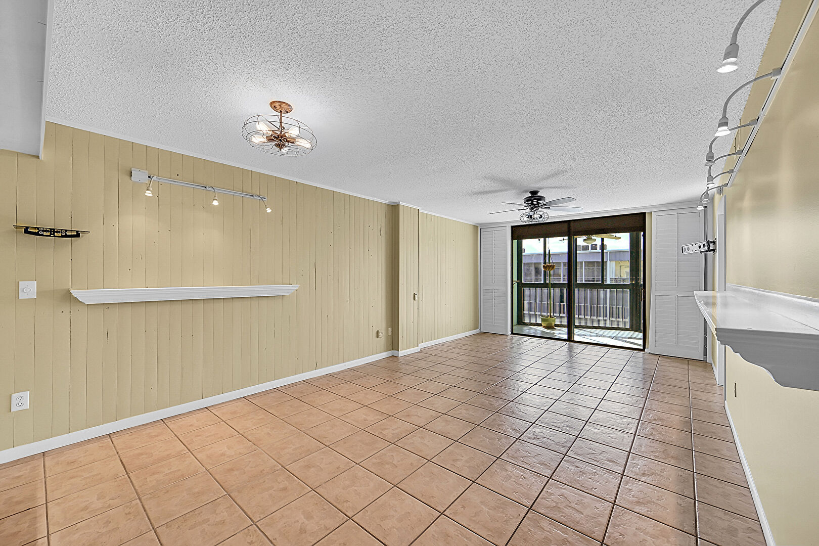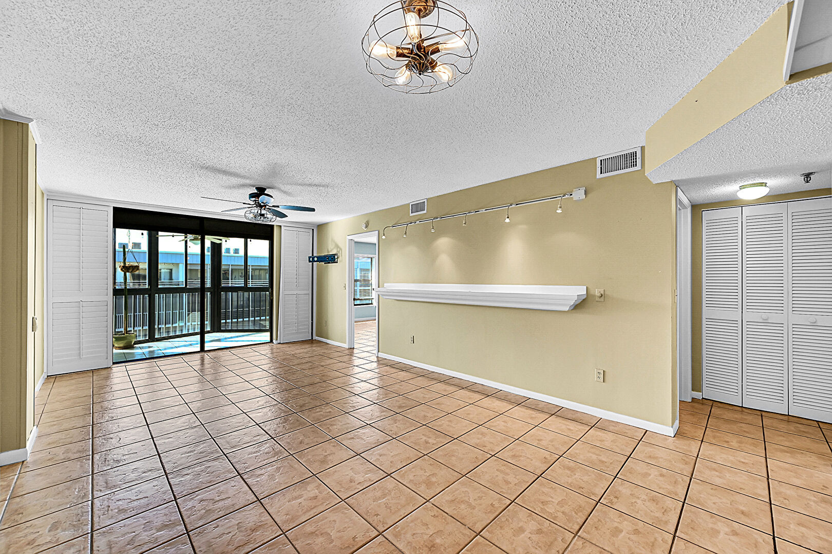 Baseboards Wall,  Ceiling Fan,  Drywall,  Floor Ceiling Windows,  Natural Light,  Notable Chandelier,  Textured Ceiling,  Tile Floor,  Vent,  Wood Wall, Floor Ceiling Windows, Textured Ceiling