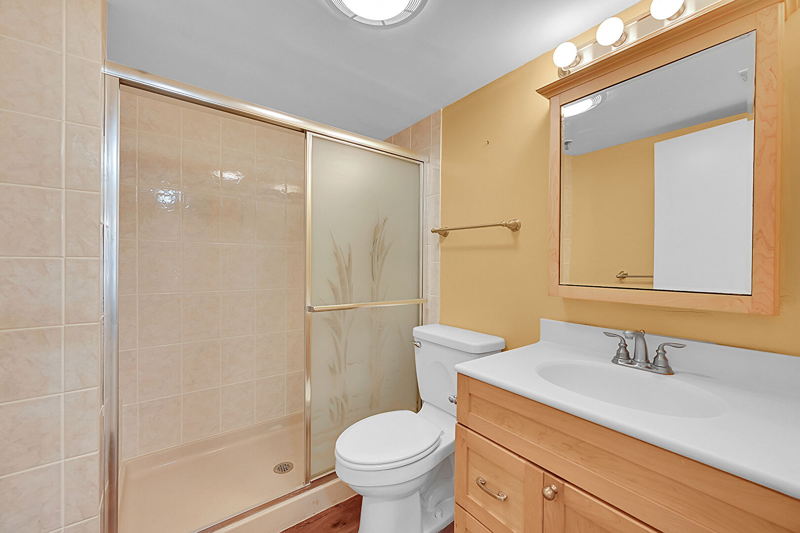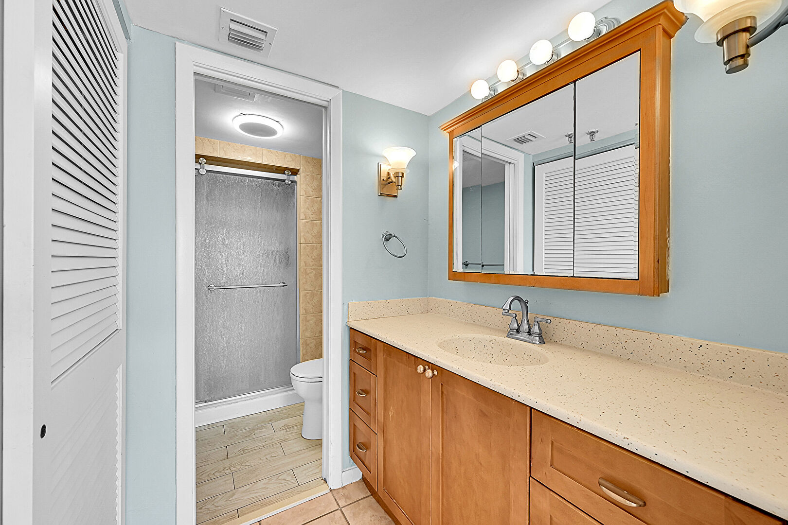 Baseboards Wall,  Drywall,  Full Bathroom,  Tile Floor,  Vanity,  Vent,  Wood Finish Floor, Closet, Drywall