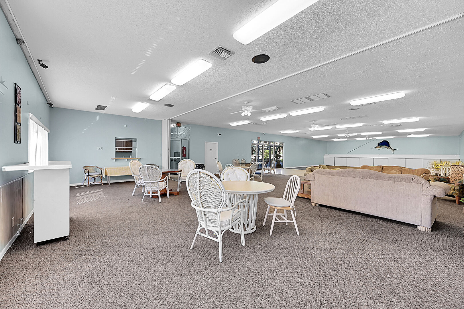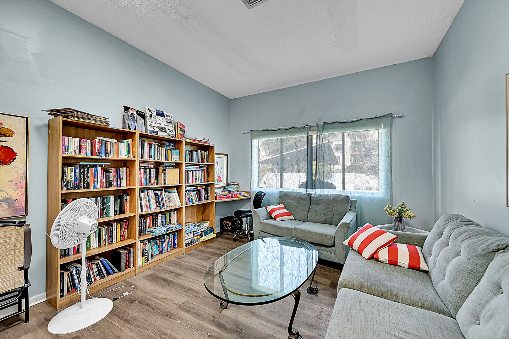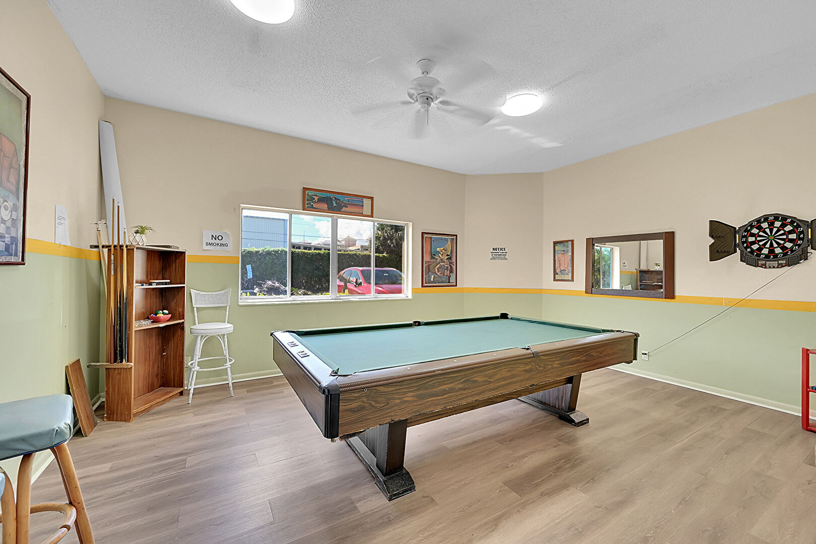 Baseboards Wall,  Billiards,  Drywall,  Natural Light,  Textured Ceiling,  Wood Finish Floor, Ceiling Fan
