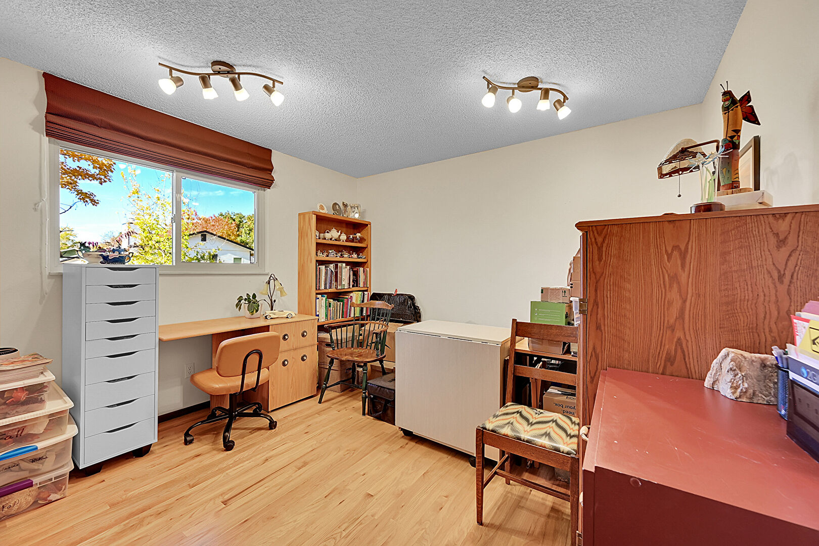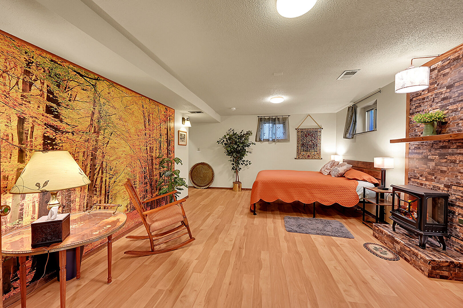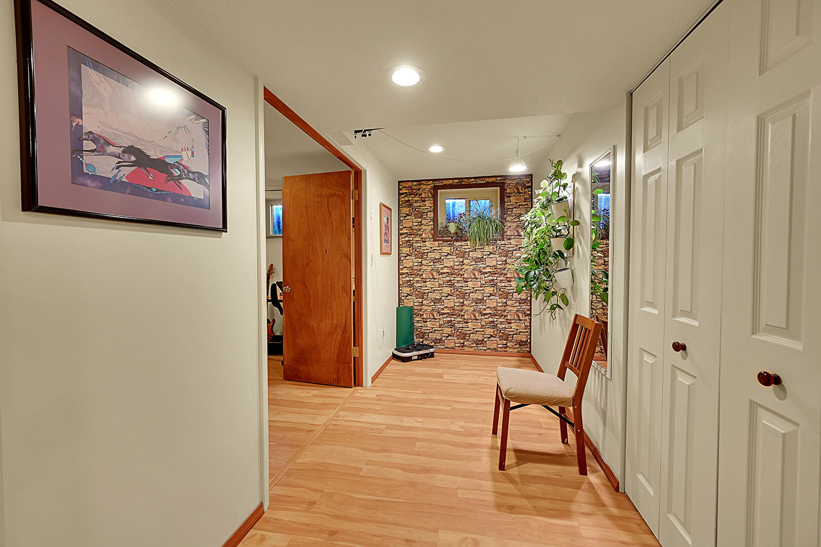 Baseboards Wall, Basement, Drywall, Natural Light, Office Area, Textured Ceiling, Vent, Wood Finish Floor, Wood Stove, Recessed Lighting, Textured Ceiling, Wood Finish Floor