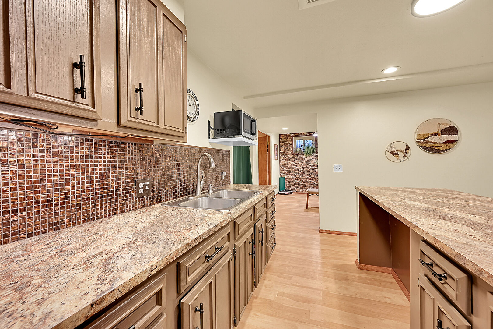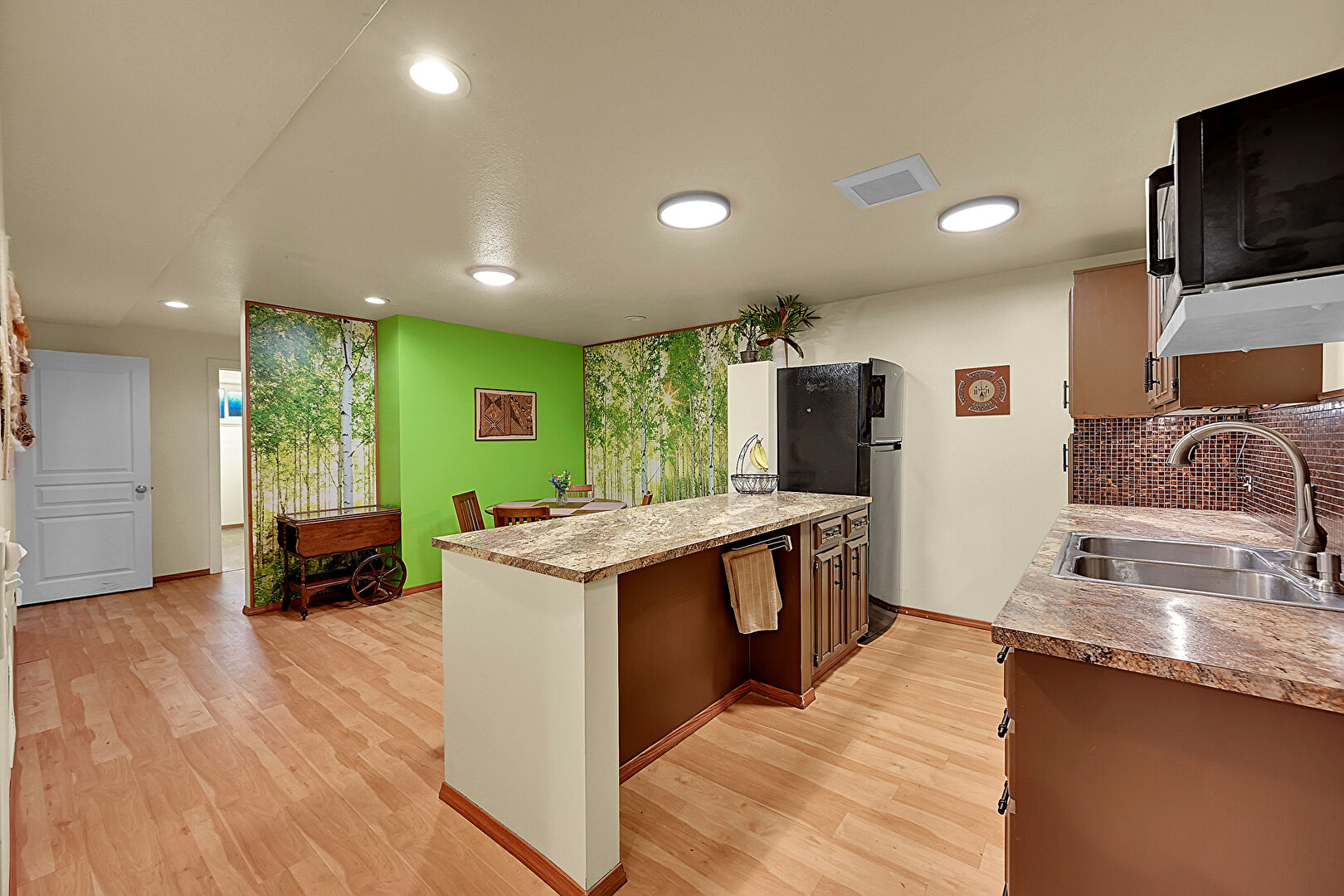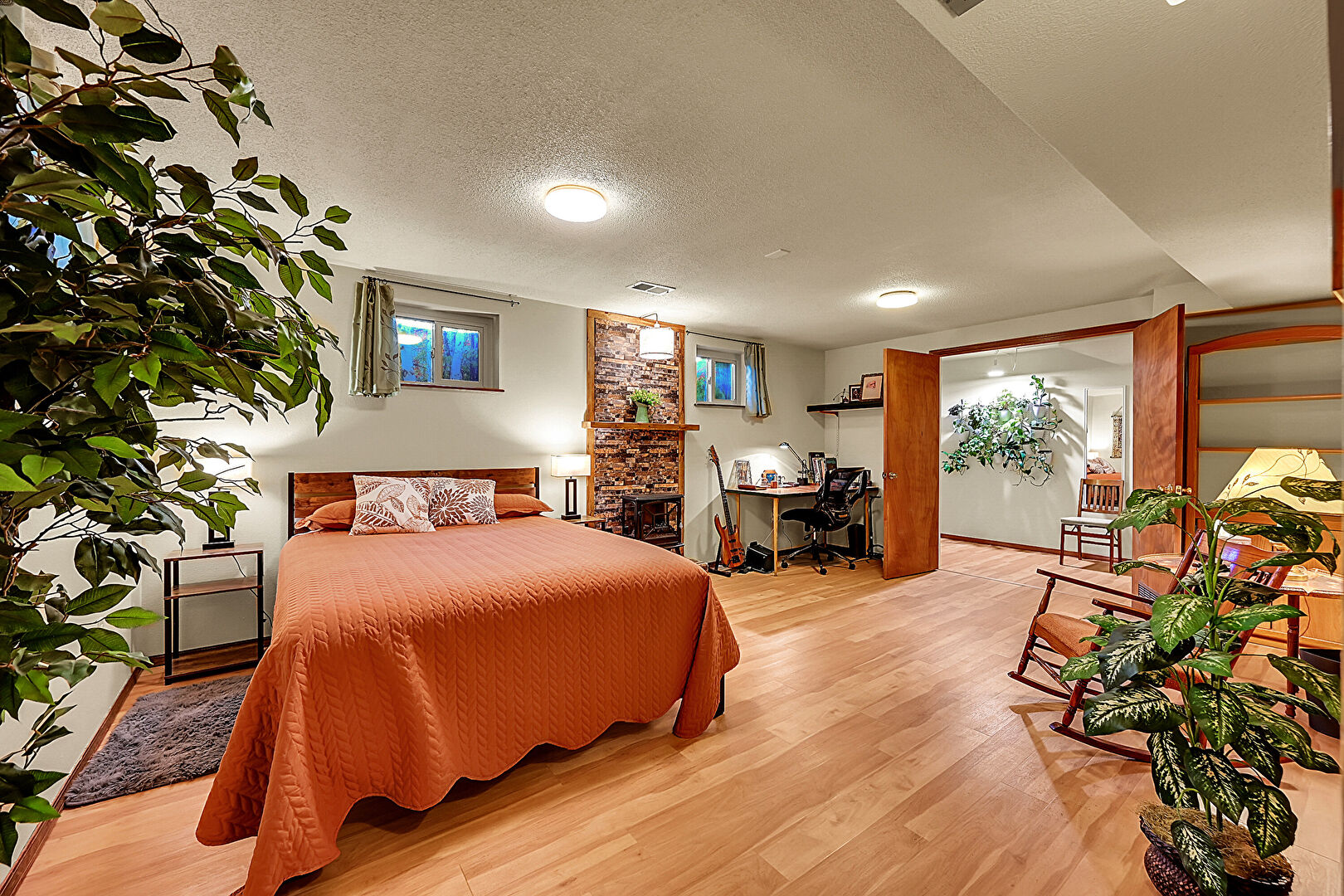 Baseboards Wall, Basement, Drywall, Natural Light, Office Area, Textured Ceiling, Vent, Wood Finish Floor, Wood Stove, Recessed Lighting, Textured Ceiling, Wood Finish Floor