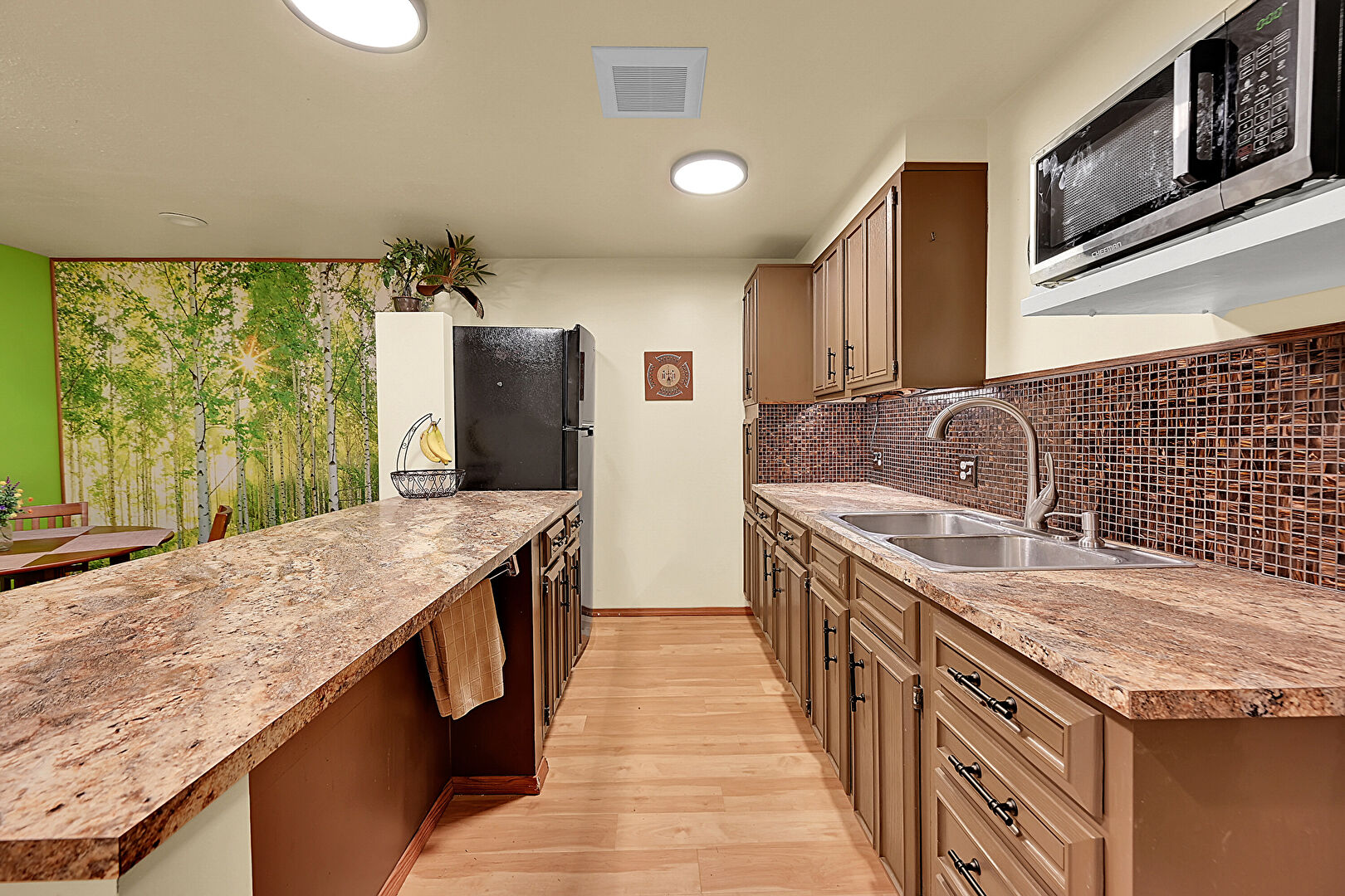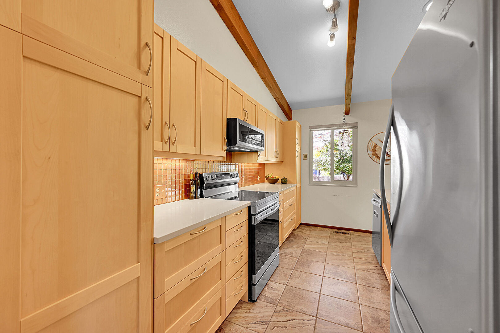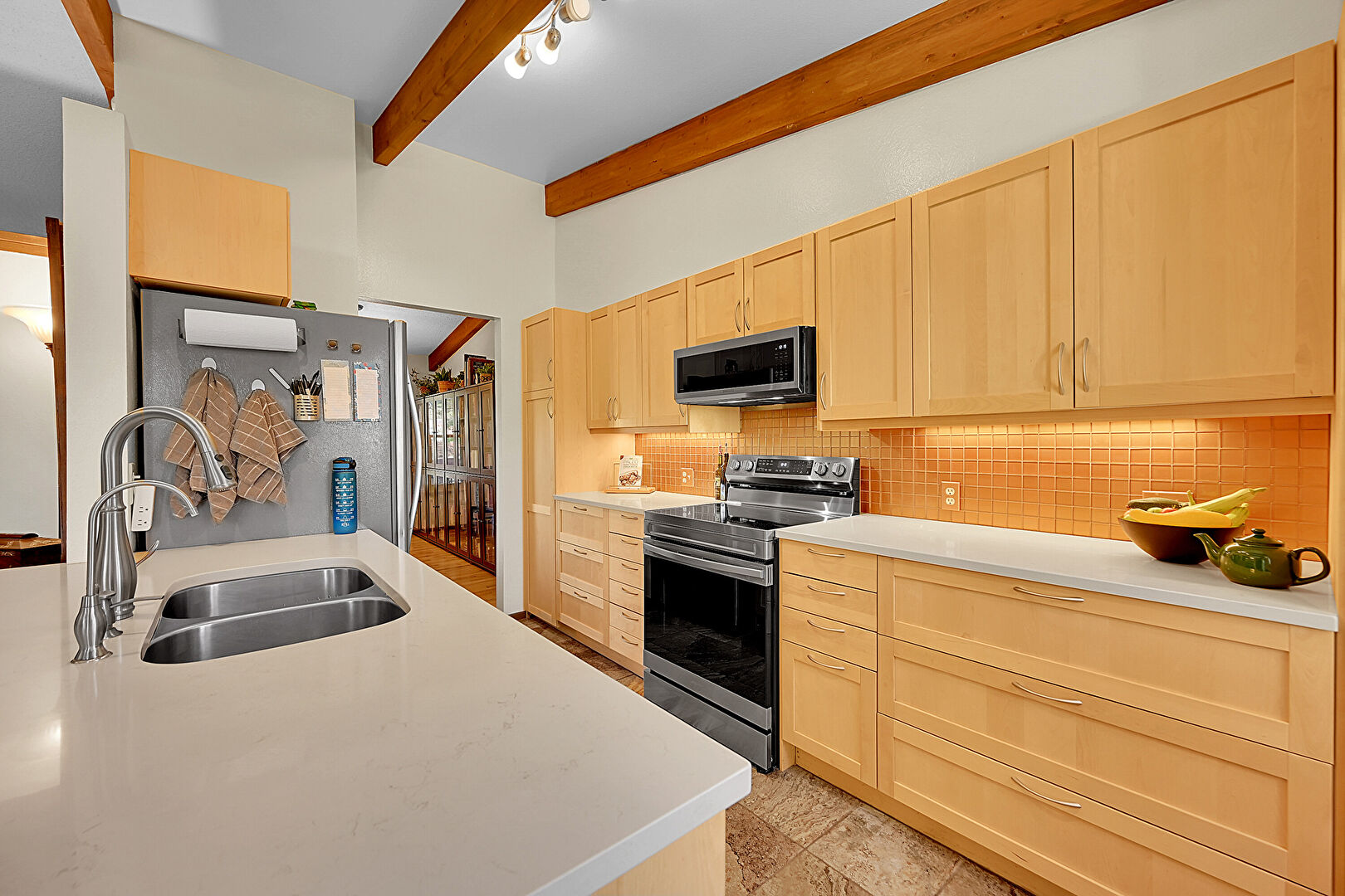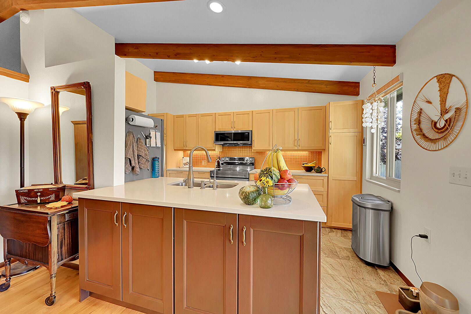 Baseboards Wall, Beamed Ceiling, Dark Brown Cabinets, Drywall, Fireplace, Galley Kitchen, Kitchen Island, Medium Brown Cabinets, Natural Light, Notable Chandelier, Opens To Living Area, Pendant Lighting, Recessed Lighting, Shaker Cabinets, Stone Countertops, Tile Floor, Vaulted Ceiling, Vent, Wood Finish Floor, Baseboards Wall, Beamed Ceiling, Drywall, Natural Light, Recessed Lighting
