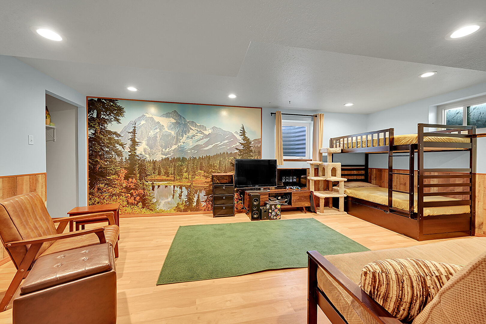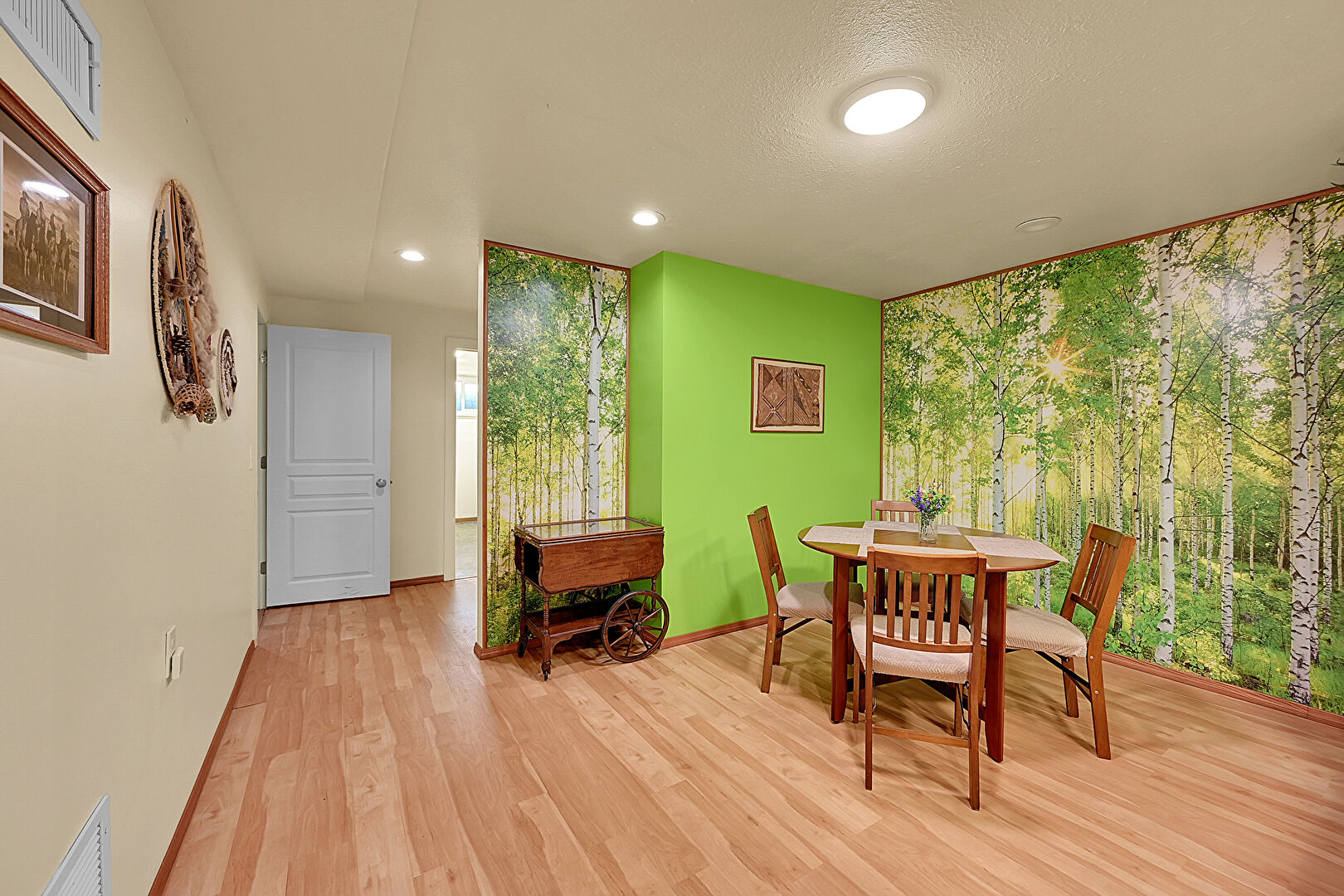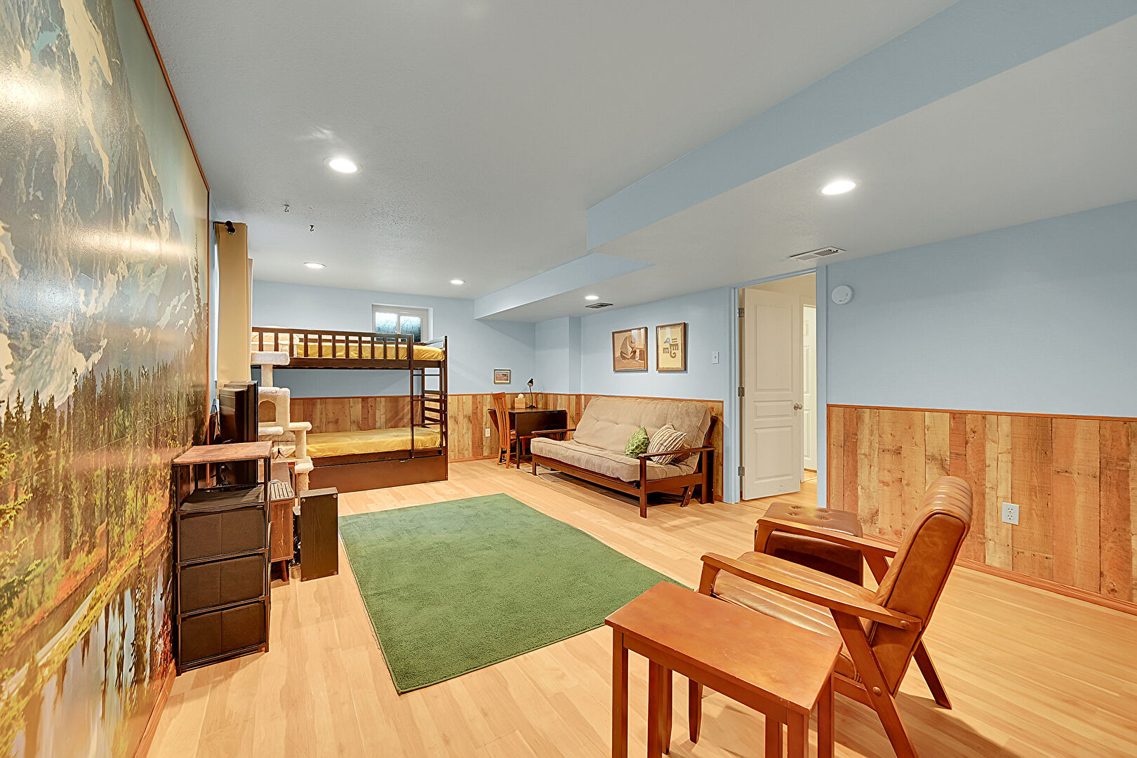 Basement, Natural Light, Recessed Lighting, Vent, Wainscot Wall, Wood Finish Floor, Wood Wall, Drywall