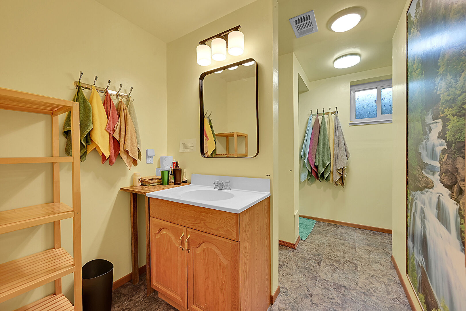 Baseboards Wall, Combined Bath Shower, Drywall, Full Bathroom, Natural Light, Recessed Lighting, Tile Floor, Vanity, Drywall, Vanity, Vent