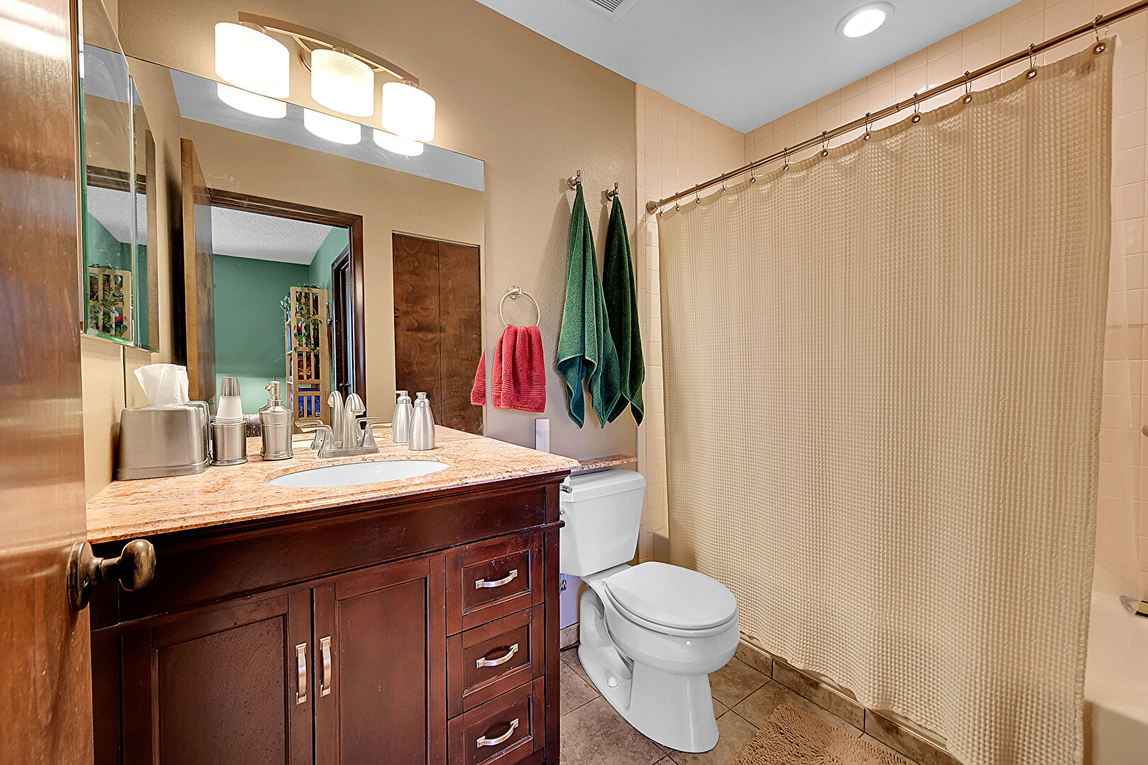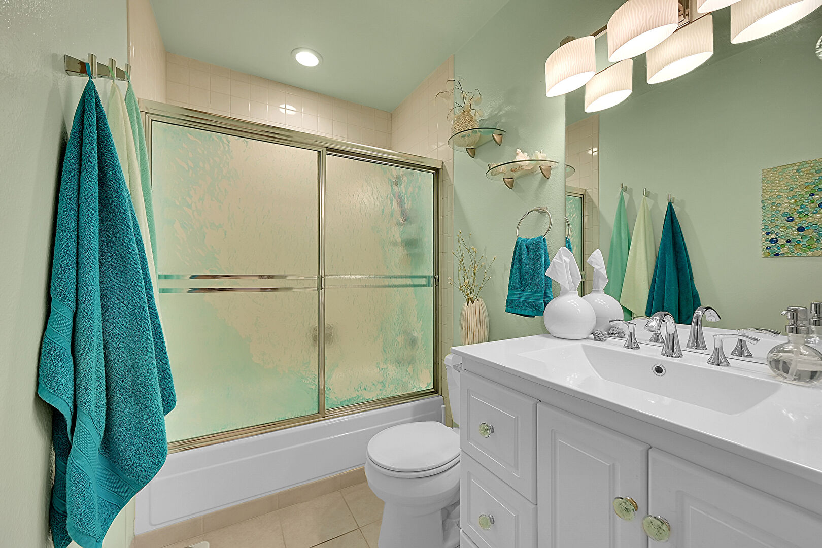 Combined Bath Shower, Full Bathroom, Recessed Lighting, Tile Floor, Vanity, Drywall