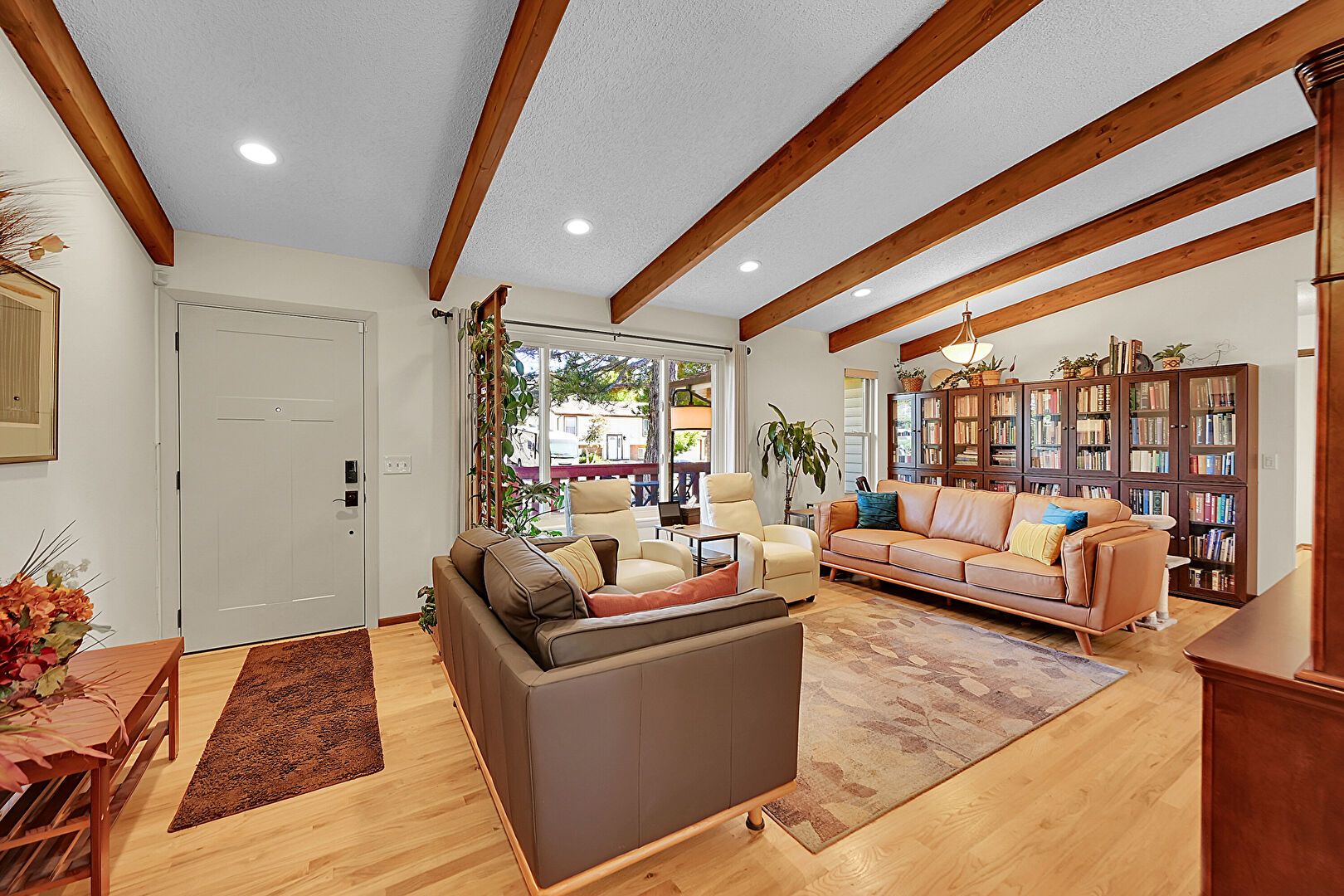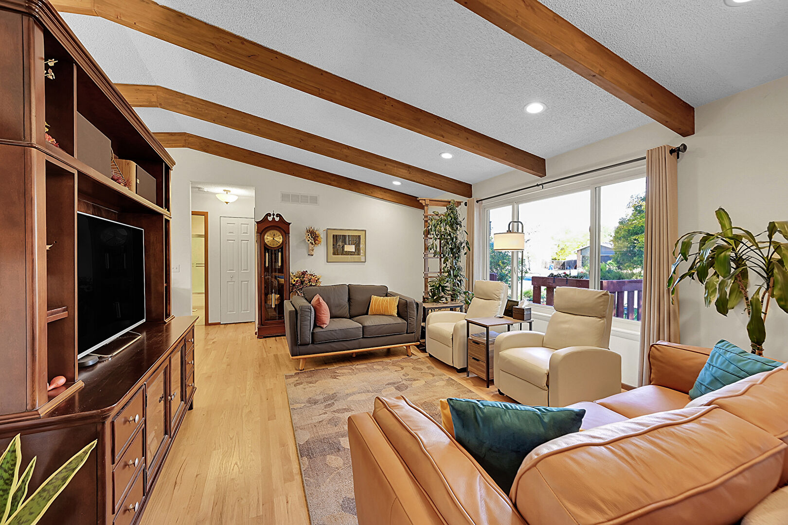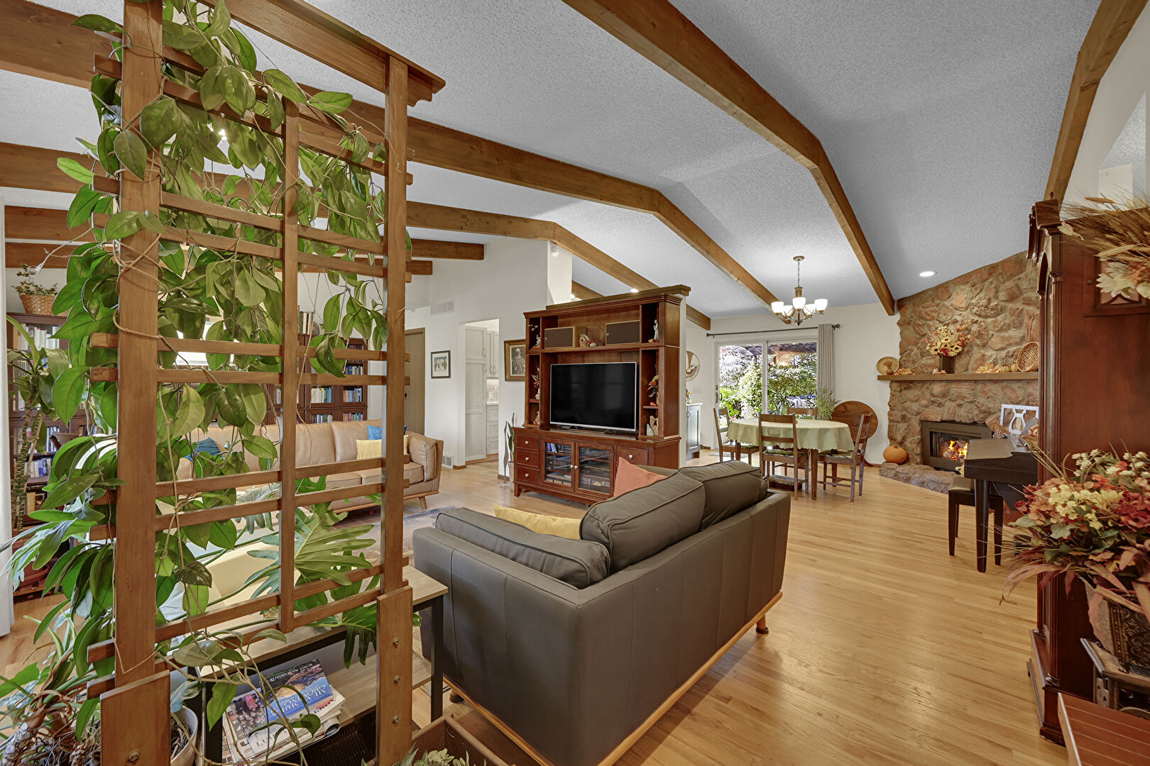Baseboards Wall, Beamed Ceiling, Drywall, Fireplace, Natural Light, Notable Chandelier, Recessed Lighting, Textured Ceiling, Vaulted Ceiling, Vent, Wood Finish Floor, Beamed Ceiling, Wood Finish Floor