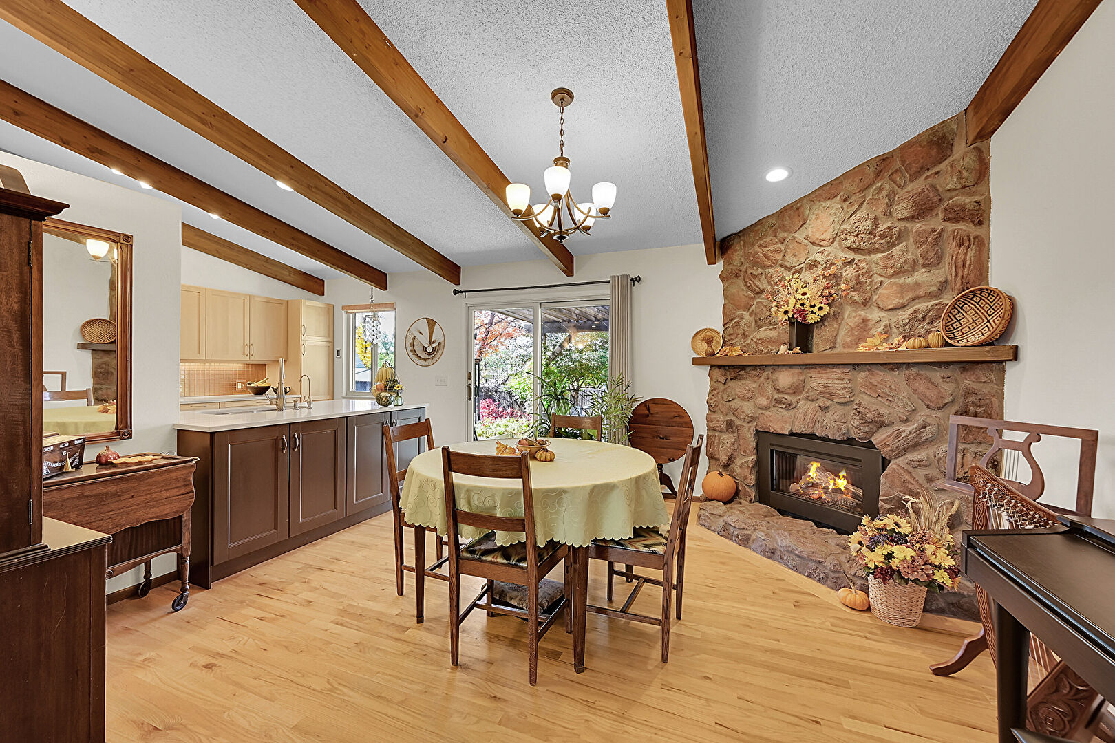 Accent Wall, Baseboards Wall, Beamed Ceiling, Cathedral Ceiling, Drywall, Fireplace, Galley Kitchen, Natural Light, Notable Chandelier, Recessed Lighting, Stone Wall, Textured Ceiling, Vaulted Ceiling, Vent, Wallpaper Wall, Wood Finish Floor, Beamed Ceiling, Textured Ceiling, Vent, Wood Finish Floor
