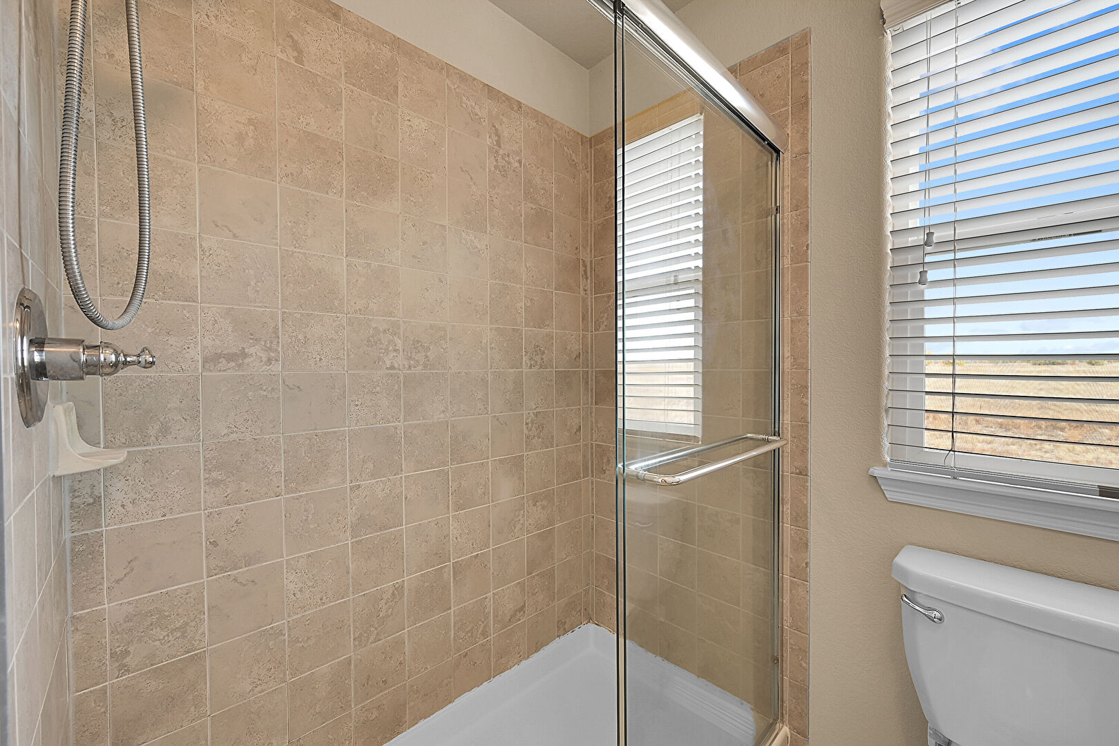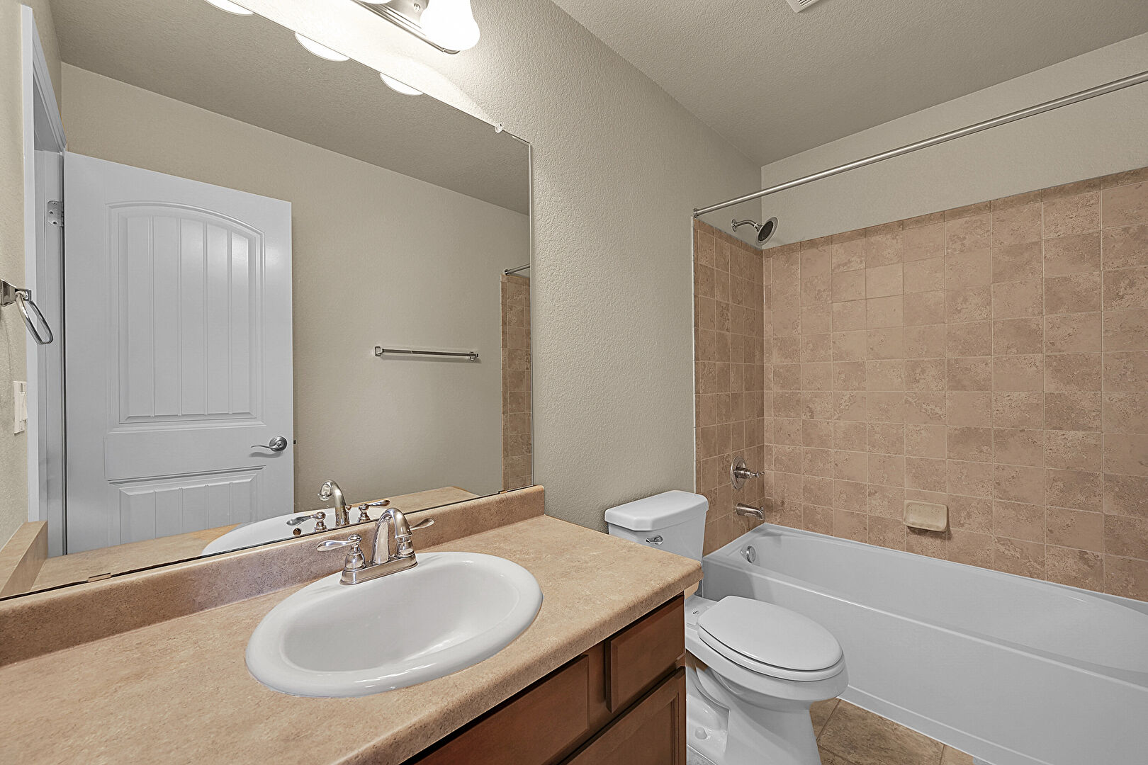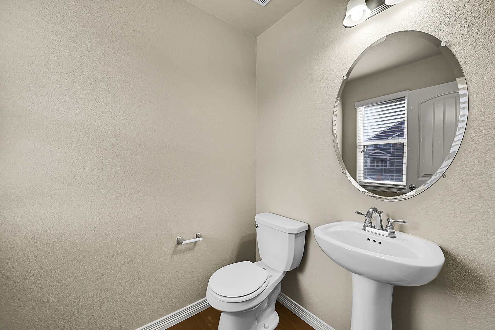 Baseboards Wall, Full Bathroom, Half Bathroom, Textured Wall, Tile Floor, Vanity, Wood Finish Floor, Combined Bath Shower, Natural Light