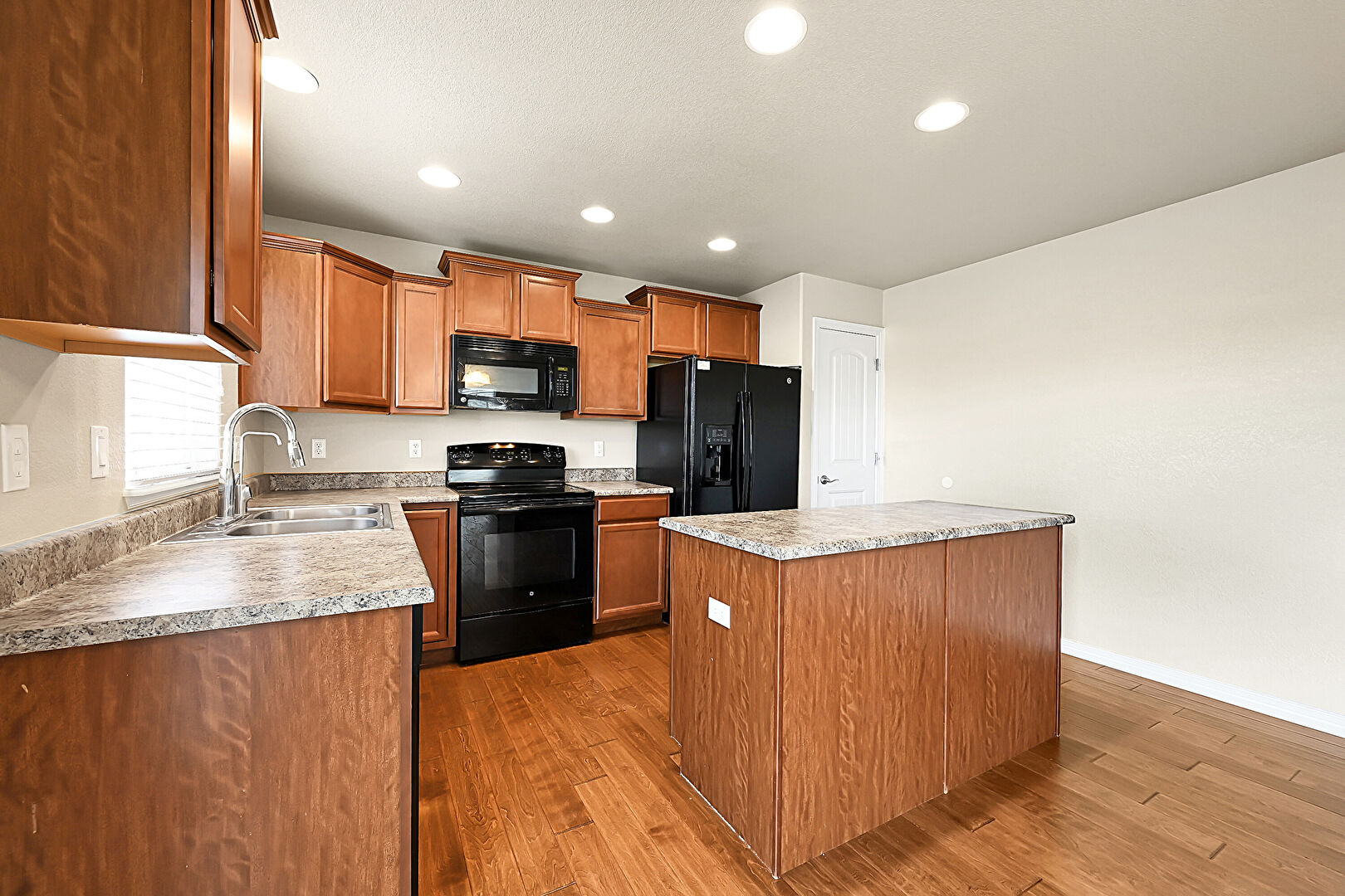 Baseboards Wall, Carpet, Ceiling Fan, Crown Molding Cabinets, Drywall, Kitchen Island, L Shaped Kitchen, Medium Brown Cabinets, Natural Light, Notable Chandelier, Opens To Living Area, Pendant Lighting, Recessed Lighting, Shaker Cabinets, Stone Countertops, Textured Ceiling, Vent, Wood Finish Floor, Drywall, Recessed Lighting, Wood Finish Floor