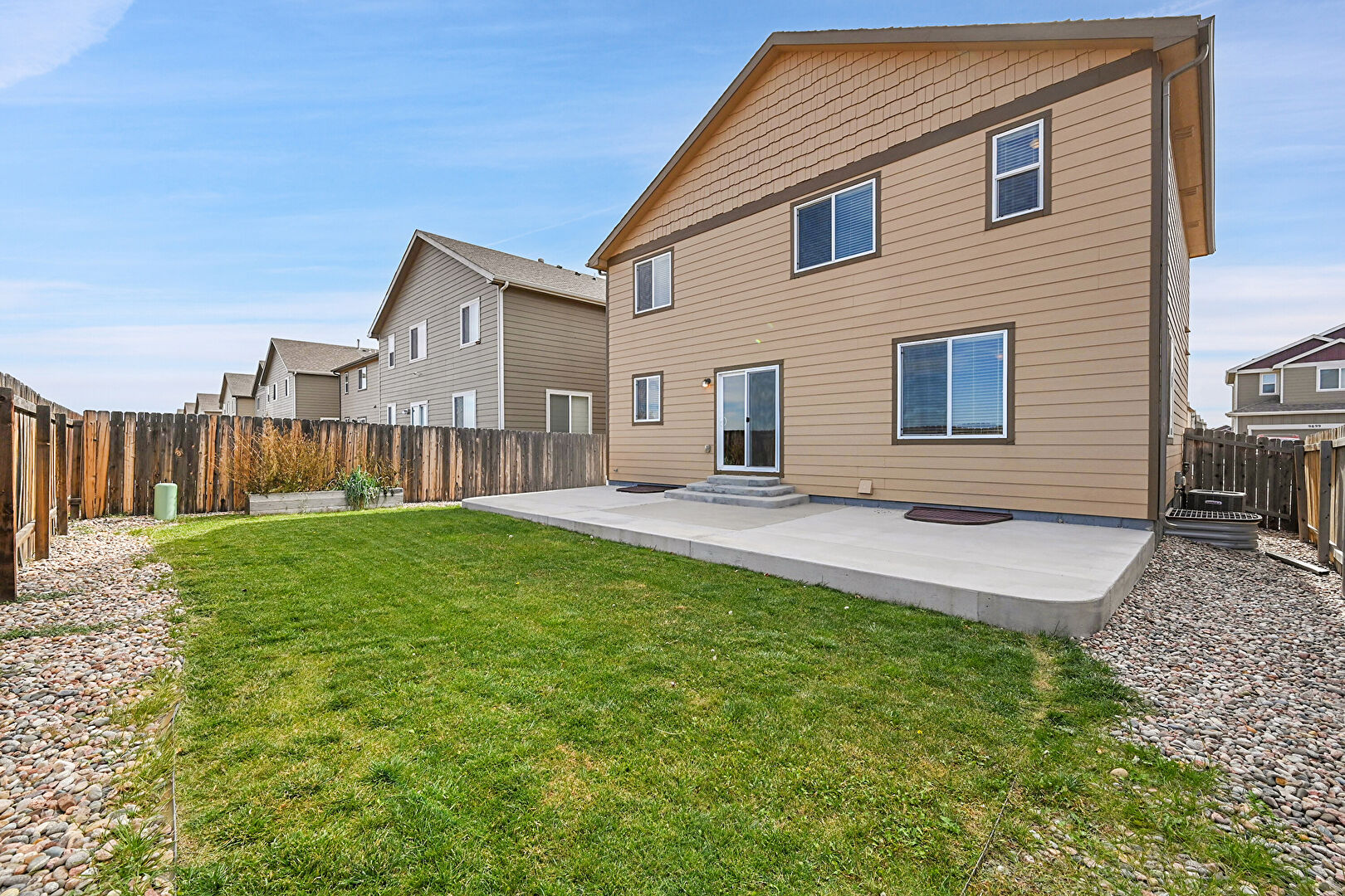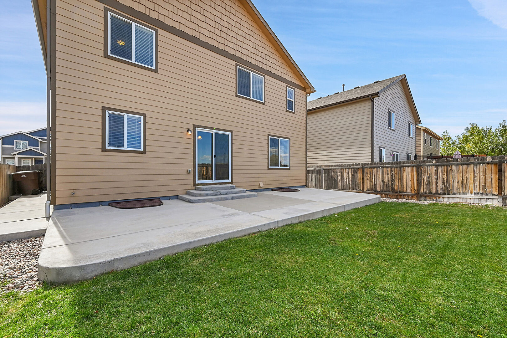Concrete Foundation, Downspout, Entry Steps, Fence, Horizontal Siding, Lawn, Patio, Residential View, Shake Shingle Siding, Fence, Patio