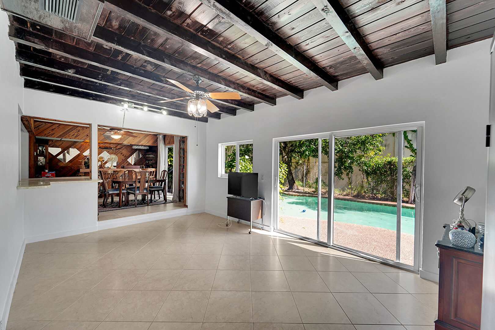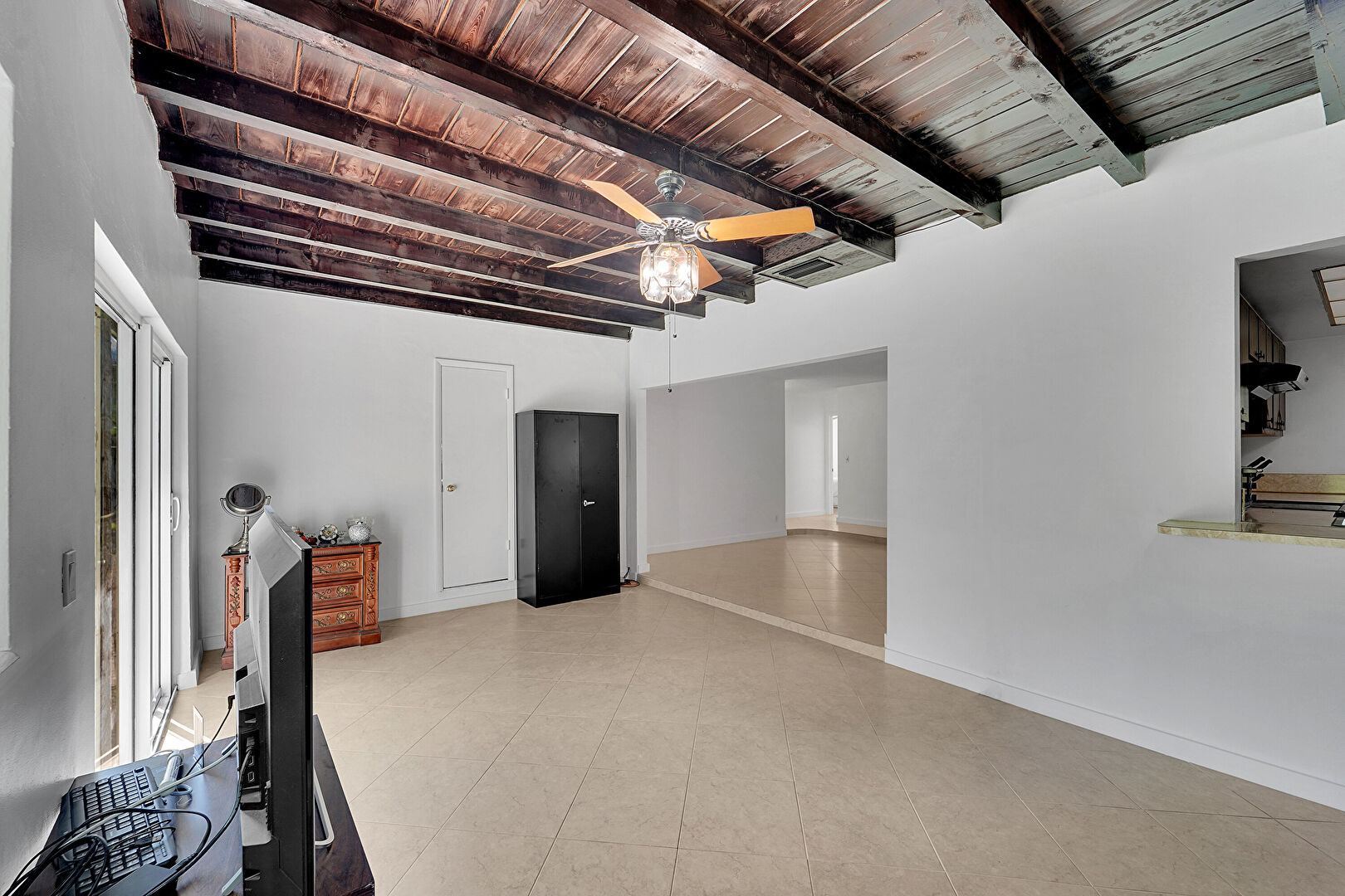 Baseboards Wall, Beamed Ceiling, Ceiling Fan, Drywall, Natural Light, Tile Floor, Vent, Wood Ceiling, Ceiling Fan, Drywall