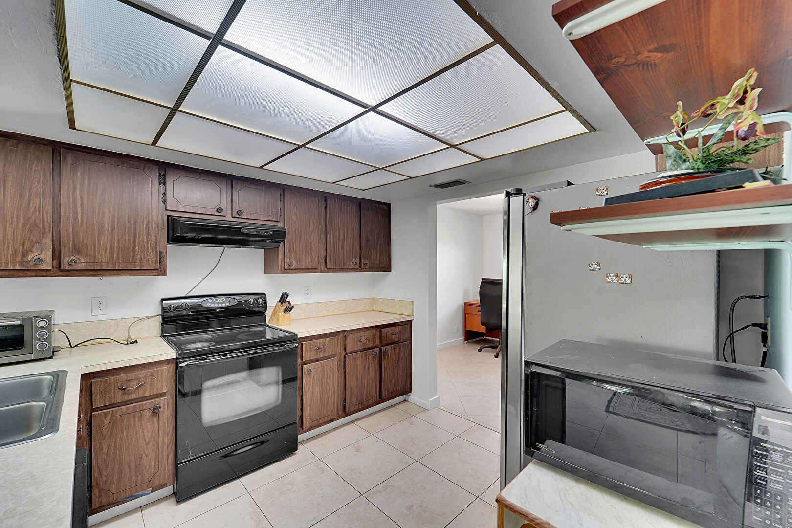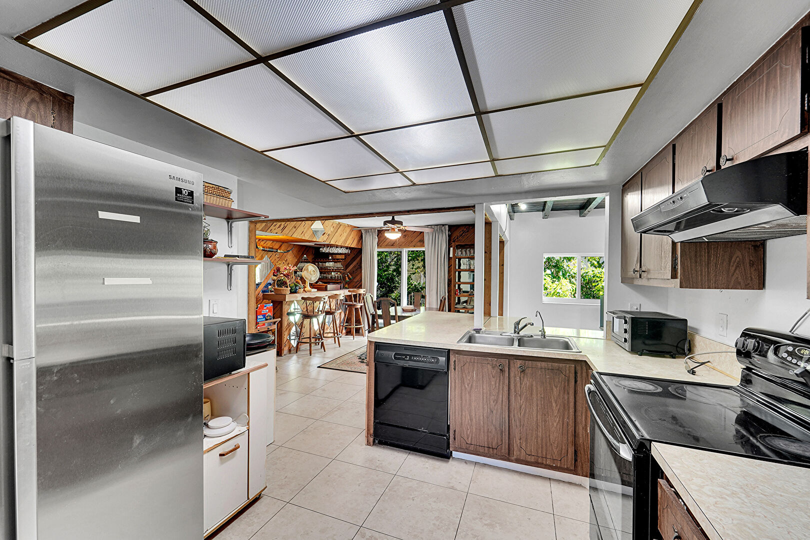 Baseboards Wall, Basement, Ceiling Fan, Dark Brown Cabinets, Drywall, Kitchen Peninsula, Medium Brown Cabinets, Open Shelves, Tile Floor, Toaster, Visible Hinge Cabinets, Natural Light, Vent