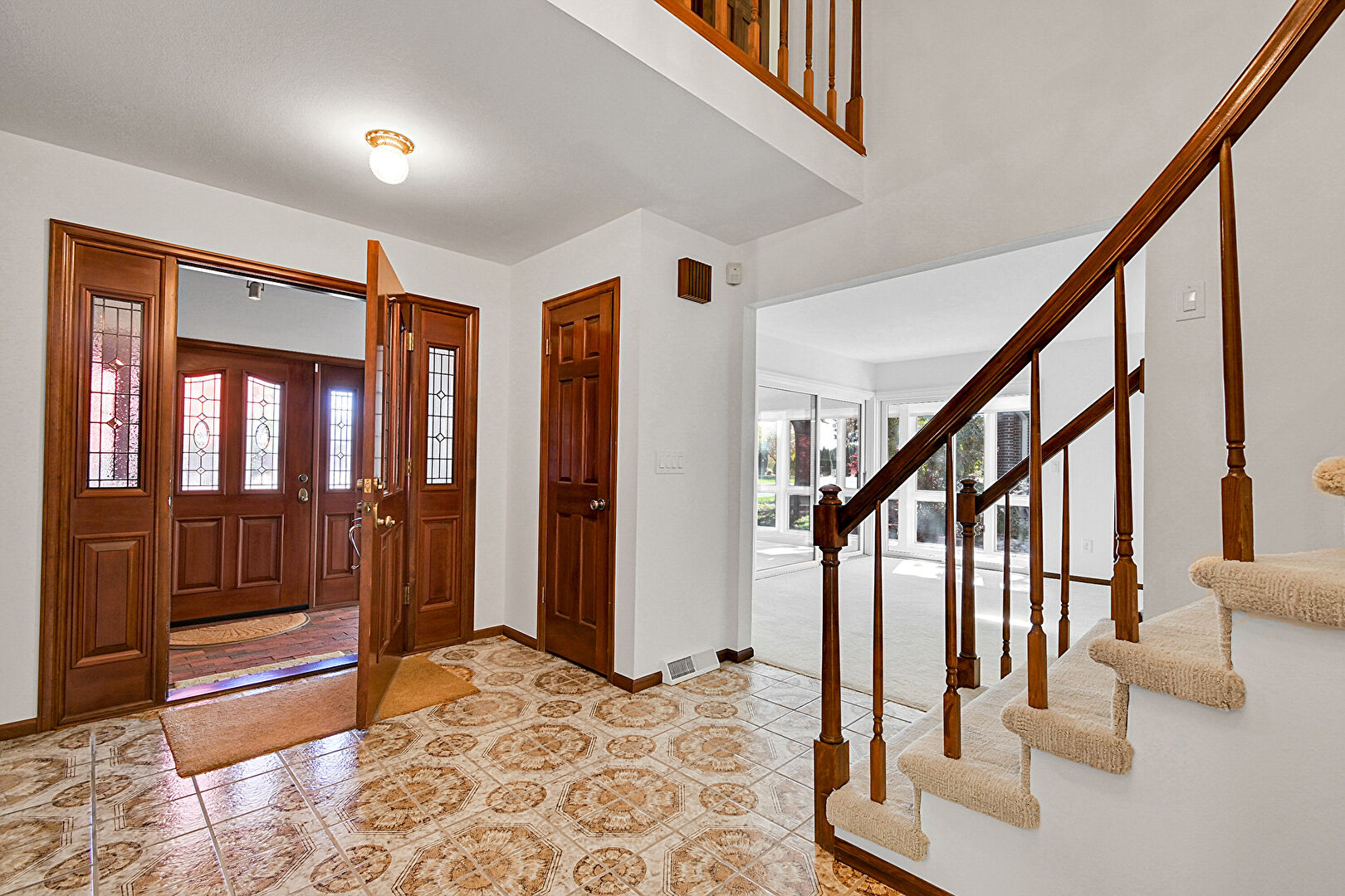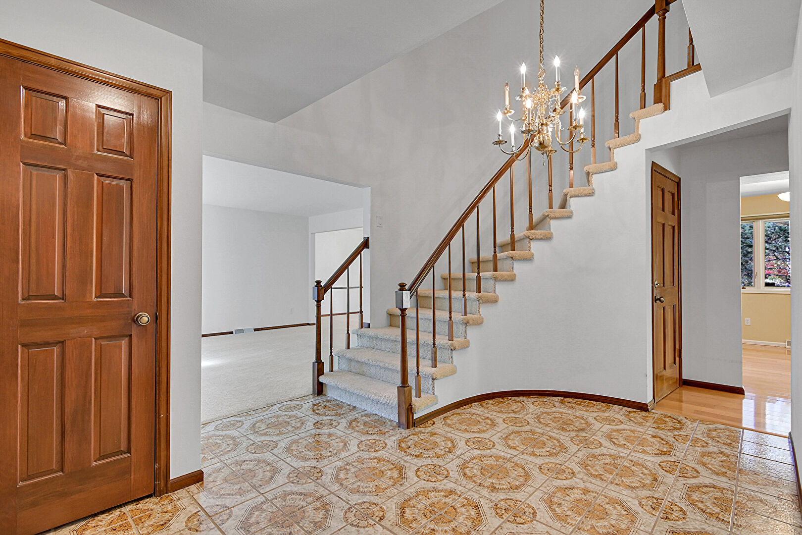 Baseboards Wall,  Carpet,  Drywall,  High Ceiling,  Natural Light,  Notable Chandelier,  Stairs,  Tile Floor,  Vent, Natural Light, Vent