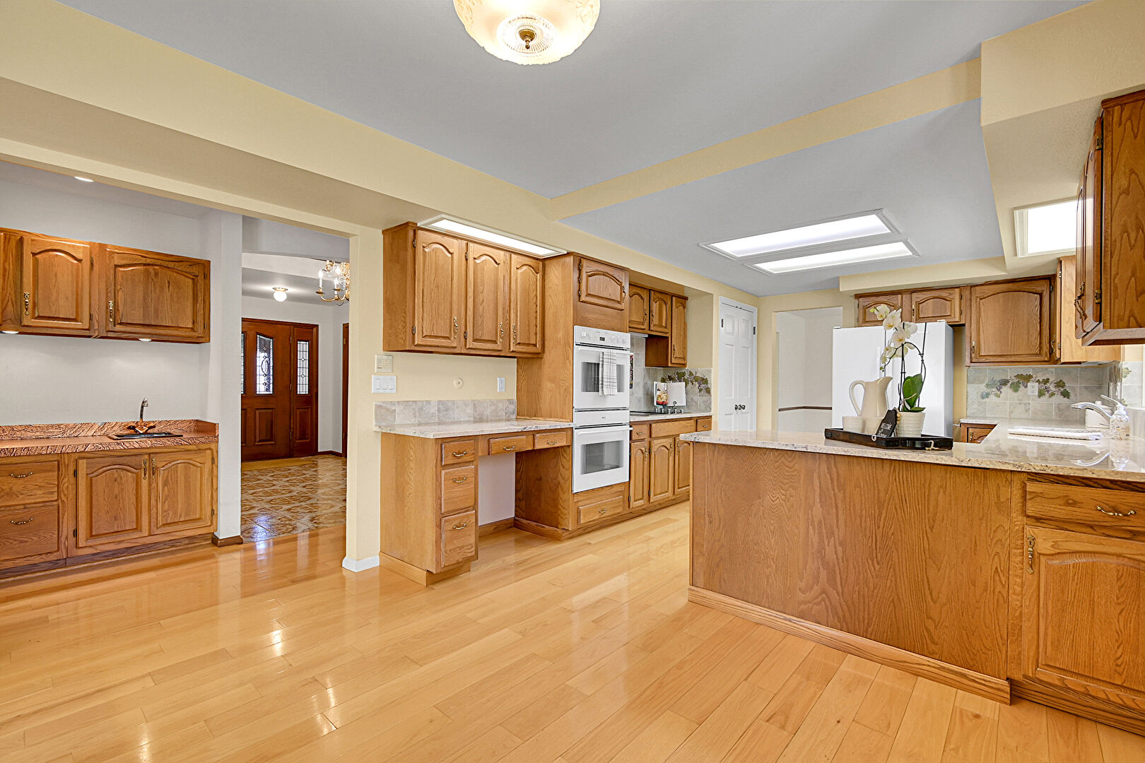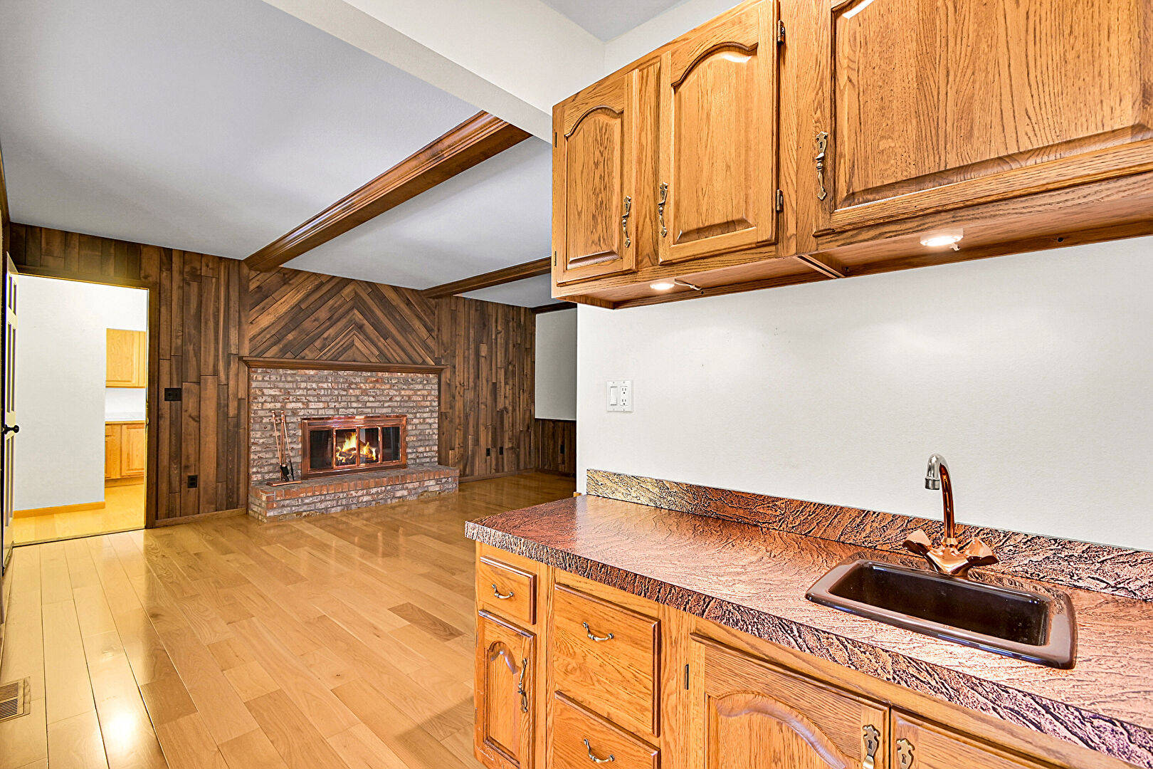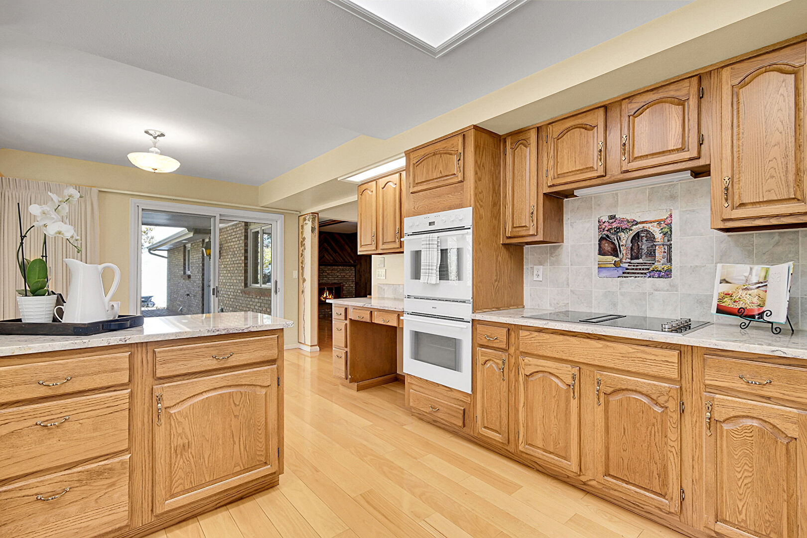 Arched Cabinets,  Baseboards Wall,  Beamed Ceiling,  Double Oven,  Drywall,  Fireplace,  G Shaped Kitchen,  Kitchen Peninsula,  Medium Brown Cabinets,  Natural Light,  Notable Chandelier,  Opens To Living Area,  Raised Cabinets,  Stone Countertops,  Vent,  Visible Hinge Cabinets,  Wood Finish Floor,  Wood Wall, Arched Cabinets, G Shaped Kitchen, Medium Brown Cabinets, Natural Light, Visible Hinge Cabinets