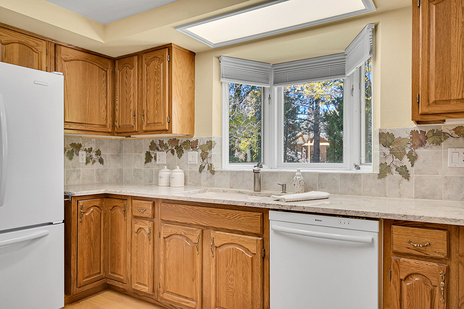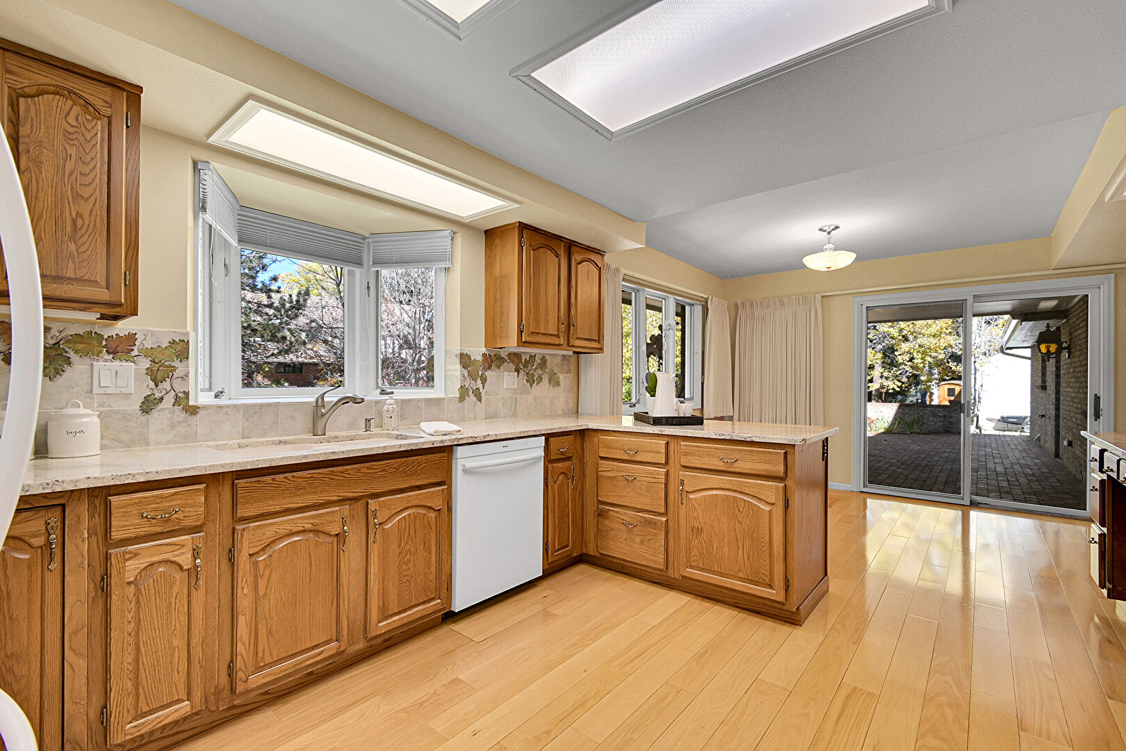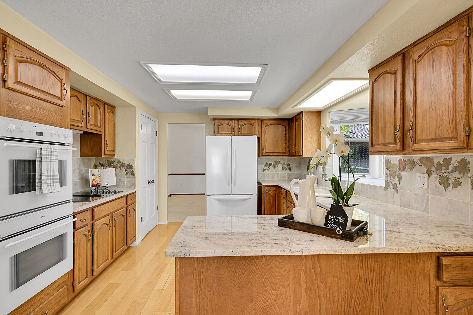 Arched Cabinets,  Baseboards Wall,  Beamed Ceiling,  Double Oven,  Drywall,  Fireplace,  G Shaped Kitchen,  Kitchen Peninsula,  Medium Brown Cabinets,  Natural Light,  Notable Chandelier,  Opens To Living Area,  Raised Cabinets,  Stone Countertops,  Vent,  Visible Hinge Cabinets,  Wood Finish Floor,  Wood Wall, Arched Cabinets, G Shaped Kitchen, Medium Brown Cabinets, Natural Light, Visible Hinge Cabinets