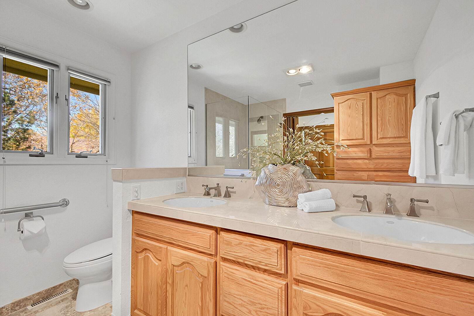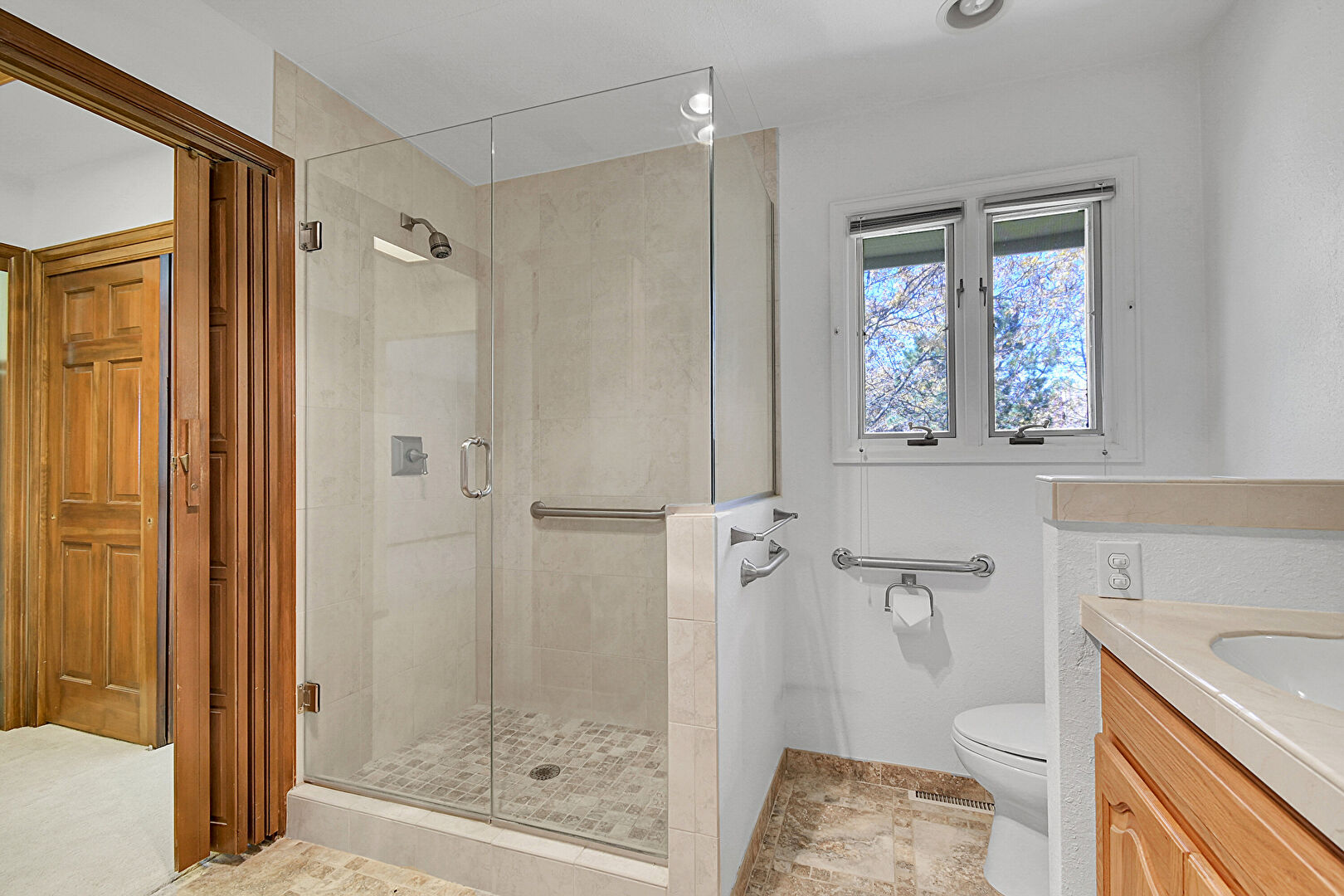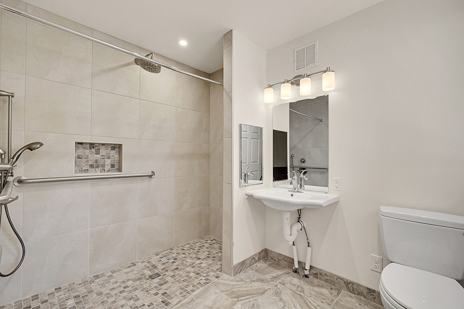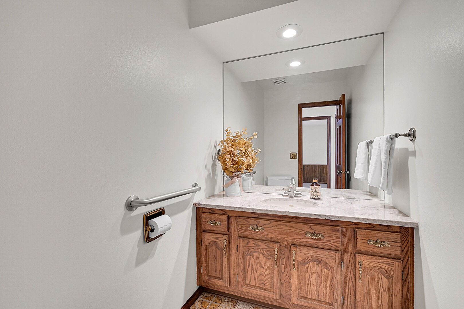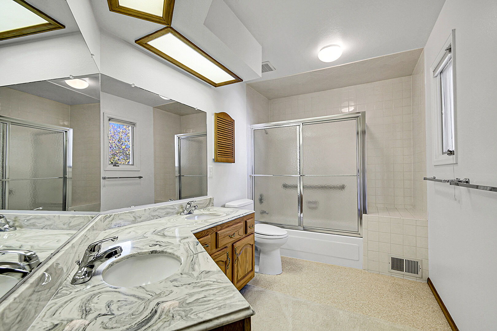 Baseboards Wall,  Combined Bath Shower,  Double Vanity,  Drywall,  Full Bathroom,  Half Bathroom,  Natural Light,  Recessed Lighting,  Tile Floor,  Vanity,  Vent, Double Vanity, Drywall, Recessed Lighting, Tile Floor