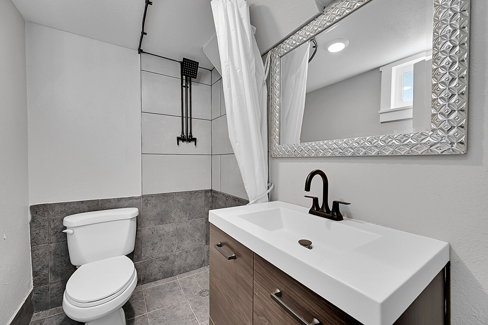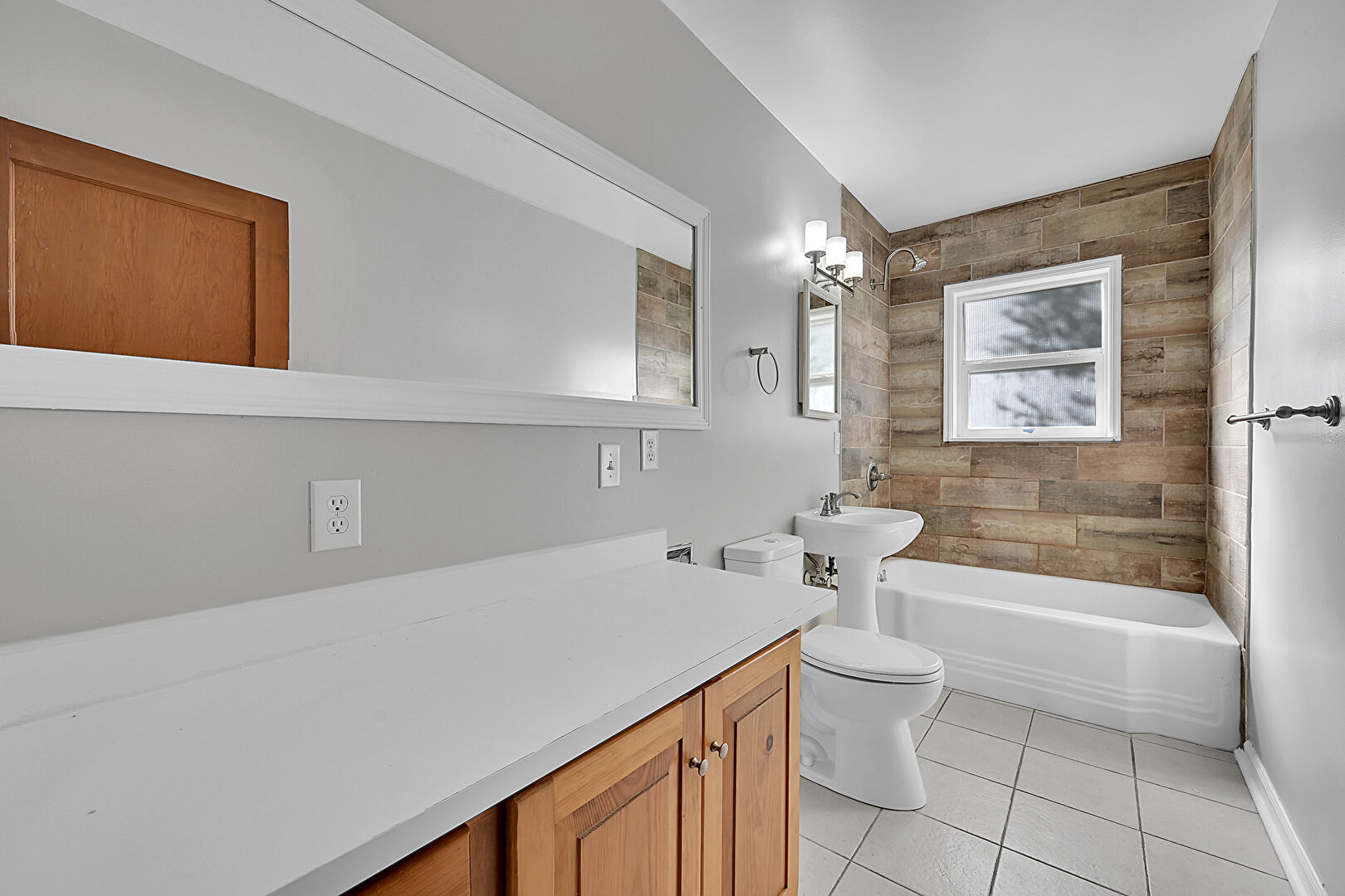 Baseboards Wall, Basement, Combined Bath Shower, Drywall, Full Bathroom, Natural Light, Recessed Lighting, Tile Floor, Tile Wall, Vanity, Vent, Wainscot Wall, Combined Bath Shower, Full Bathroom