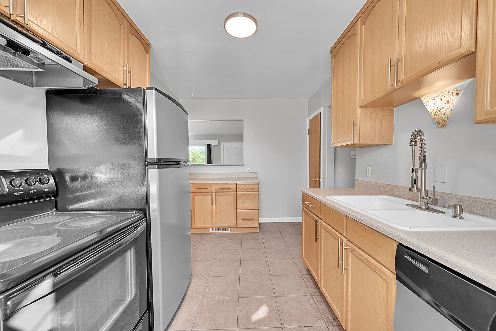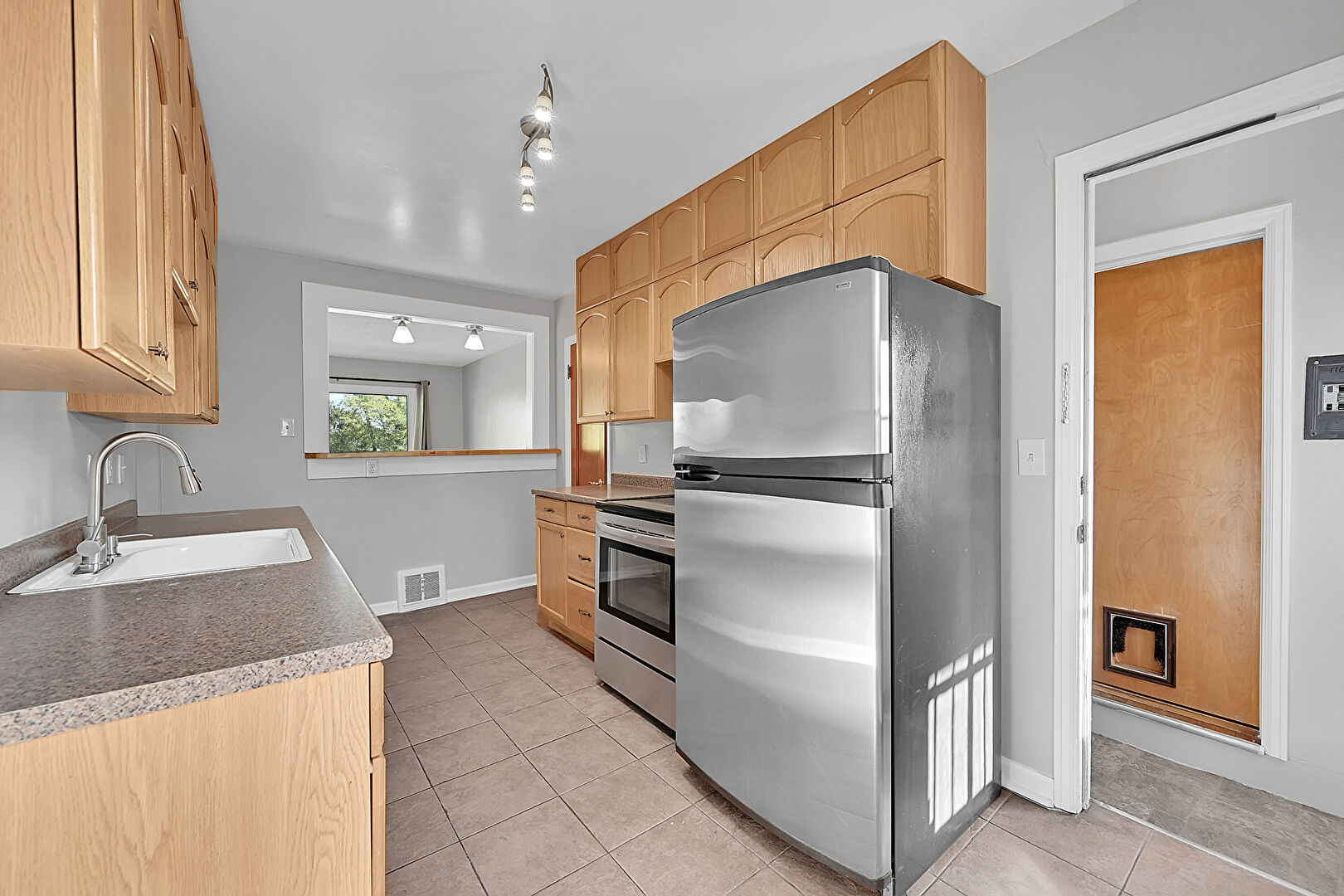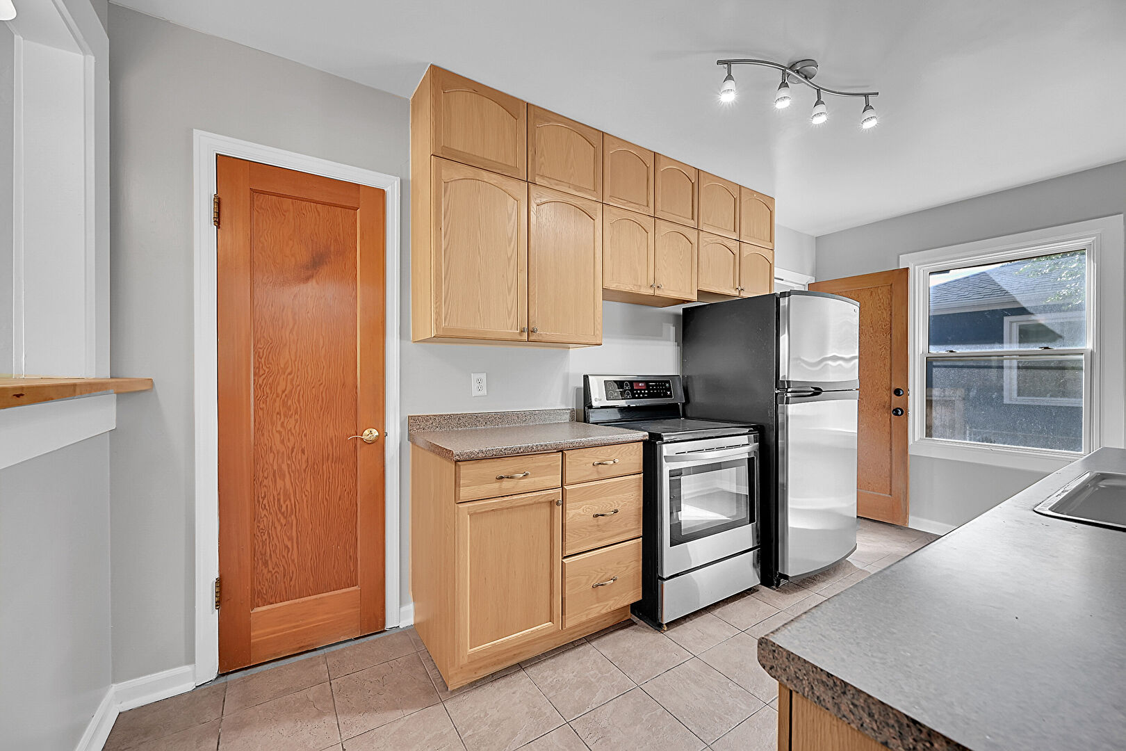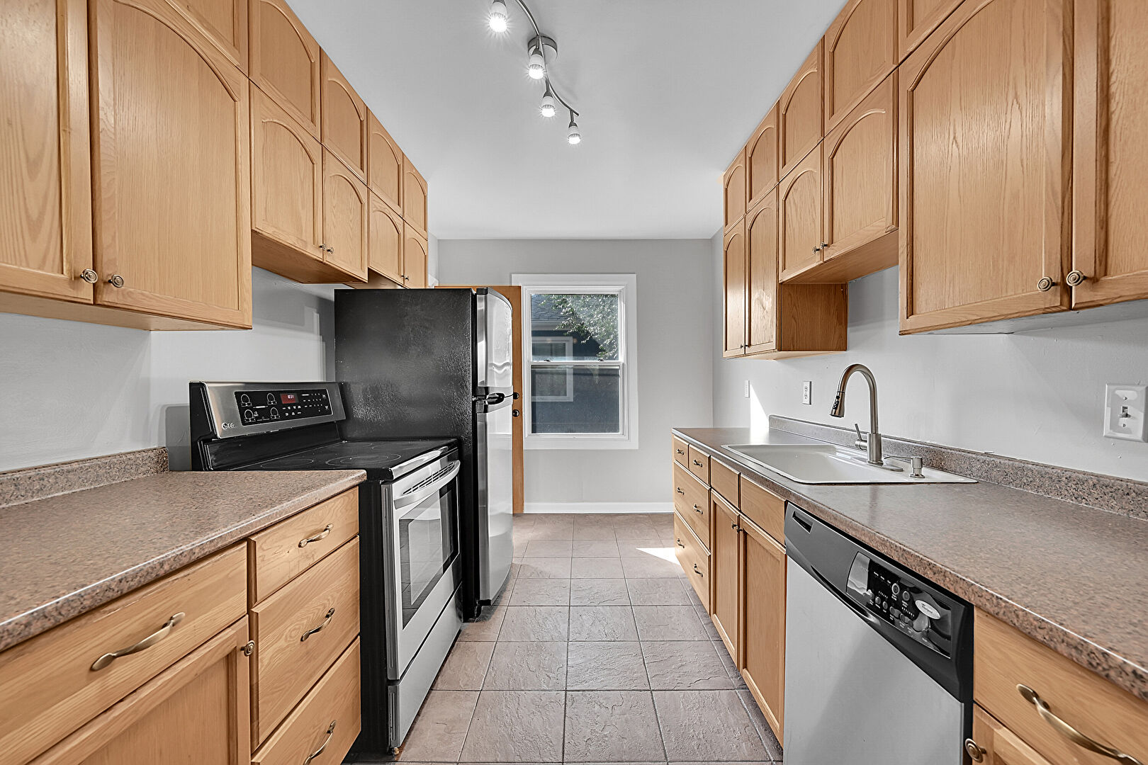 Arched Cabinets, Baseboards Wall, Drywall, Galley Kitchen, Kitchen Peninsula, Natural Light, Pass Through Window, Shaker Cabinets, Tile Floor, Track Lighting, Vent, Wood Finish Floor, Baseboards Wall, Drywall, Galley Kitchen, Natural Light, Shaker Cabinets, Track Lighting
