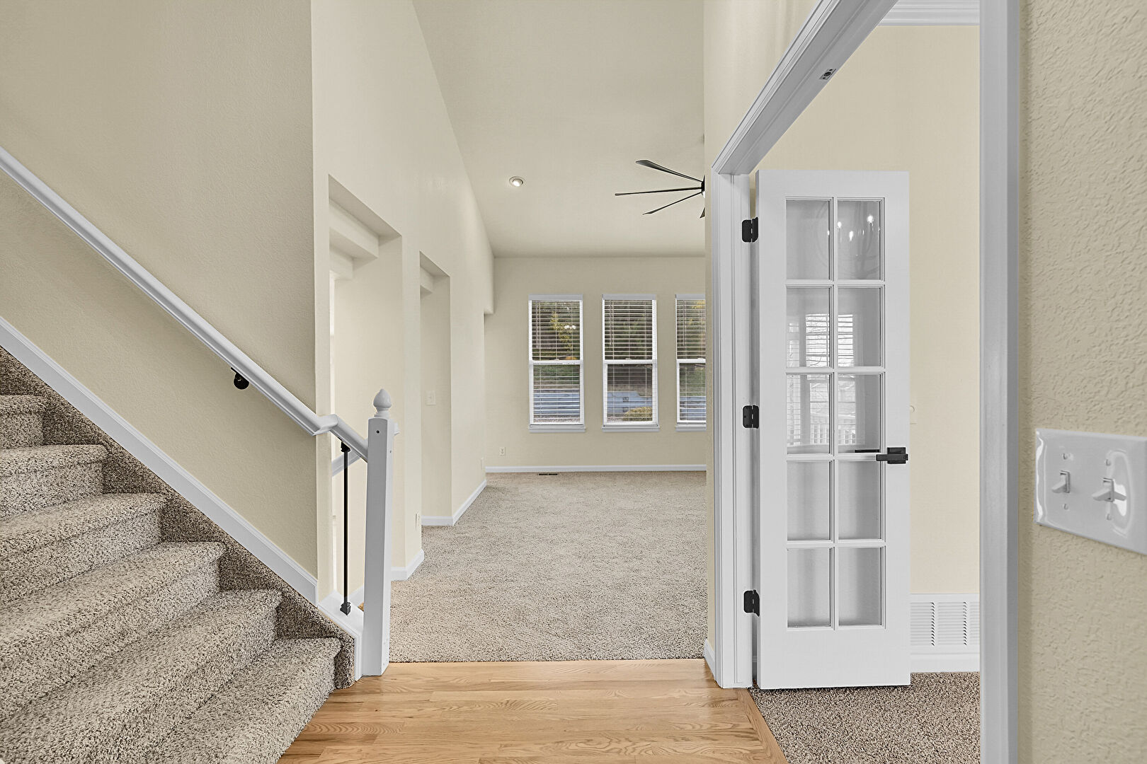 Baseboards Wall, Carpet, Drywall, Natural Light, Stairs, Vent, Wood Finish Floor, Ceiling Fan, Stairs