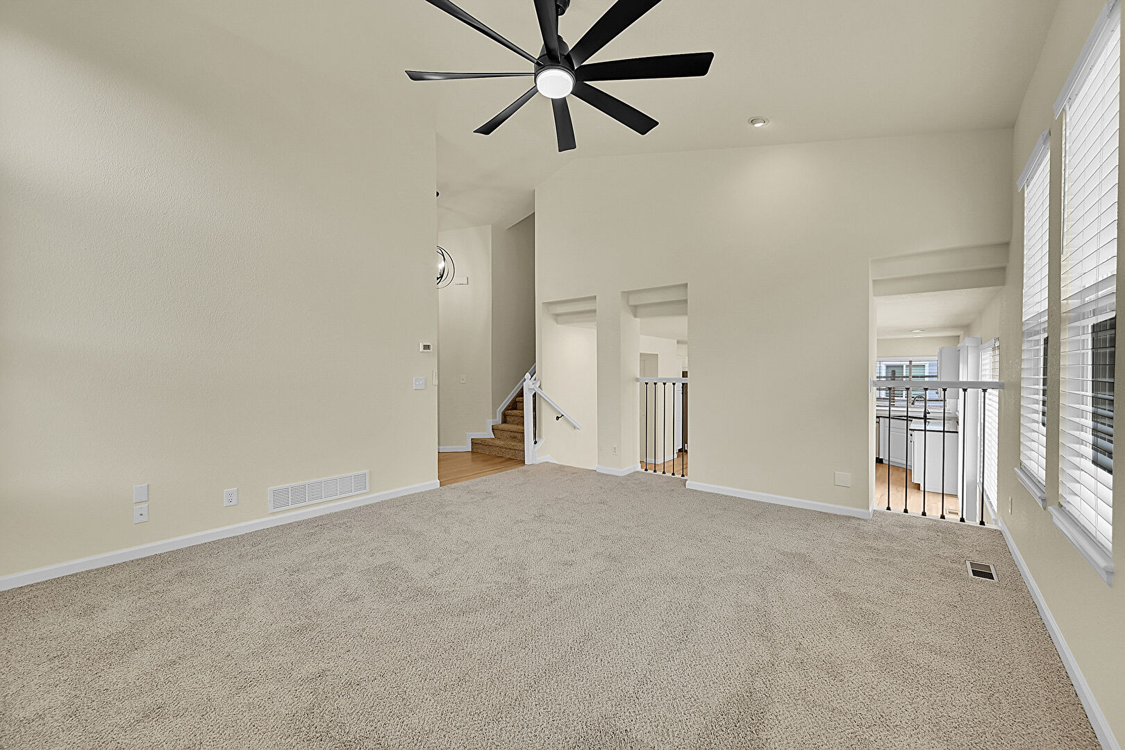 Baseboards Wall, Carpet, Ceiling Fan, Drywall, High Ceiling, Natural Light, Recessed Lighting, Stairs, Vaulted Ceiling, Vent, Ceiling Fan, Natural Light, Vaulted Ceiling