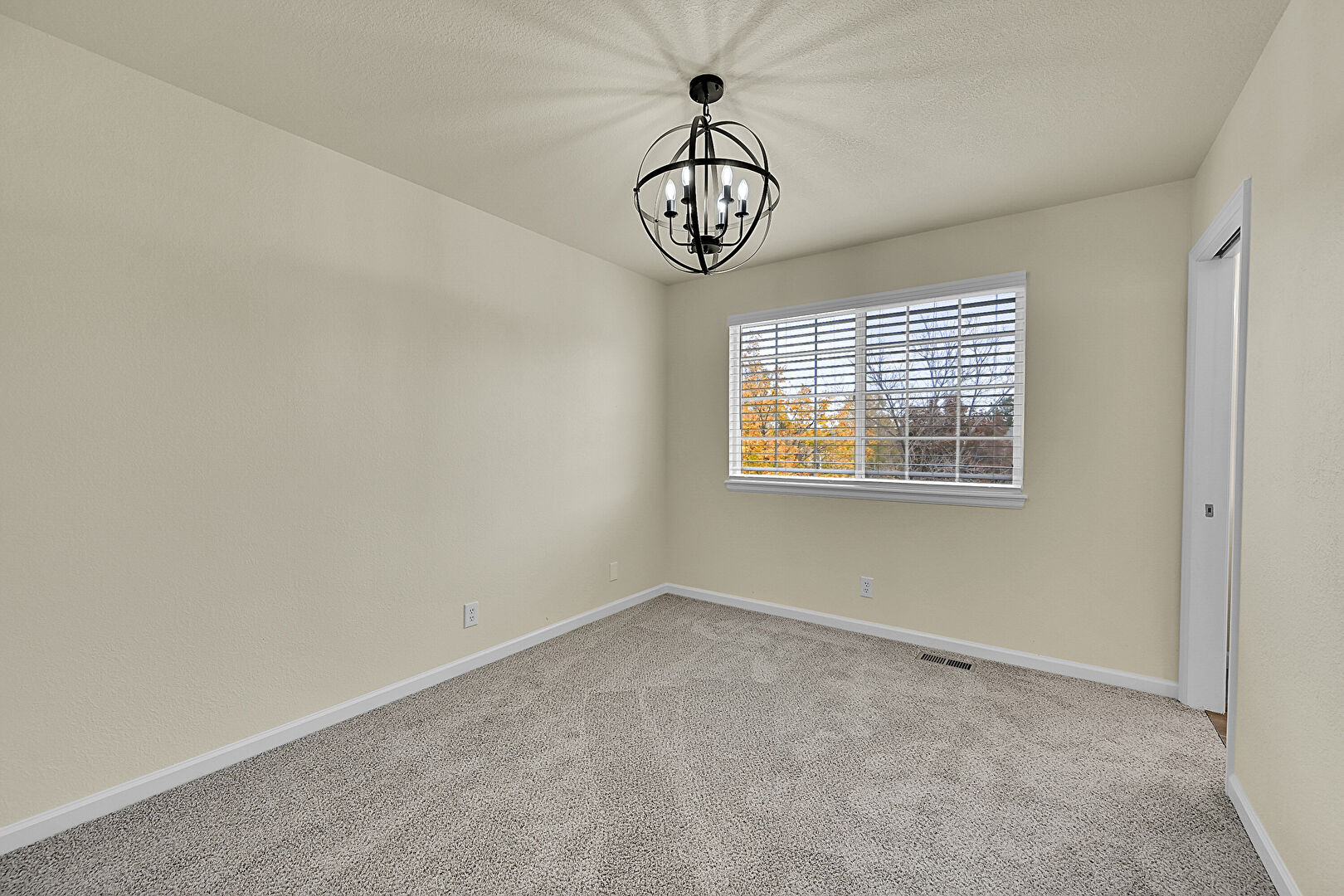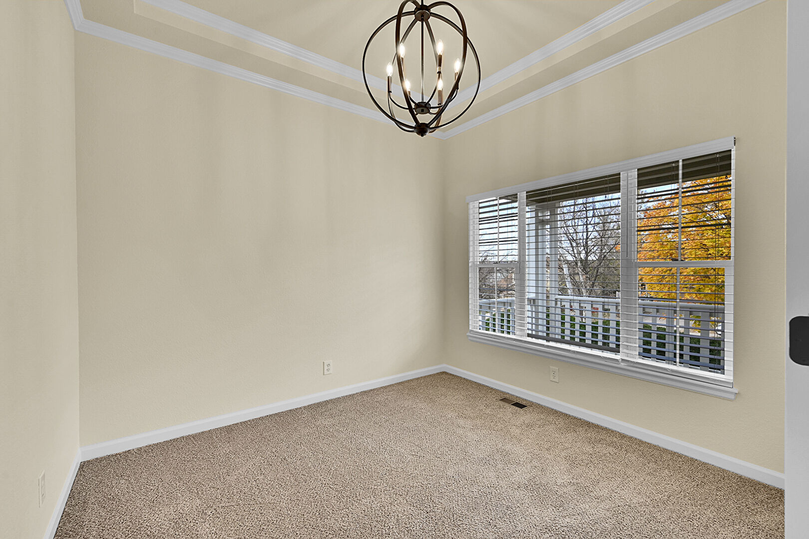 Baseboards Wall, Carpet, Crown Molding, Drywall, Natural Light, Notable Chandelier, Tray Ceiling, Vent