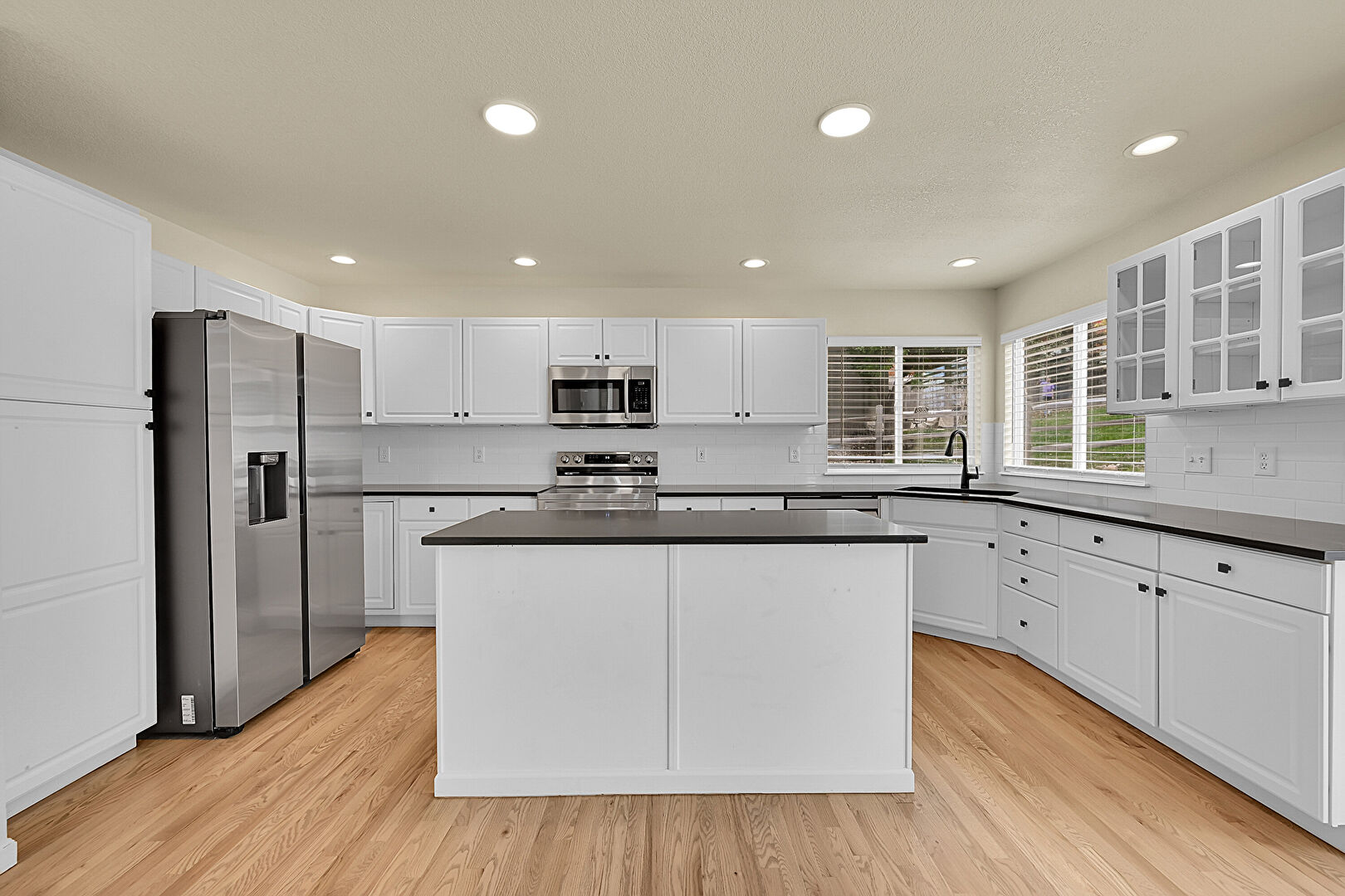 Baseboards Wall, Drywall, Glass Insert Cabinets, Kitchen Island, Natural Light, Notable Chandelier, Opens To Living Area, Pendant Lighting, Raised Cabinets, Recessed Lighting, Stone Countertops, Textured Ceiling, U Shaped Kitchen, Vent, Wood Finish Floor, Kitchen Island, Natural Light, Wood Finish Floor