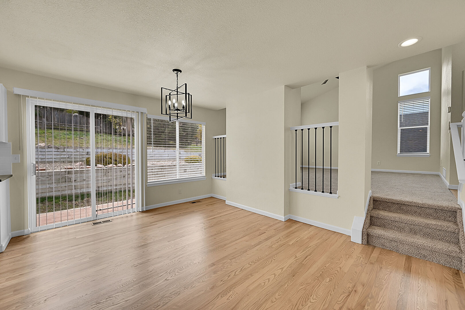 Baseboards Wall, Drywall, Natural Light, Notable Chandelier, Recessed Lighting, Stairs, Vent, Wood Finish Floor, Textured Ceiling