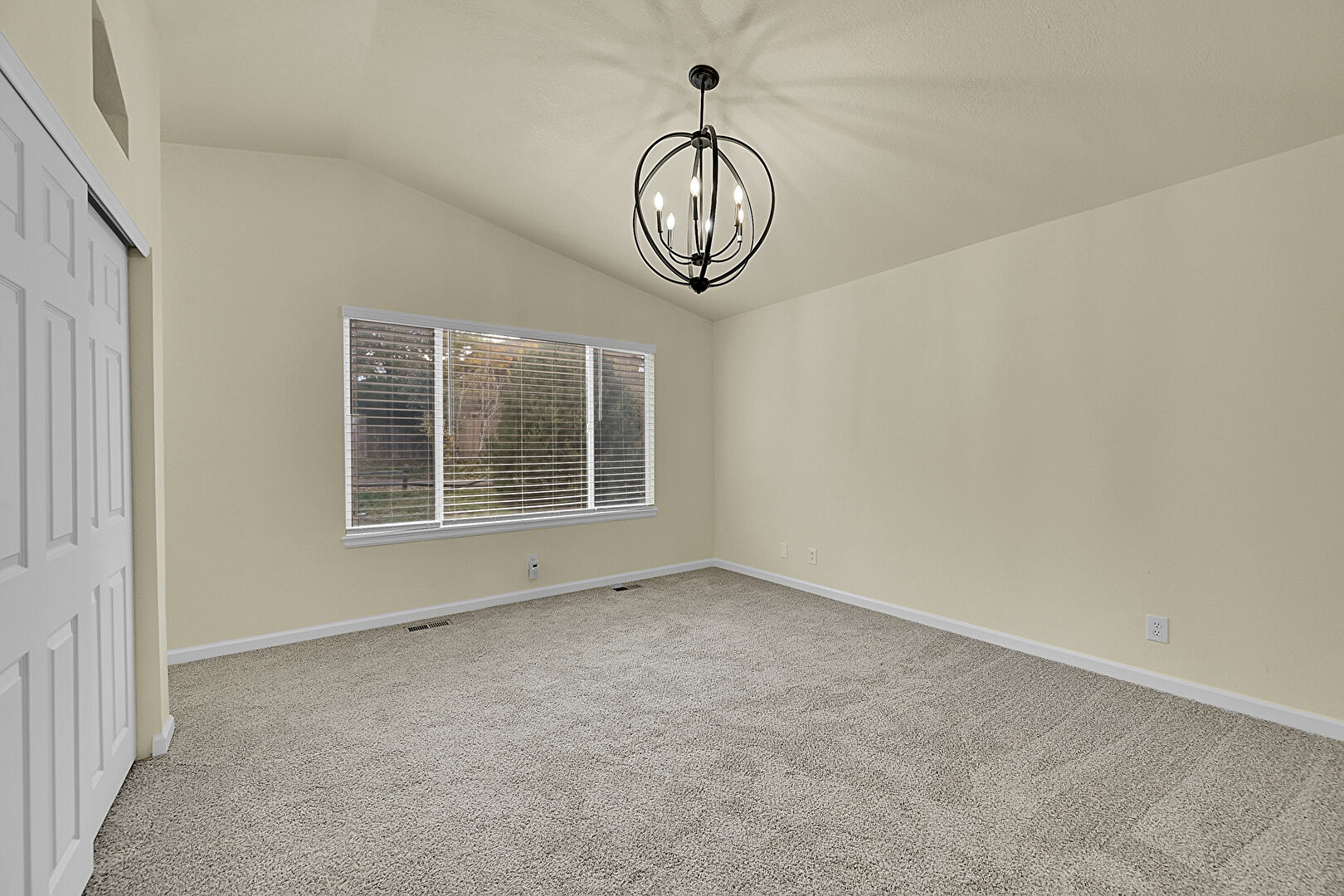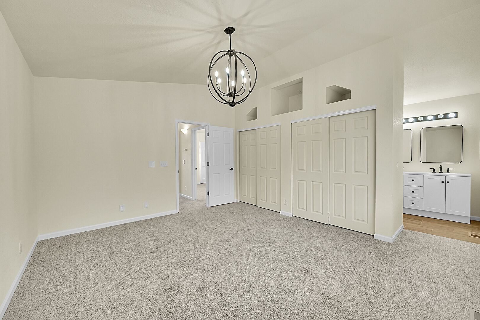 Baseboards Wall, Carpet, Closet, Drywall, Ensuite Bathroom, Natural Light, Notable Chandelier, Two Closets, Vaulted Ceiling, Vent, Carpet, Vent
