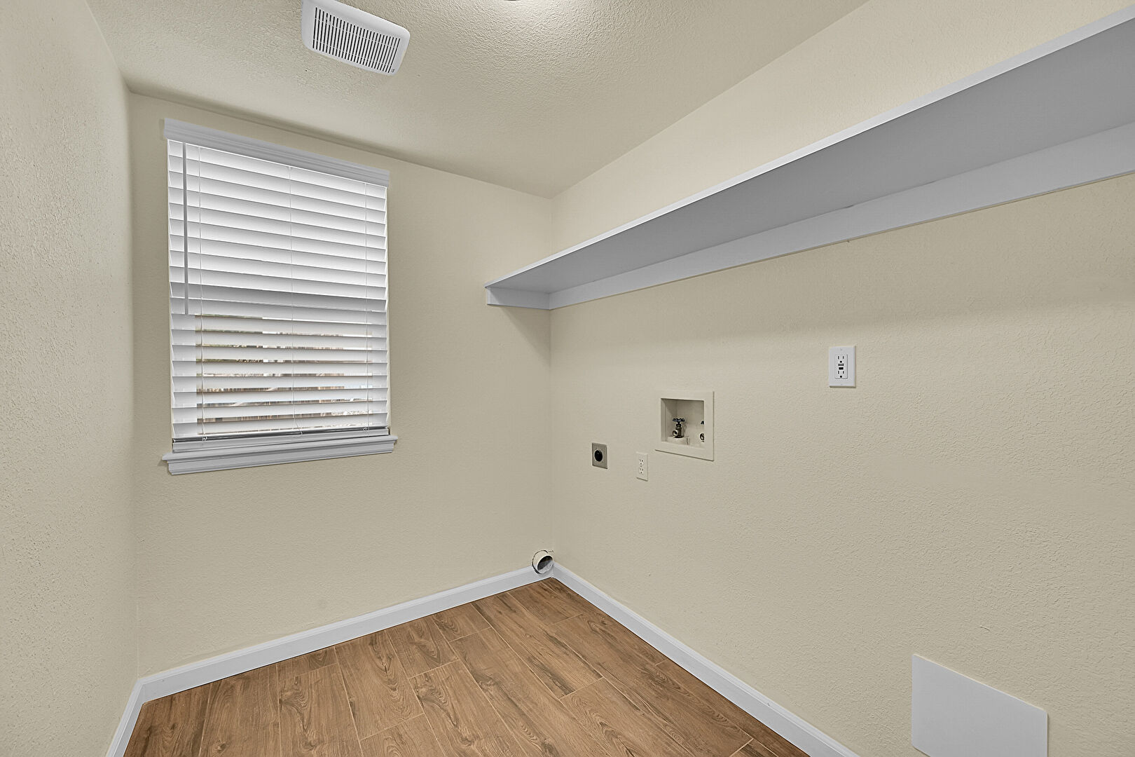 Baseboards Wall, Electric Dryer Hookup, Laundry, Natural Light, Textured Ceiling, Textured Wall, Vent, Washer Hookup, Wood Finish Floor
