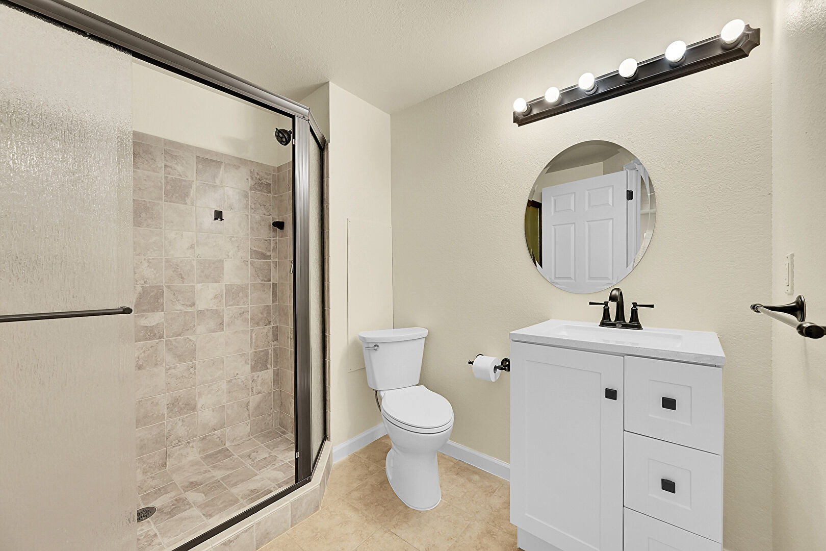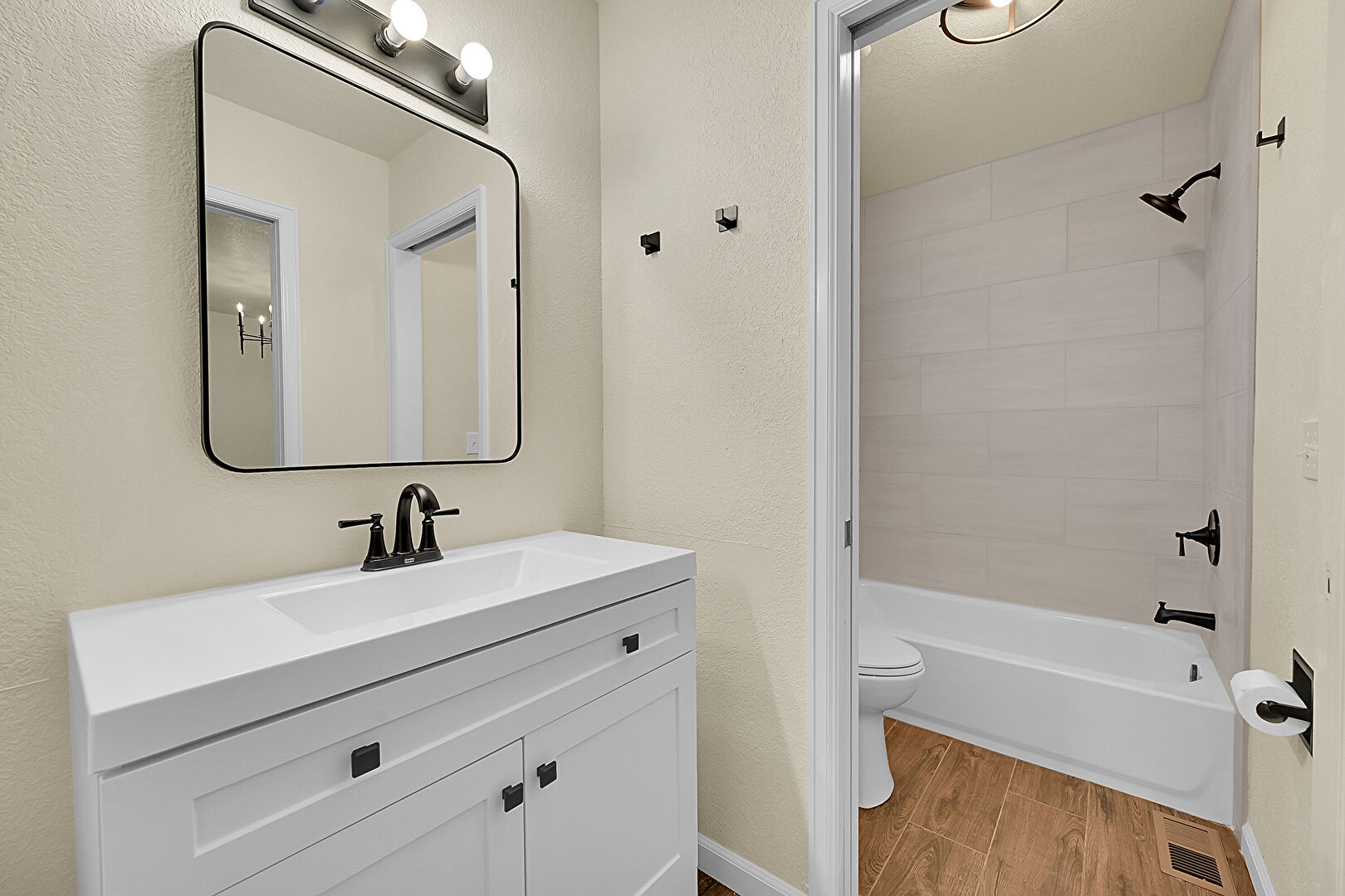 Baseboards Wall, Combined Bath Shower, Full Bathroom, Textured Wall, Tile Floor, Vanity, Vent, Wood Finish Floor, Drywall, Half Bathroom, Vanity