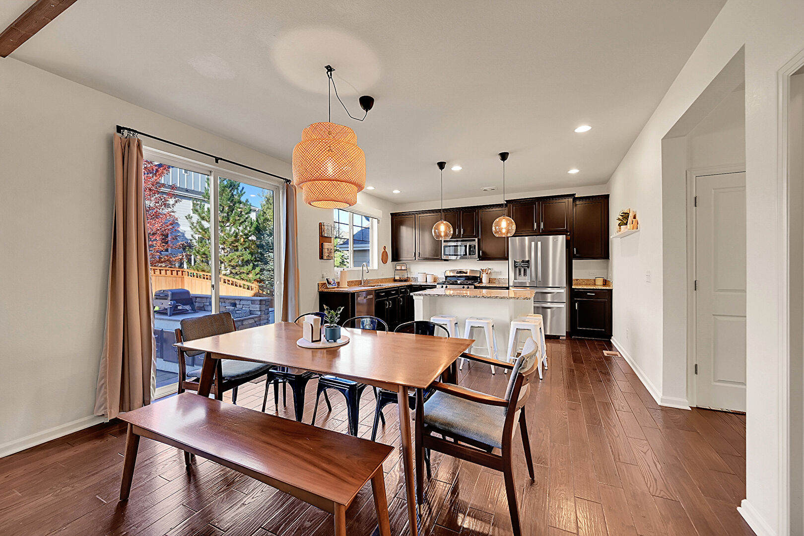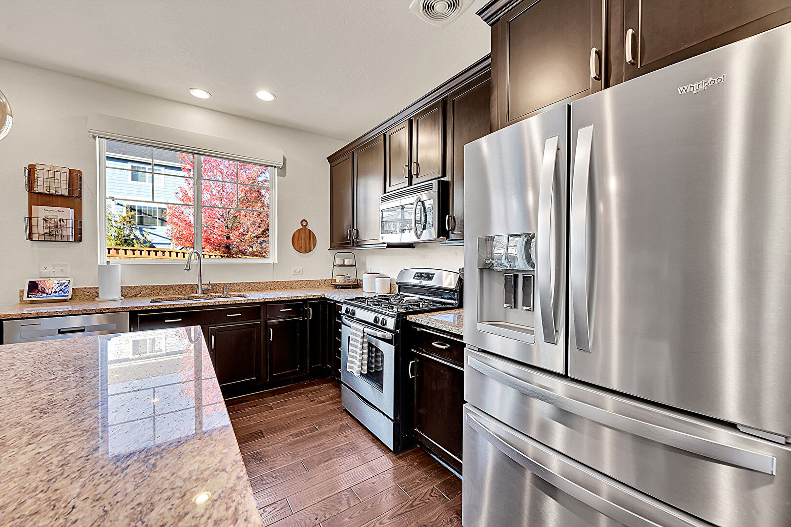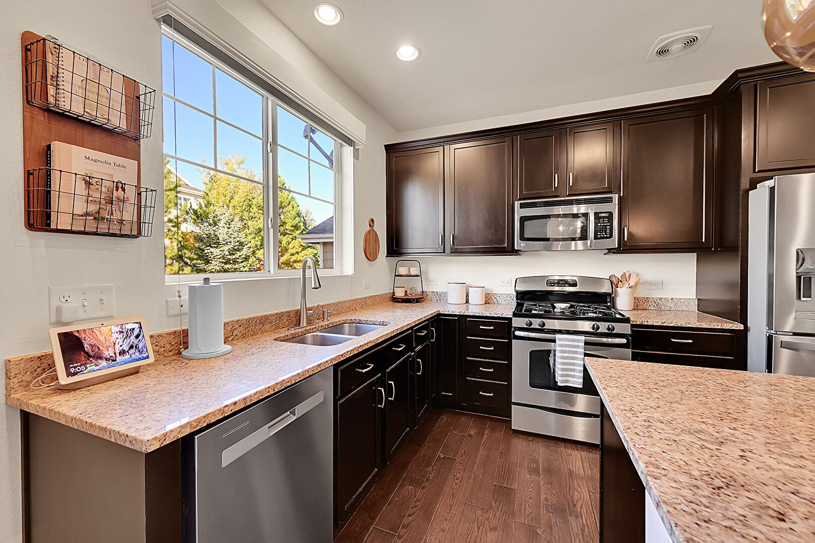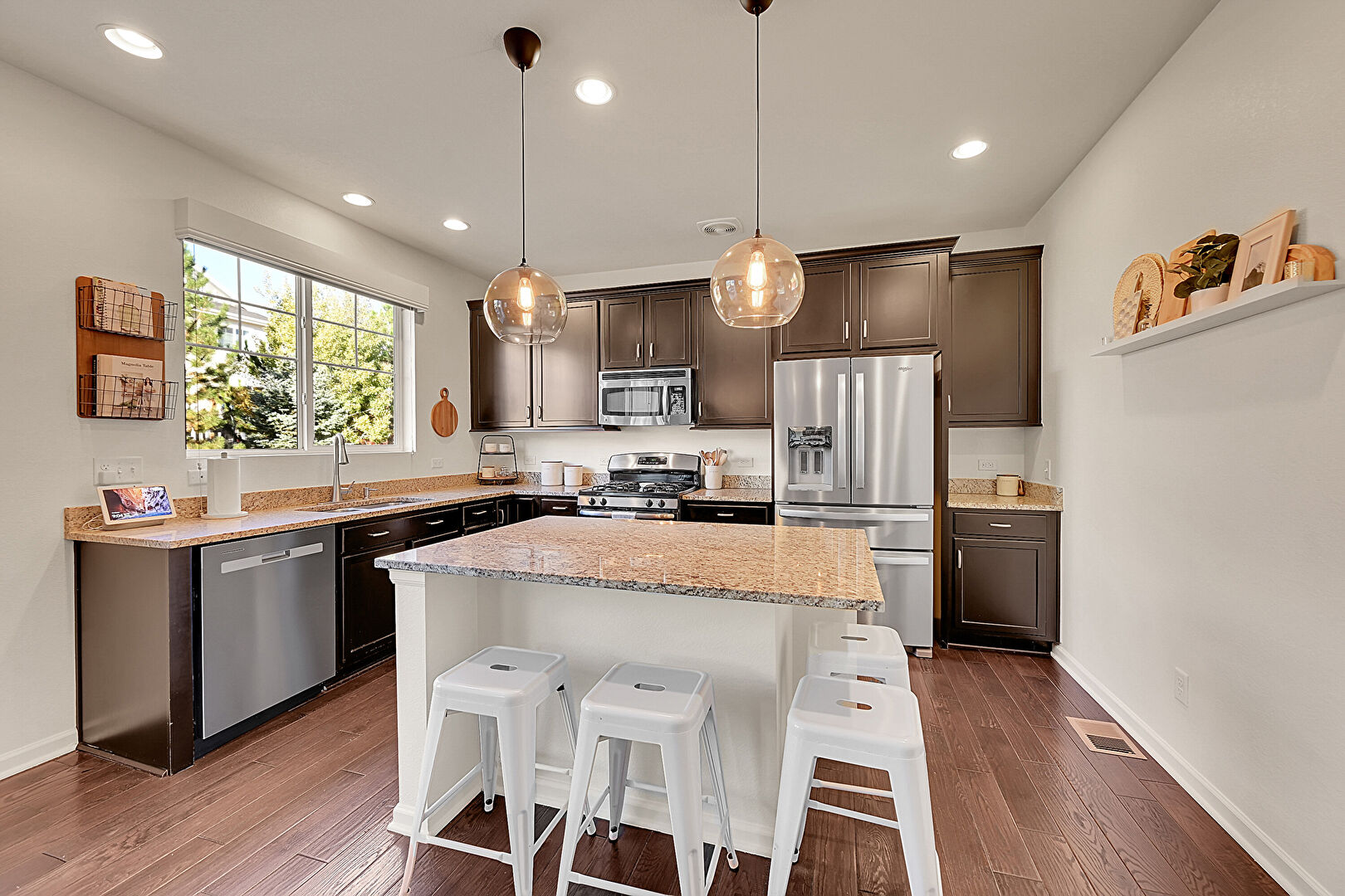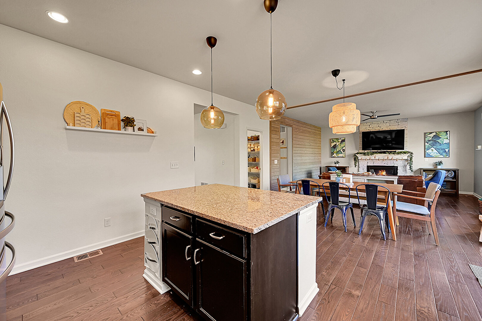 Baseboards Wall, Crown Molding Cabinets, Dark Brown Cabinets, Drywall, Fireplace, Kitchen Bar, Kitchen Island, L Shaped Kitchen, Natural Light, Pendant Lighting, Recessed Lighting, Shaker Cabinets, Stone Countertops, Vent, Wood Finish Floor, Baseboards Wall, Drywall, Opens To Living Area, Pendant Lighting, Shaker Cabinets