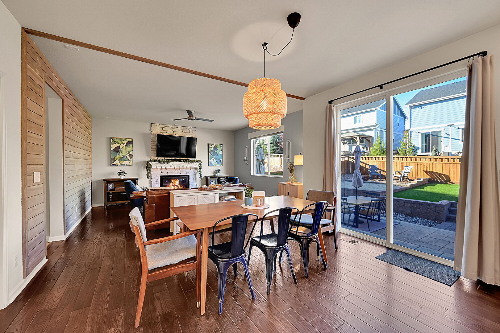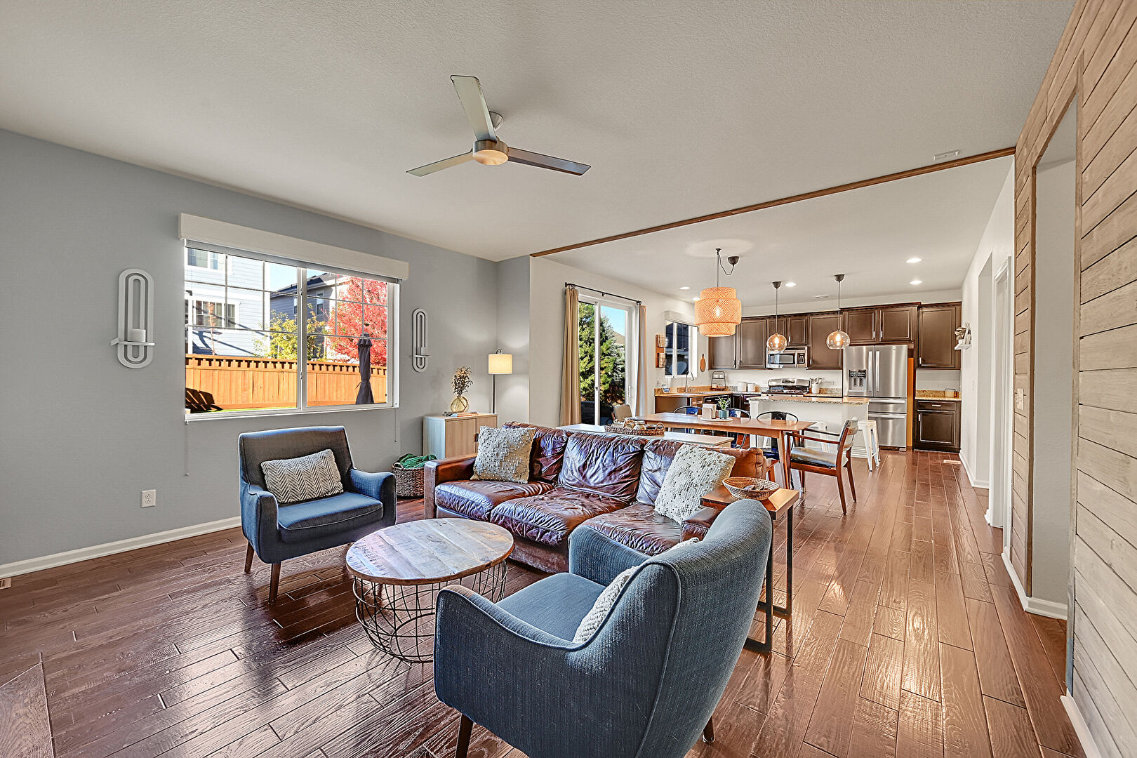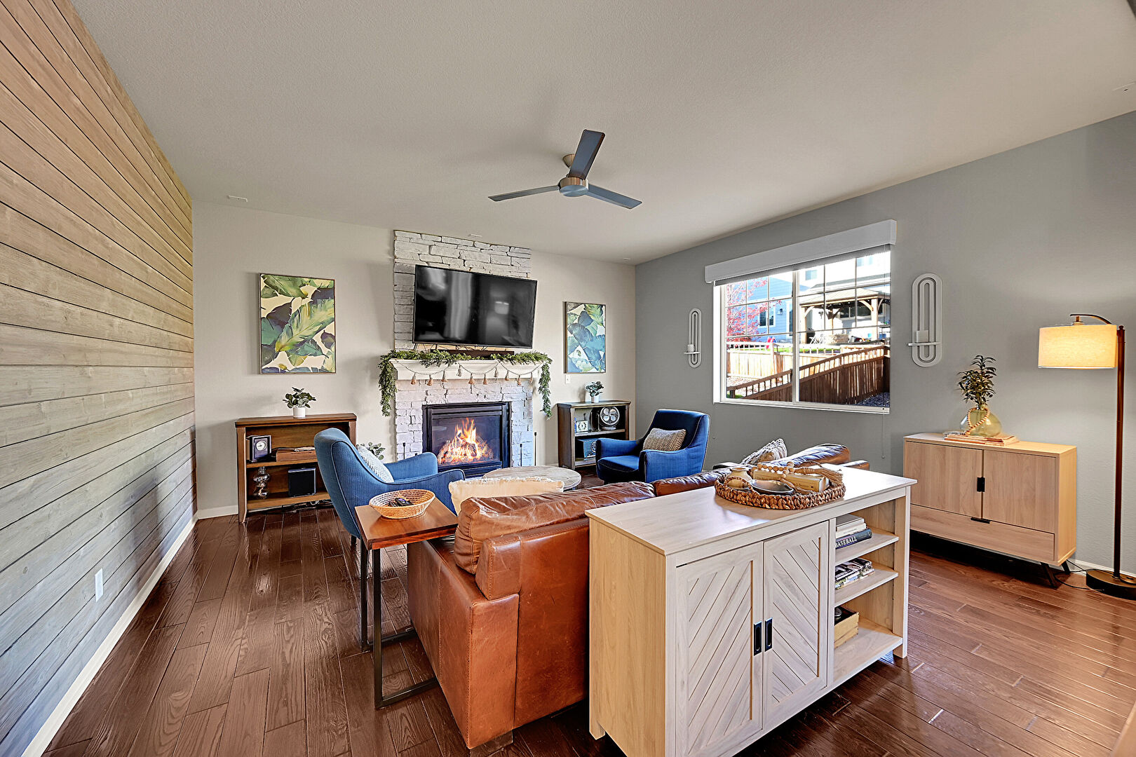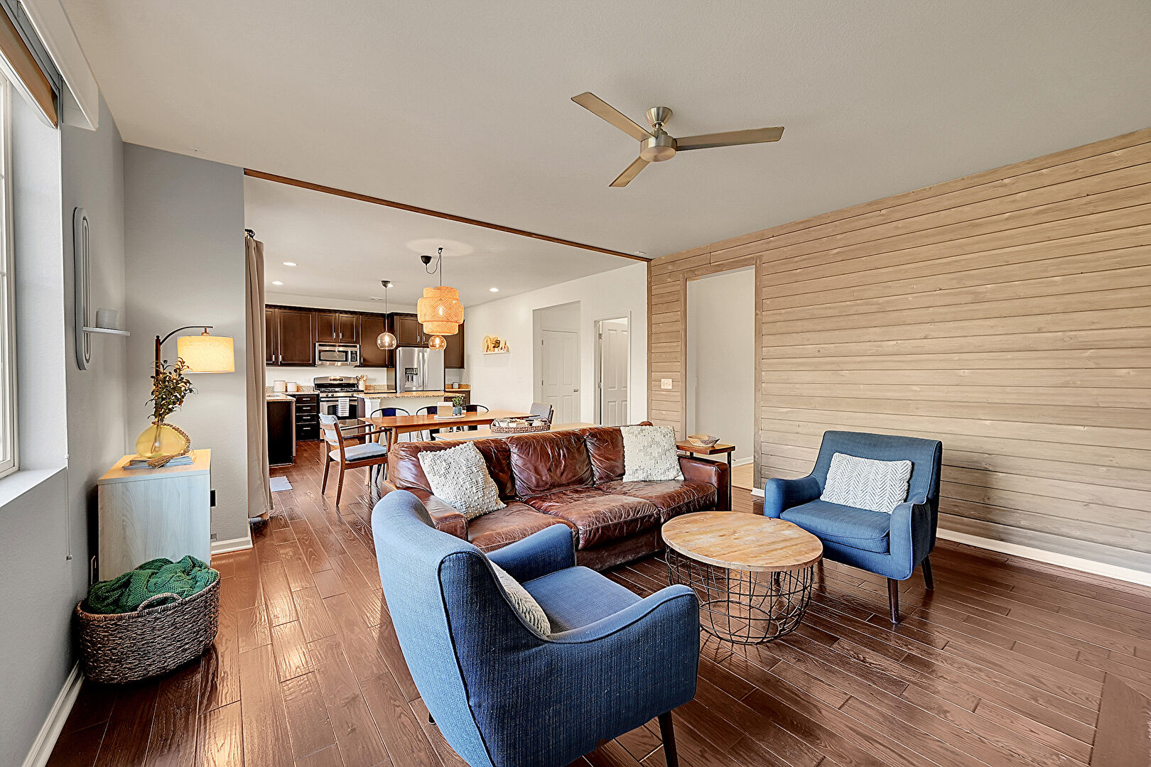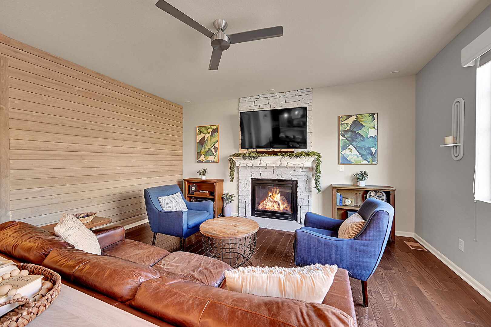 Baseboards Wall, Ceiling Fan, Drywall, Fireplace, L Shaped Kitchen, Natural Light, Recessed Lighting, Vent, Wood Finish Floor, Wood Wall, Ceiling Fan, Drywall, Wood Finish Floor