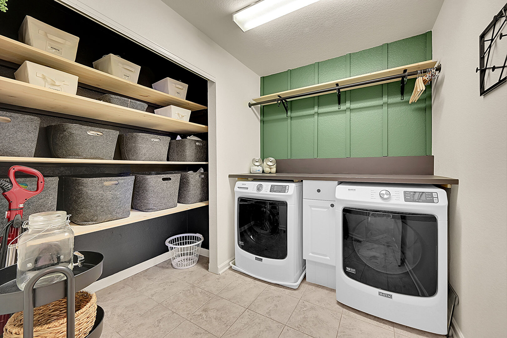Baseboards Wall, Drywall, Textured Ceiling, Tile Floor, Laundry