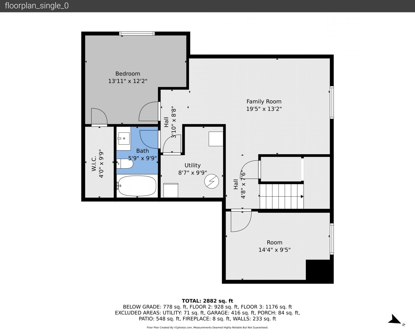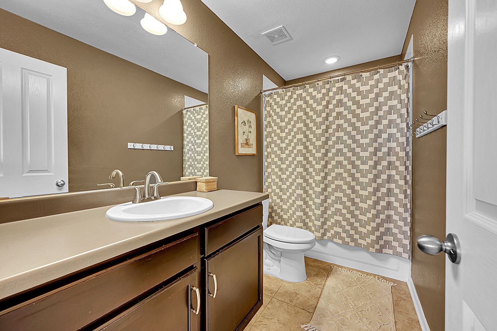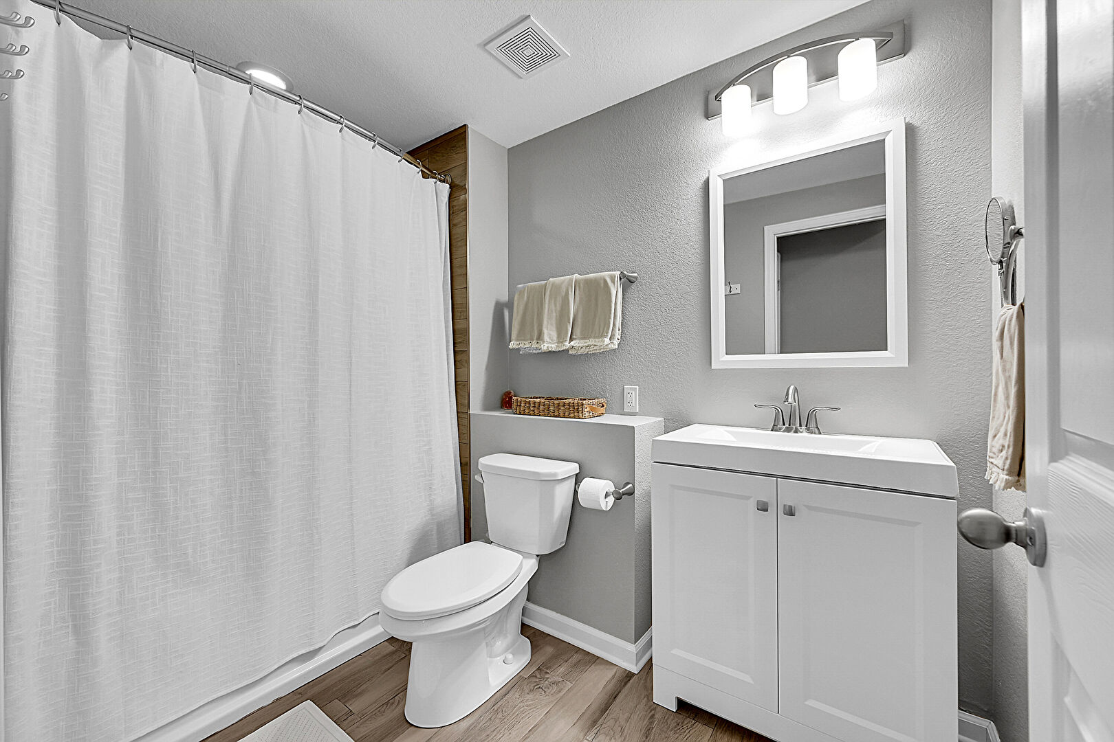 Baseboards Wall, Combined Bath Shower, Full Bathroom, Half Bathroom, Recessed Lighting, Textured Wall, Tile Floor, Vanity, Vent, Wood Finish Floor, Natural Light, Textured Wall, Tile Floor
