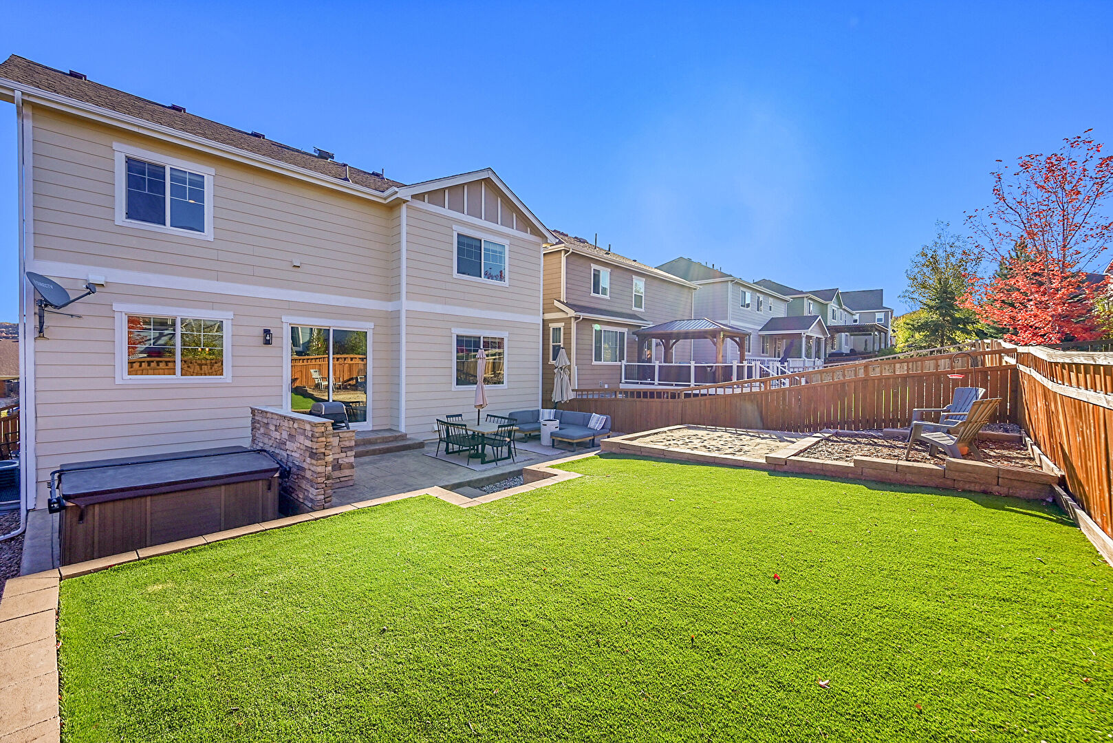 Fence, Fire Pit, Grill, Lawn, Outdoor Dining Area, Outdoor Kitchen, Outdoor Living Space, Patio, Residential View, Satellite Dish, Fence, Hot Tub, Lawn, Patio