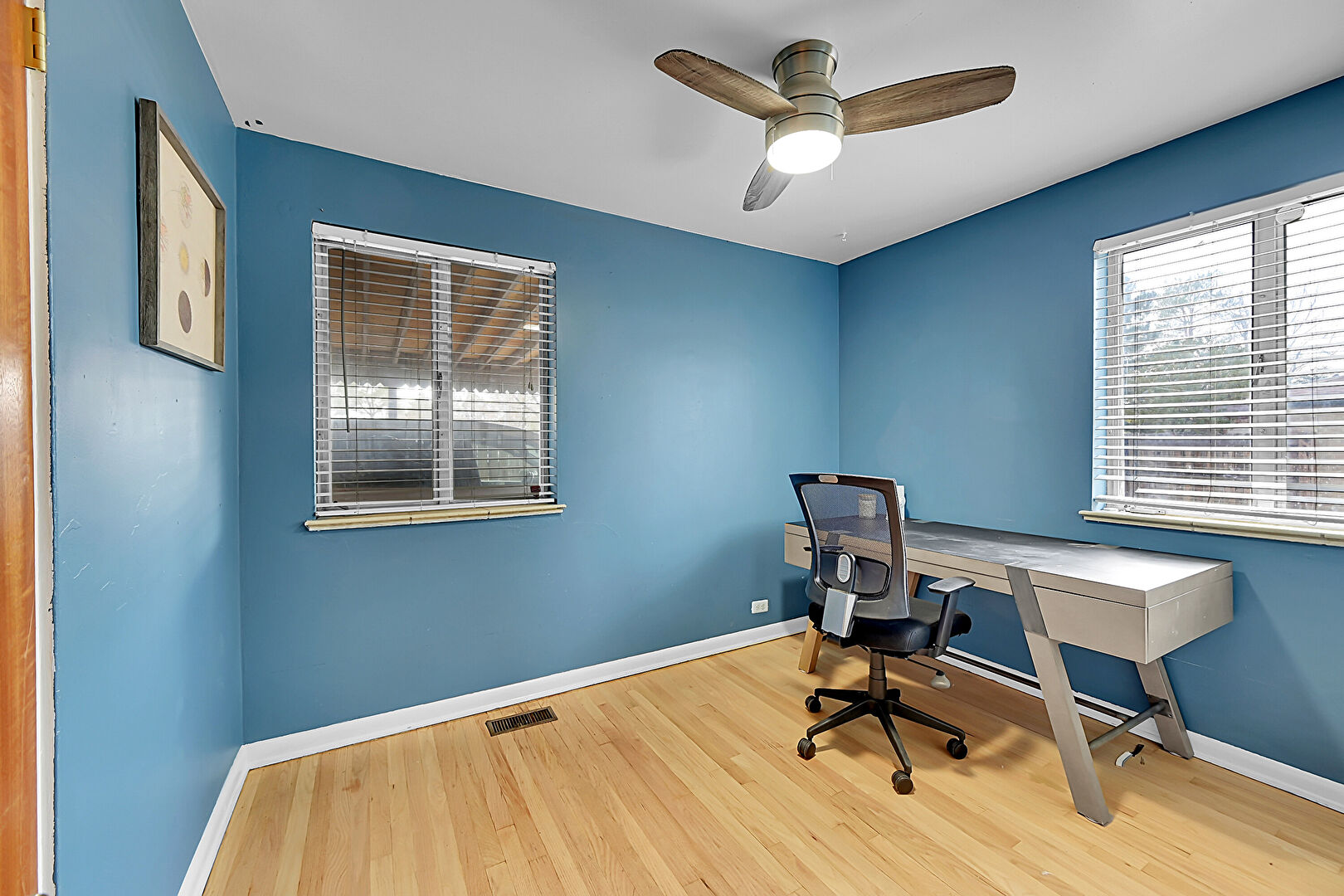 Baseboards Wall, Ceiling Fan, Natural Light, Office Area, Vent, Wood Finish Floor, Drywall
