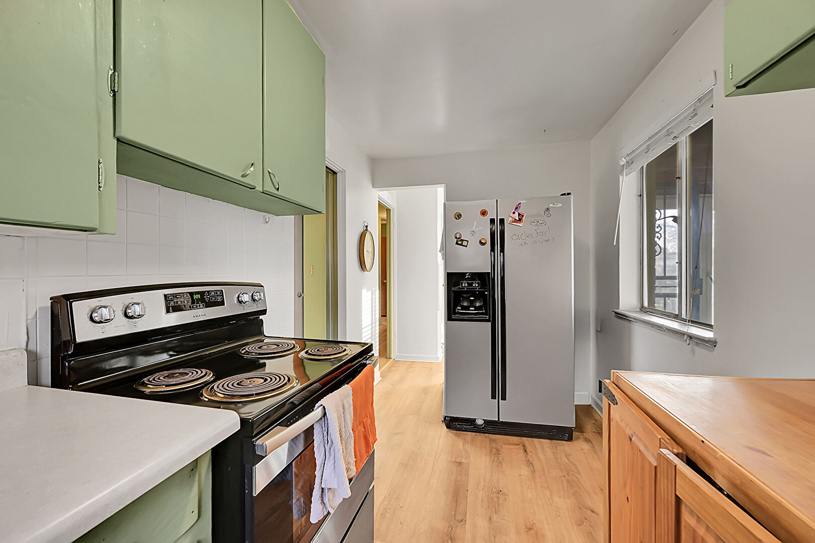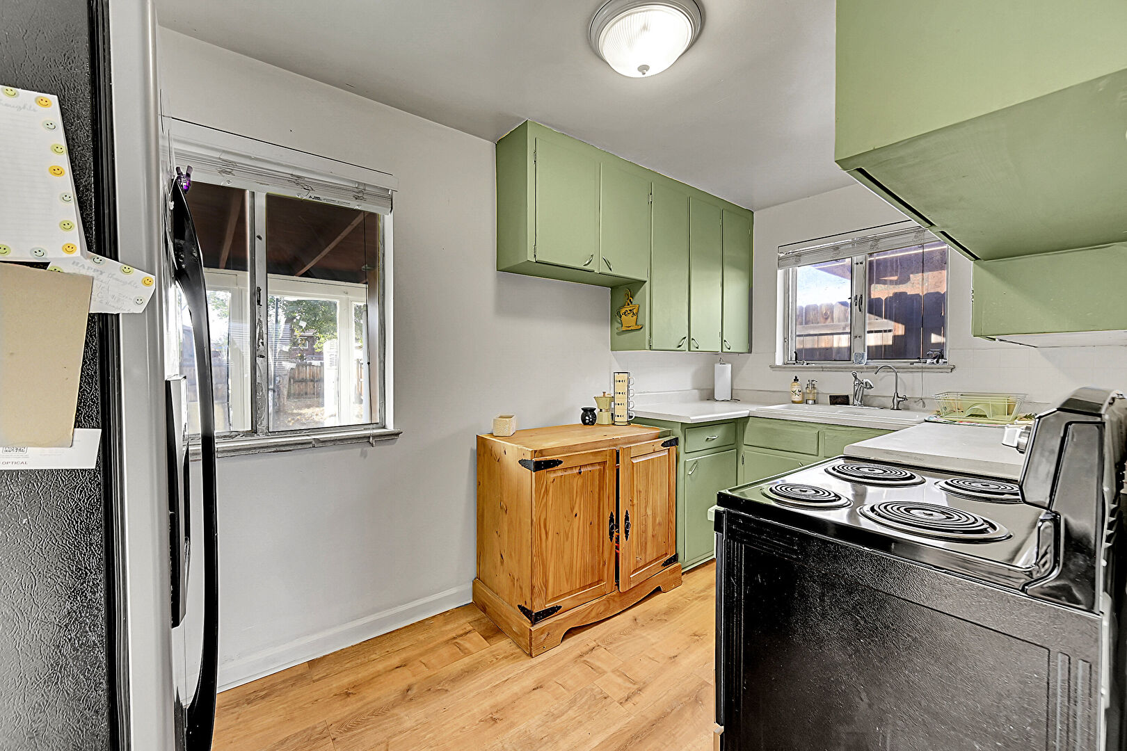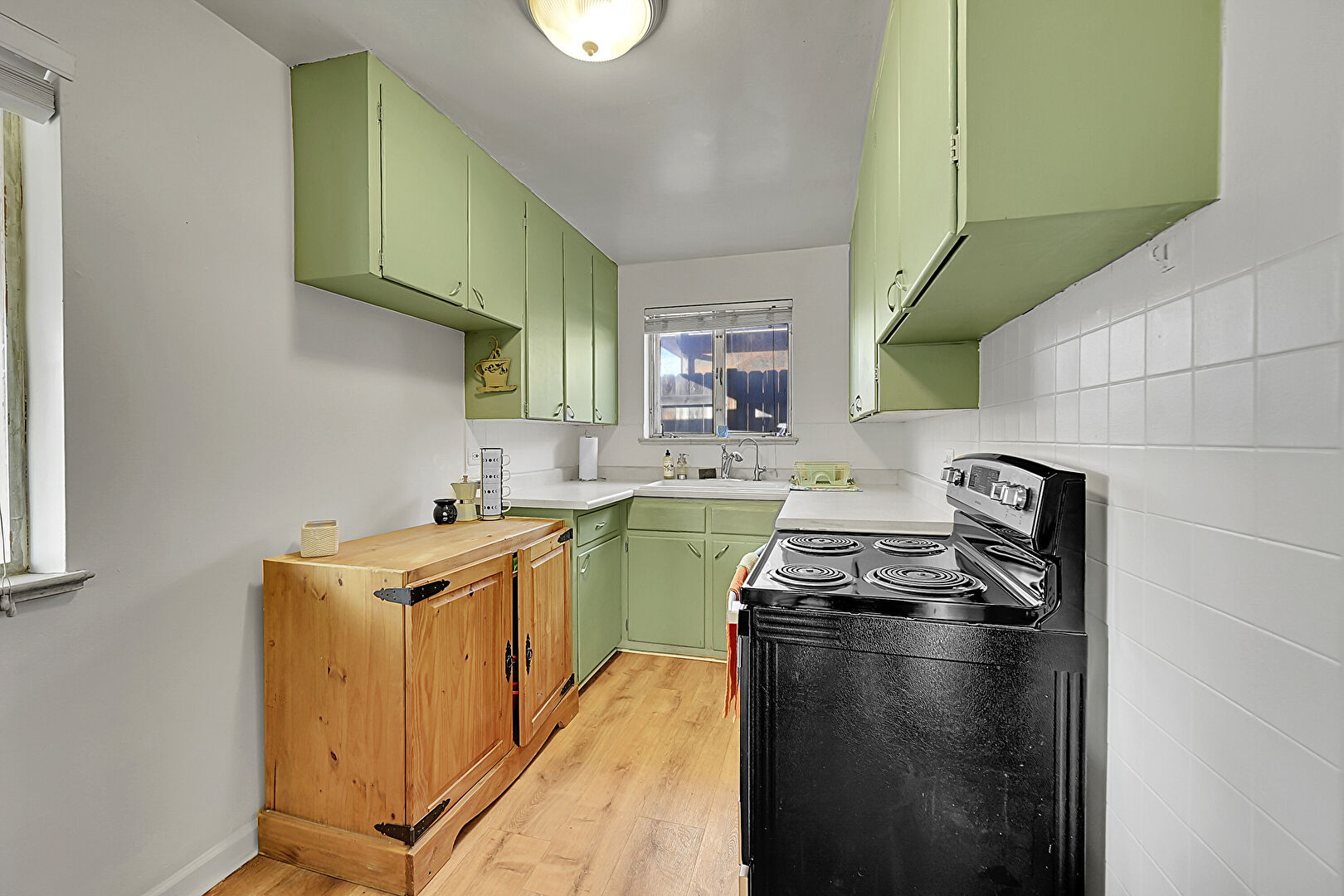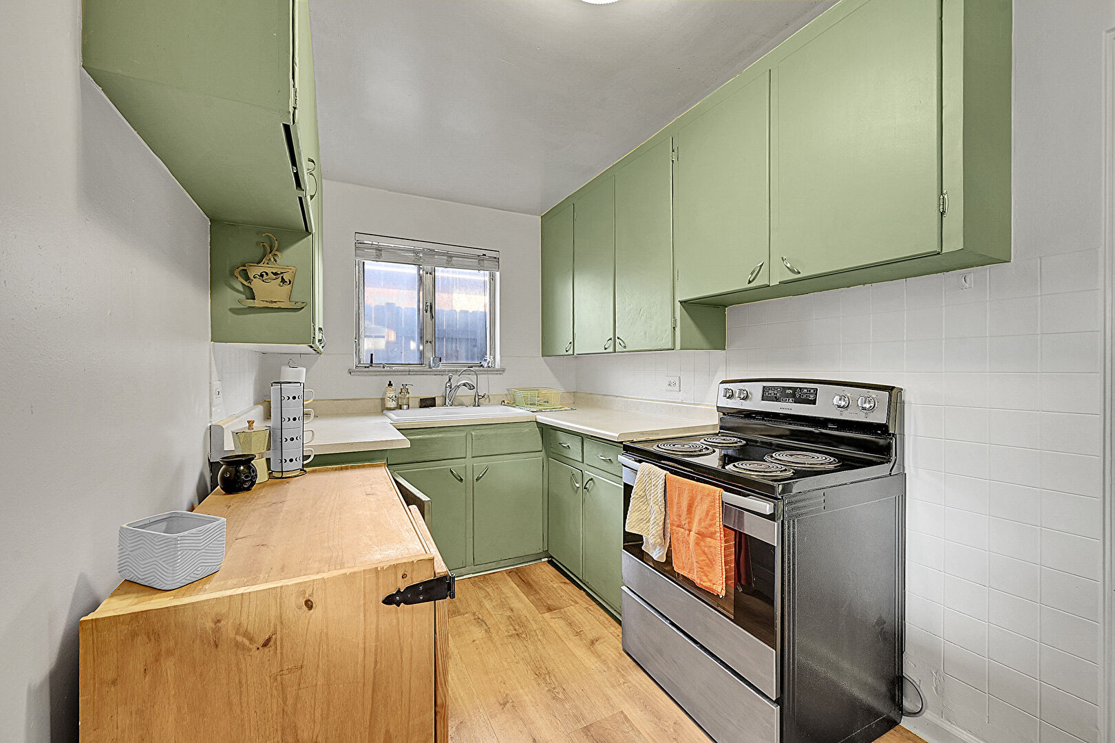 Baseboards Wall, Butcher Block Countertops, Drywall, Green Cabinets, Natural Light, Visible Hinge Cabinets, Wood Finish Floor, Baseboards Wall, Visible Hinge Cabinets, Wood Finish Floor