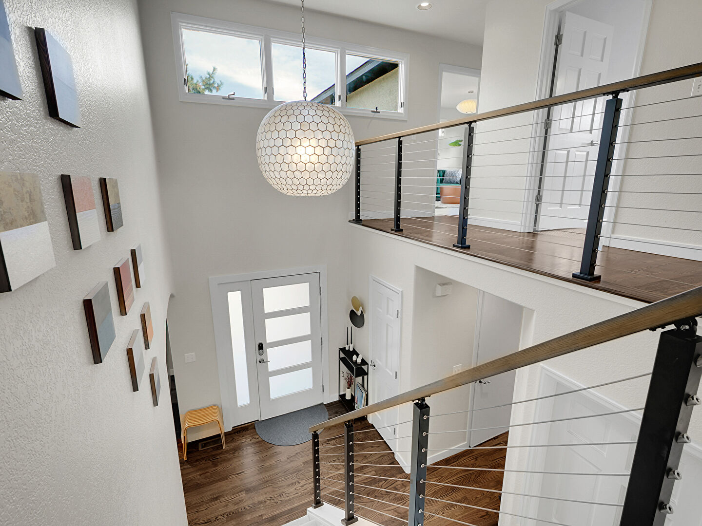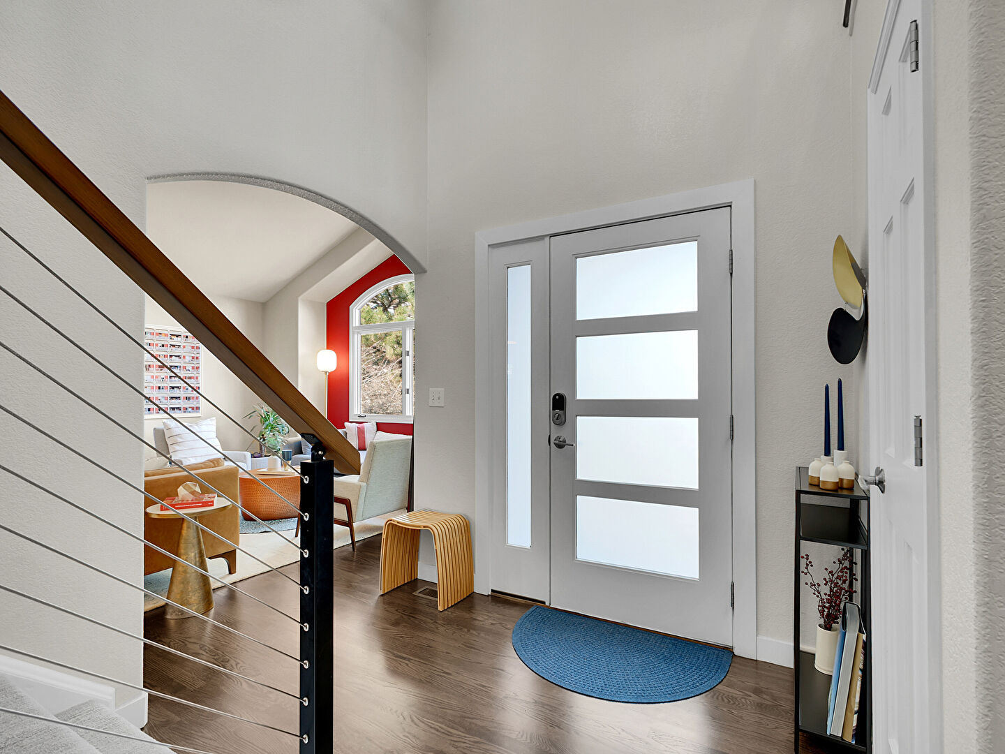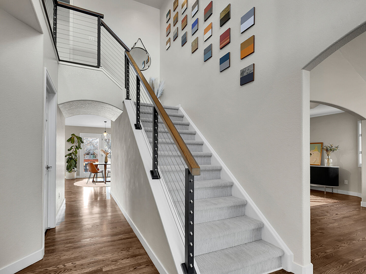 Arched Walkways, Baseboards Wall, Drywall, High Ceiling, Natural Light, Notable Chandelier, Recessed Lighting, Stairs, Vent, Wood Finish Floor