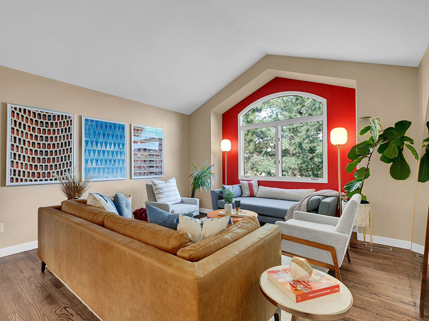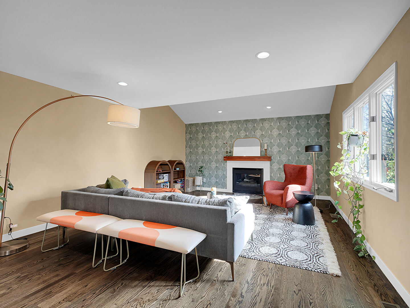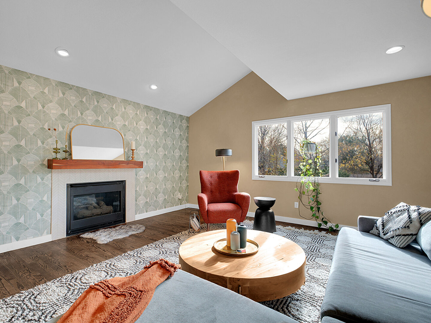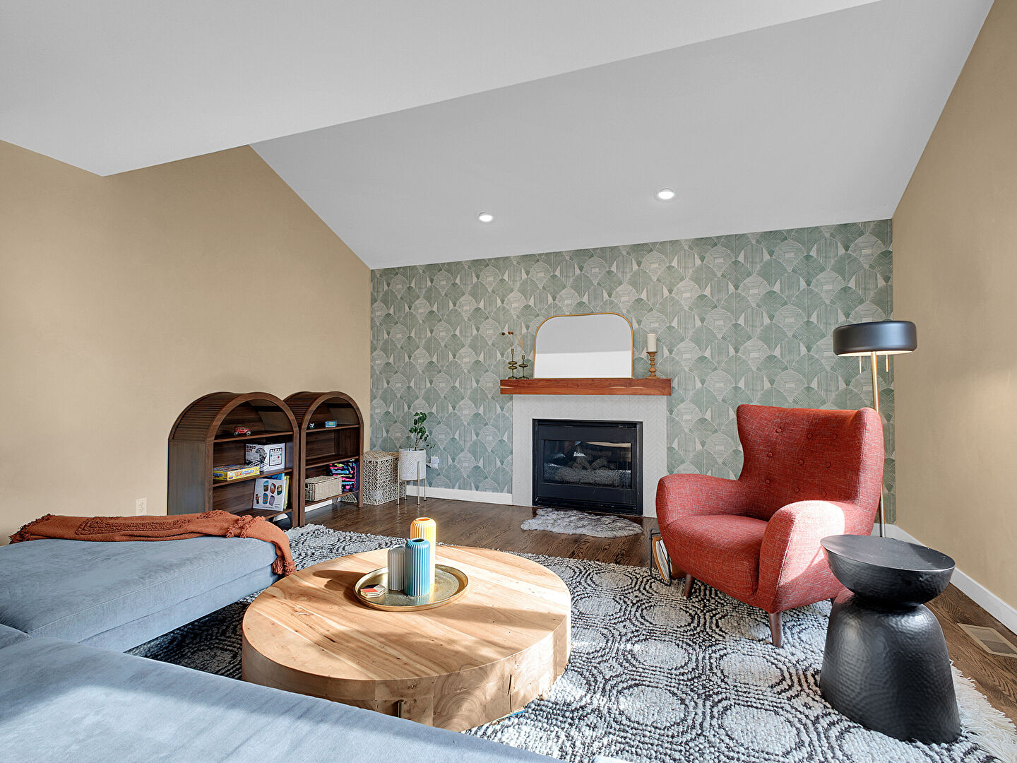 Accent Wall, Arched Walkways, Baseboards Wall, Drywall, Fireplace, Natural Light, Recessed Lighting, Vaulted Ceiling, Vent, Wallpaper Wall, Wood Finish Floor, Accent Wall, Cathedral Ceiling, Natural Light, Recessed Lighting, Wood Finish Floor