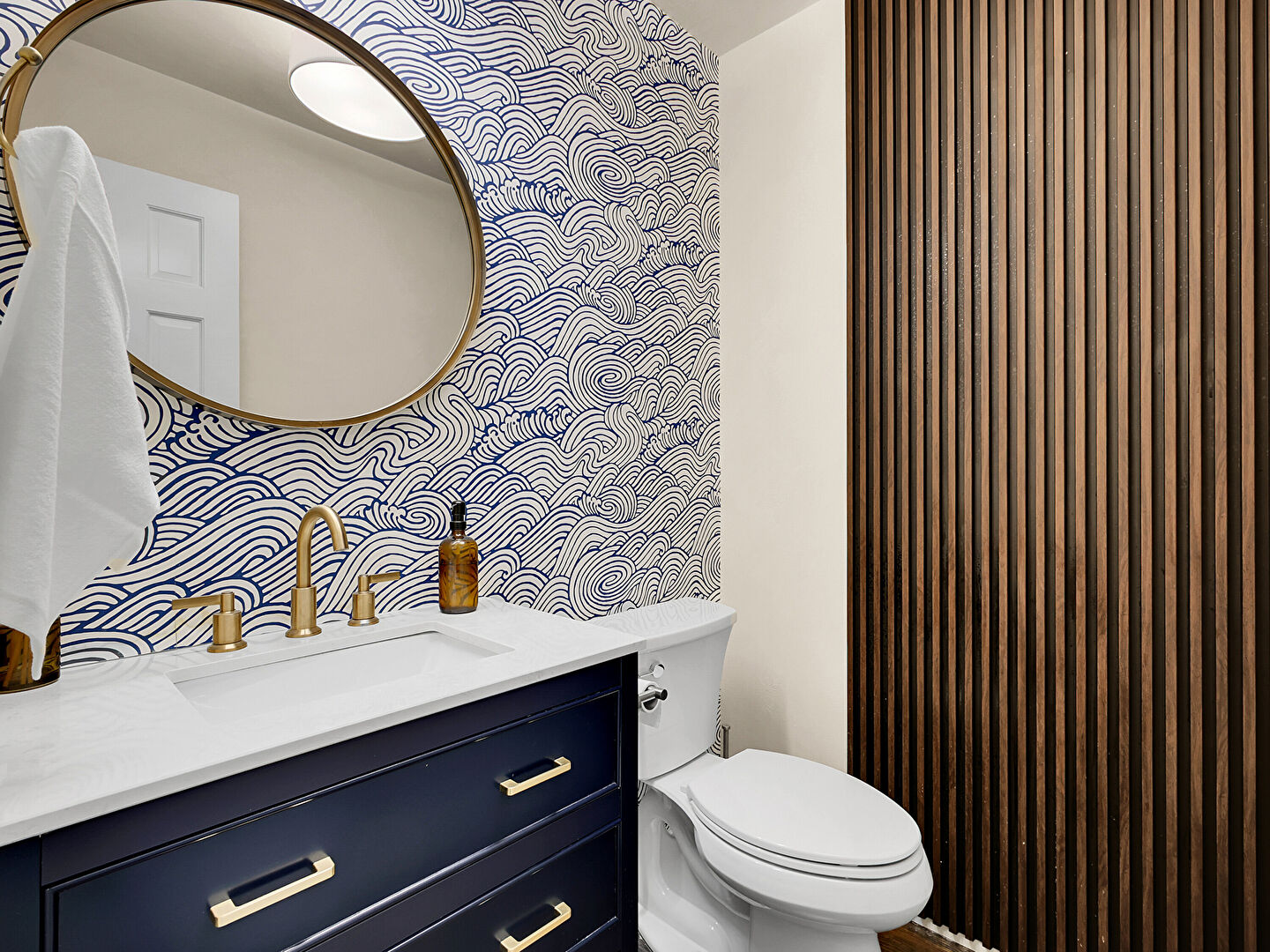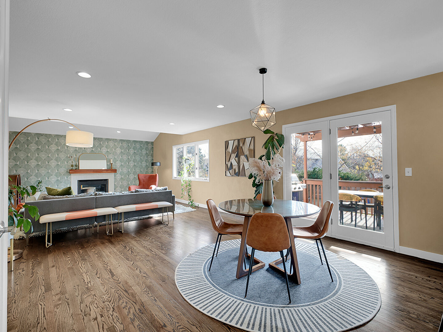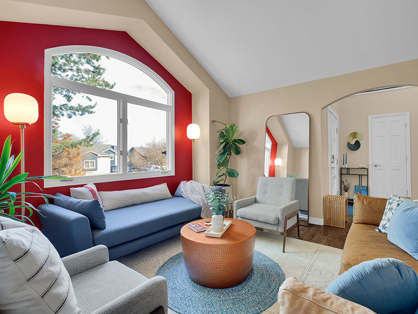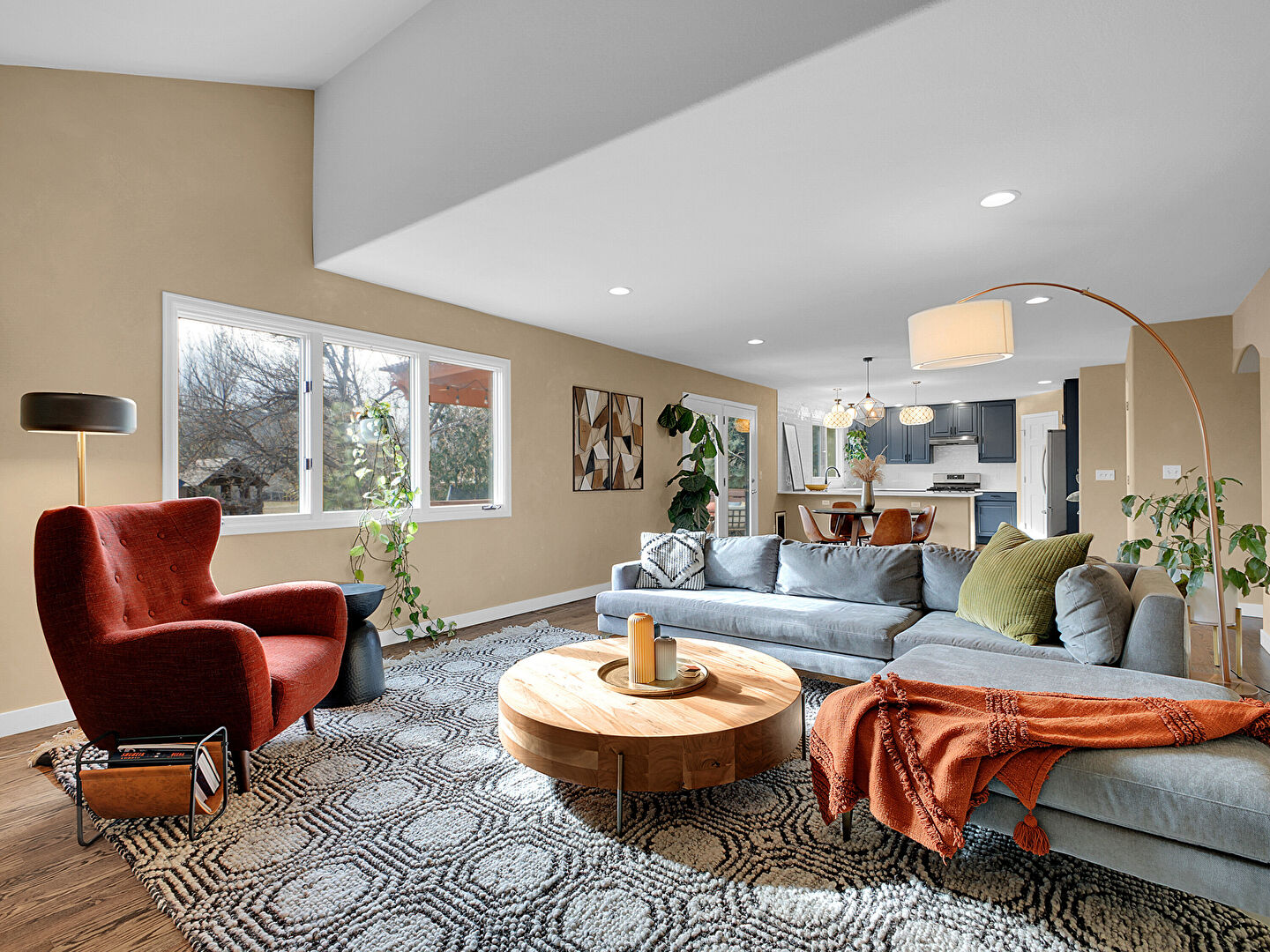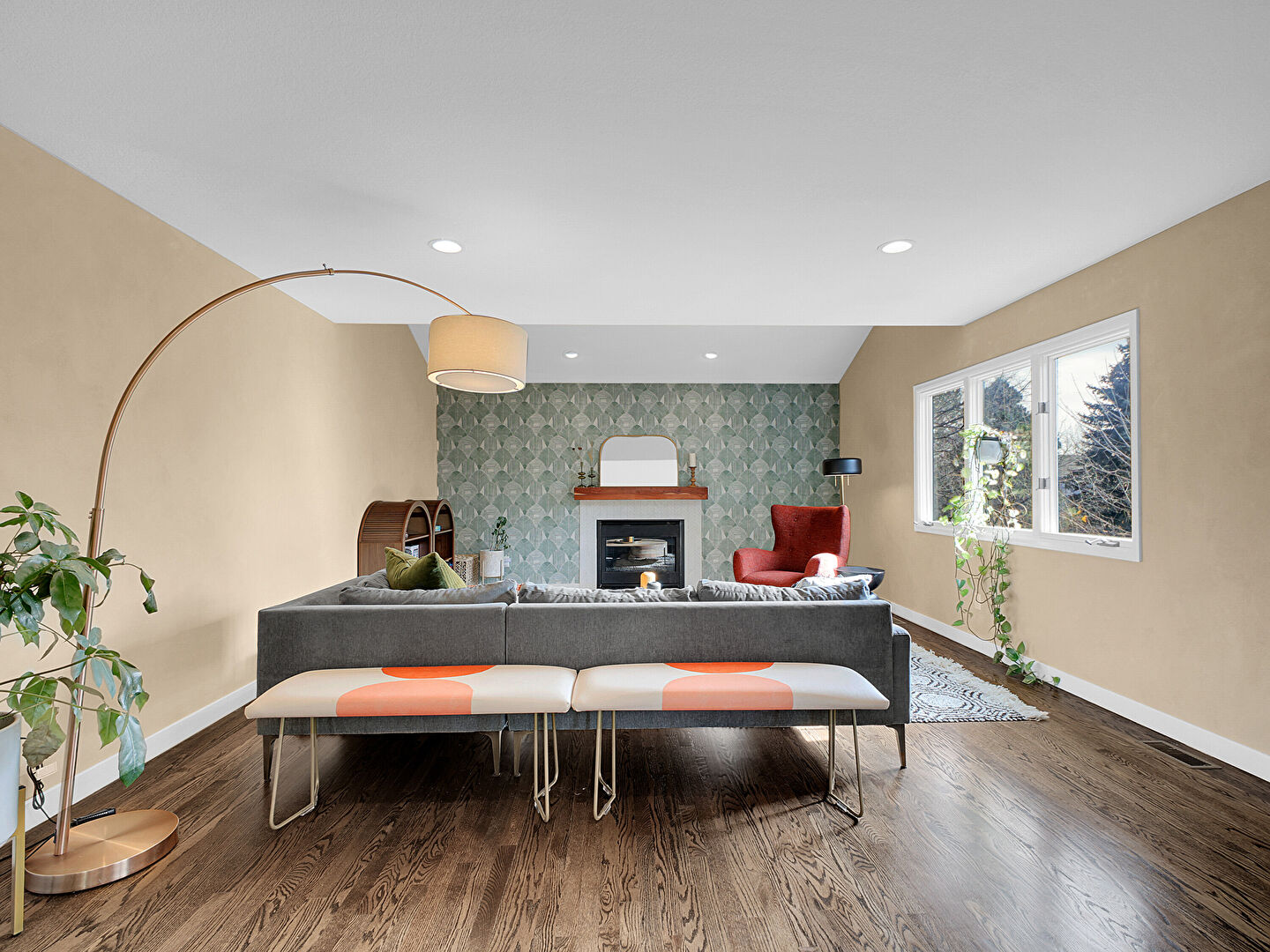 Accent Wall, Arched Walkways, Baseboards Wall, Drywall, Fireplace, Natural Light, Recessed Lighting, Vaulted Ceiling, Vent, Wallpaper Wall, Wood Finish Floor, Accent Wall, Cathedral Ceiling, Natural Light, Recessed Lighting, Wood Finish Floor