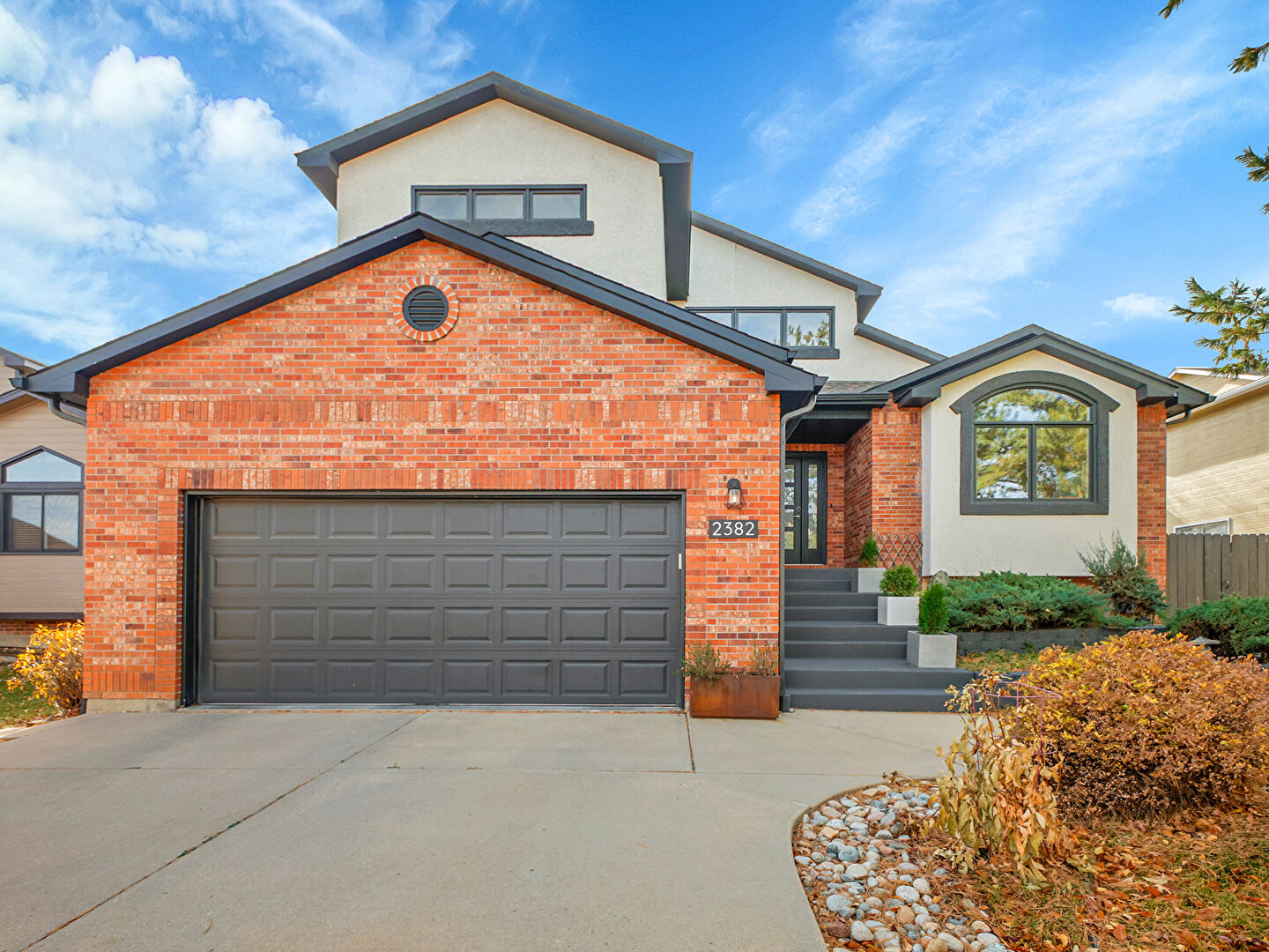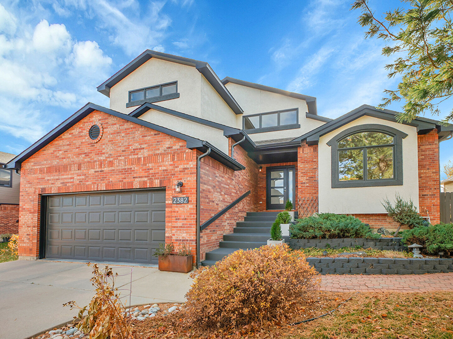Brick Siding, Concrete Foundation, Downspout, Driveway, Fence, Gutters, Stoop, Stucco Siding, Fence, Gutters, Stucco Siding